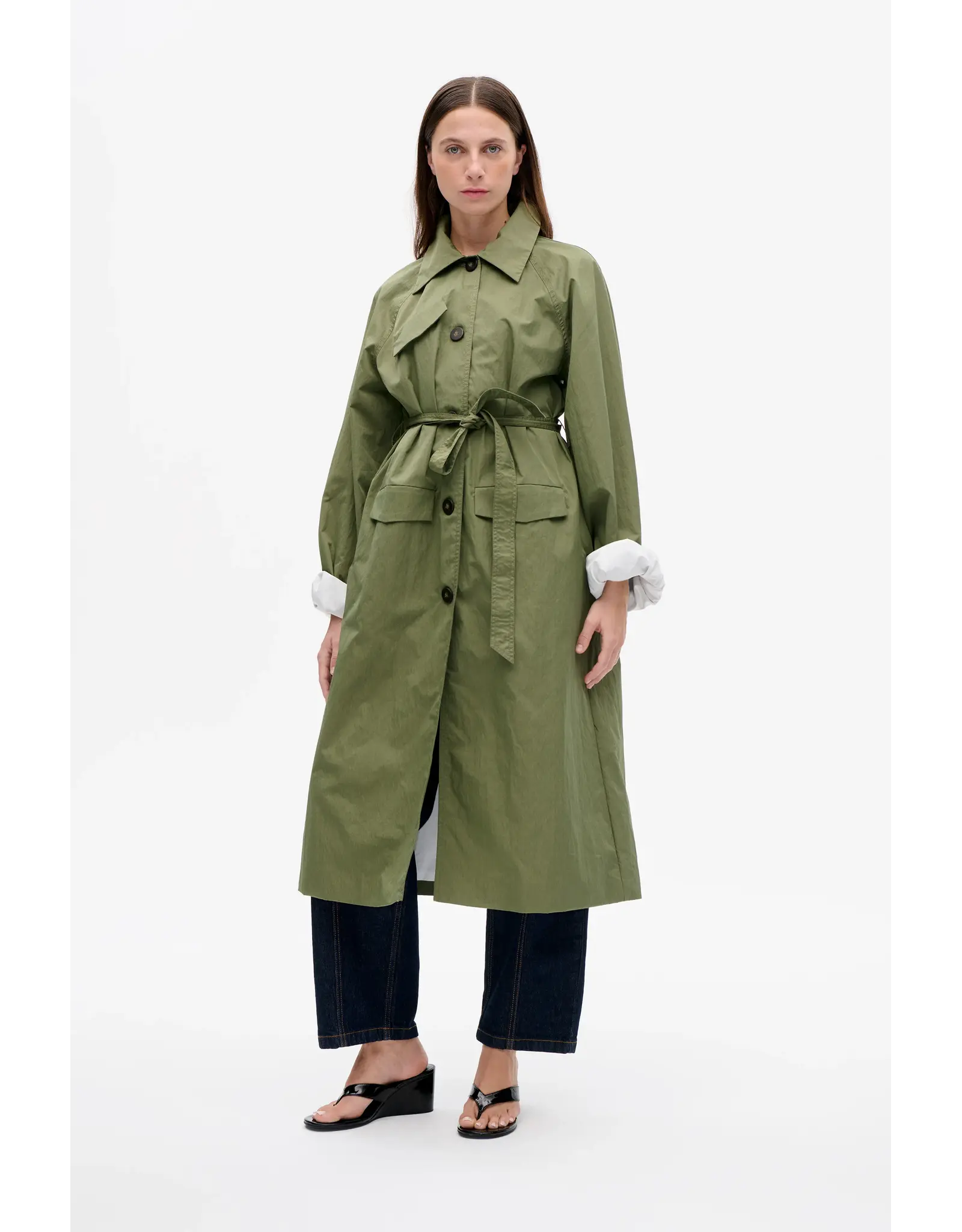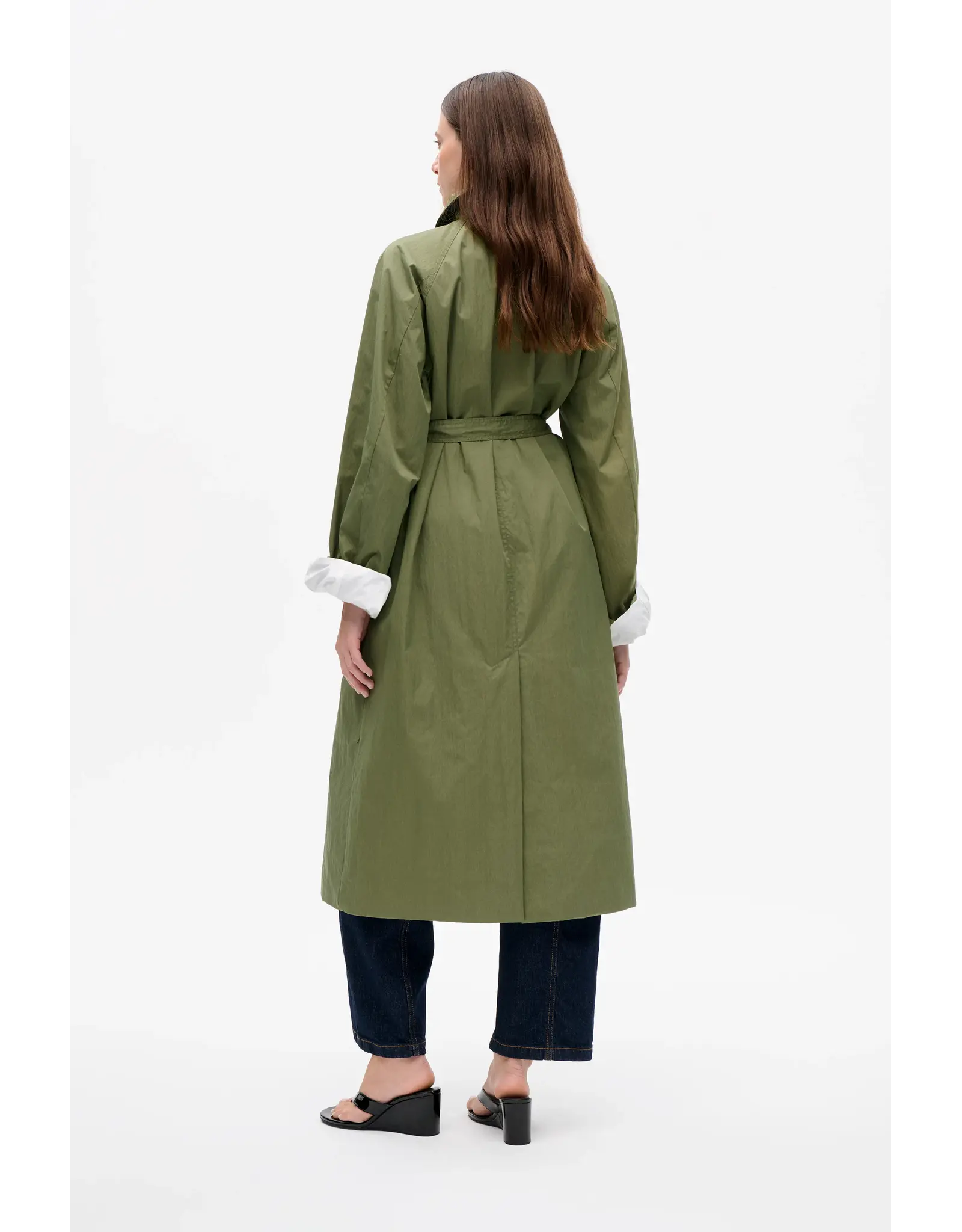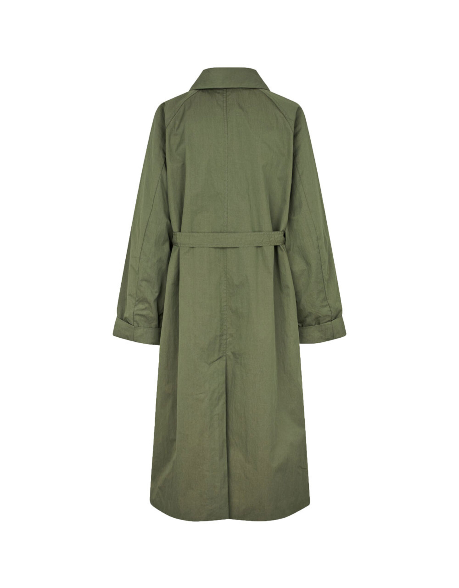 The Dortea Jacket is made in a cotton blend. The trench has an oversized fit with a removable belt at the waist for versatile styling. The extra-long sleeves can be folded, the jacket has a collar, side pockets and back vent. '