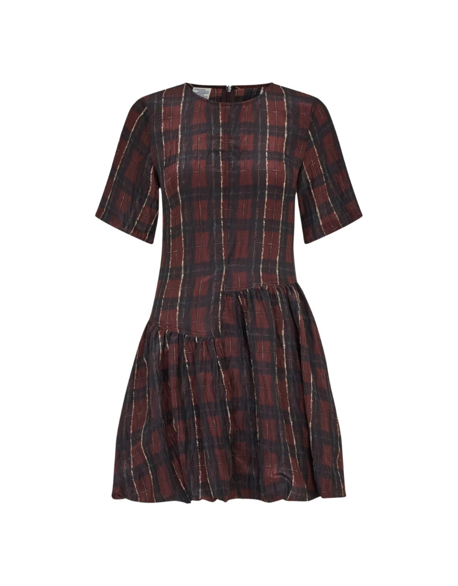 De Astrid-jurk is een speels en nonchalant item met een unieke asymmetrische taille. De jurk met korte mouwen is gemaakt van gekreukte viscose en heeft een relaxte pasvorm met een ballonzoom voor extra volume en beweging.