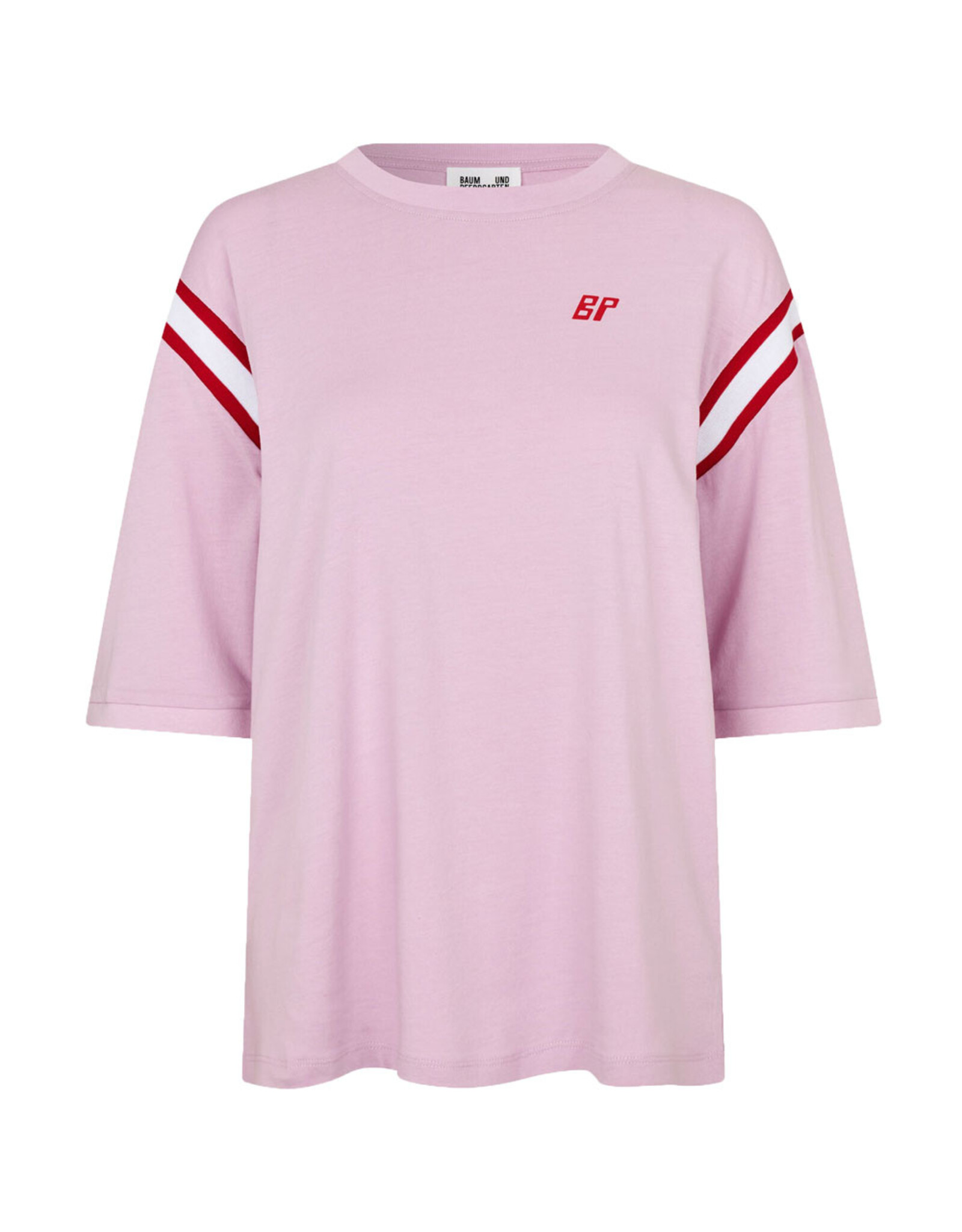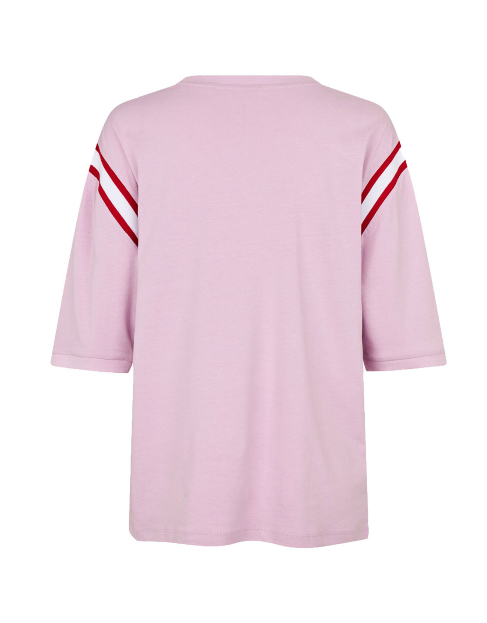 The July T-shirt has a bold front print and striped band at the sleeves. The t-shirt is made in soft organic cotton jersey and has a loose fit with dropped shoulders and a classic crew neck for a comfortable fit.