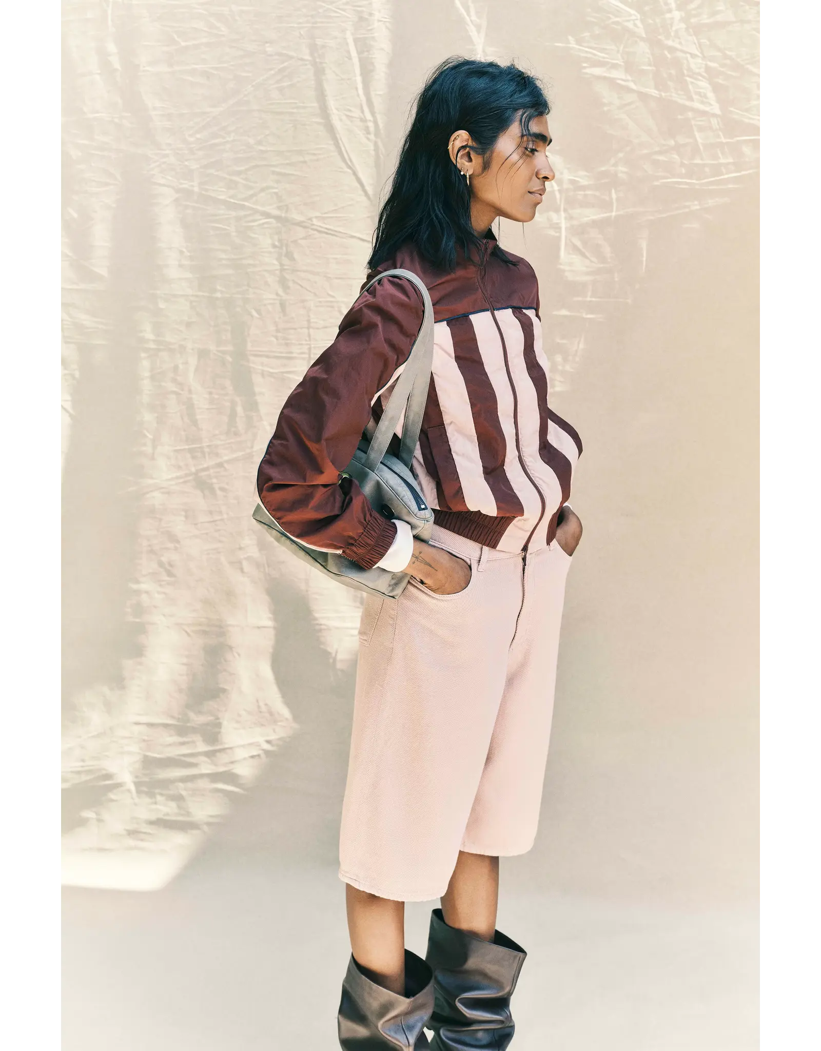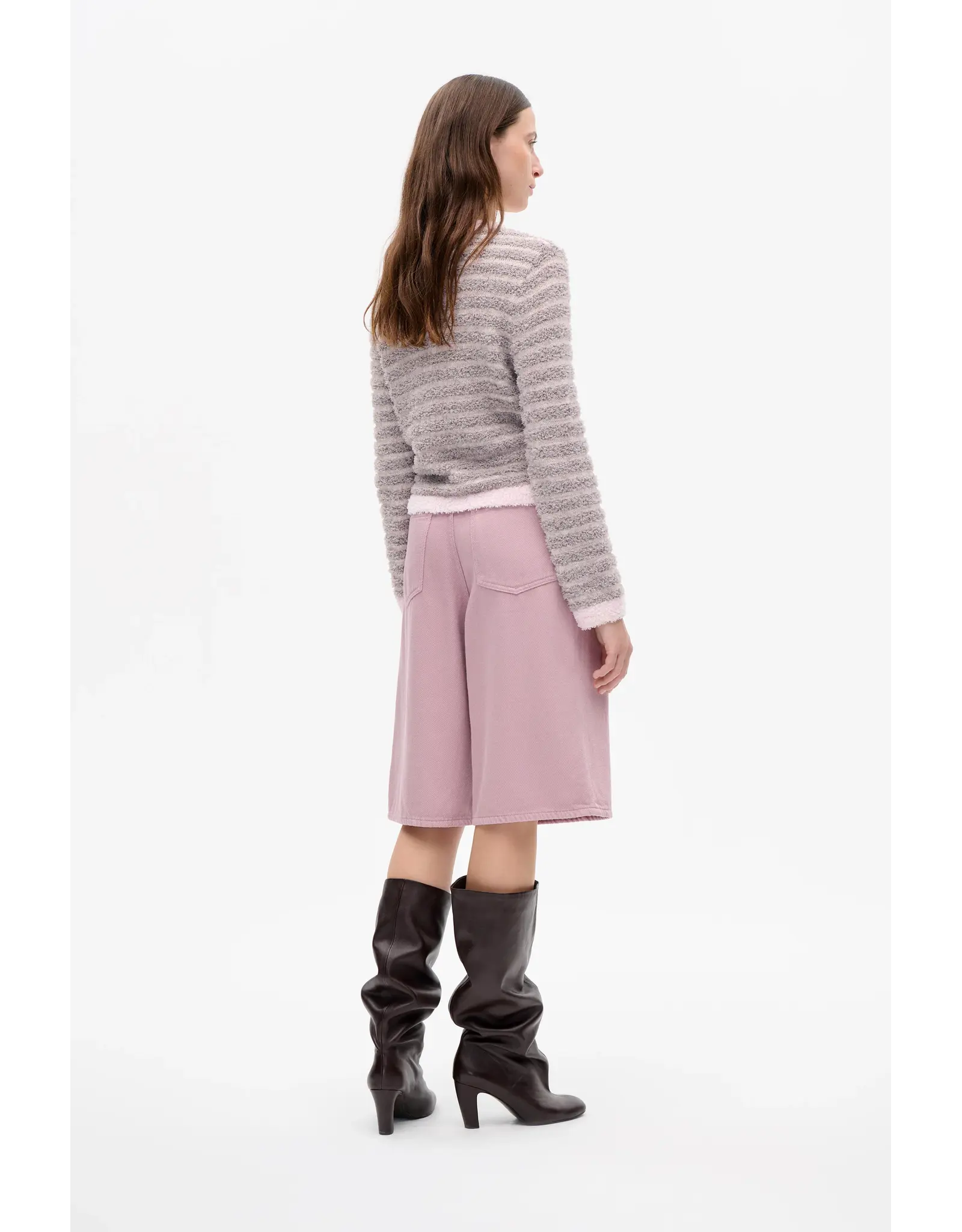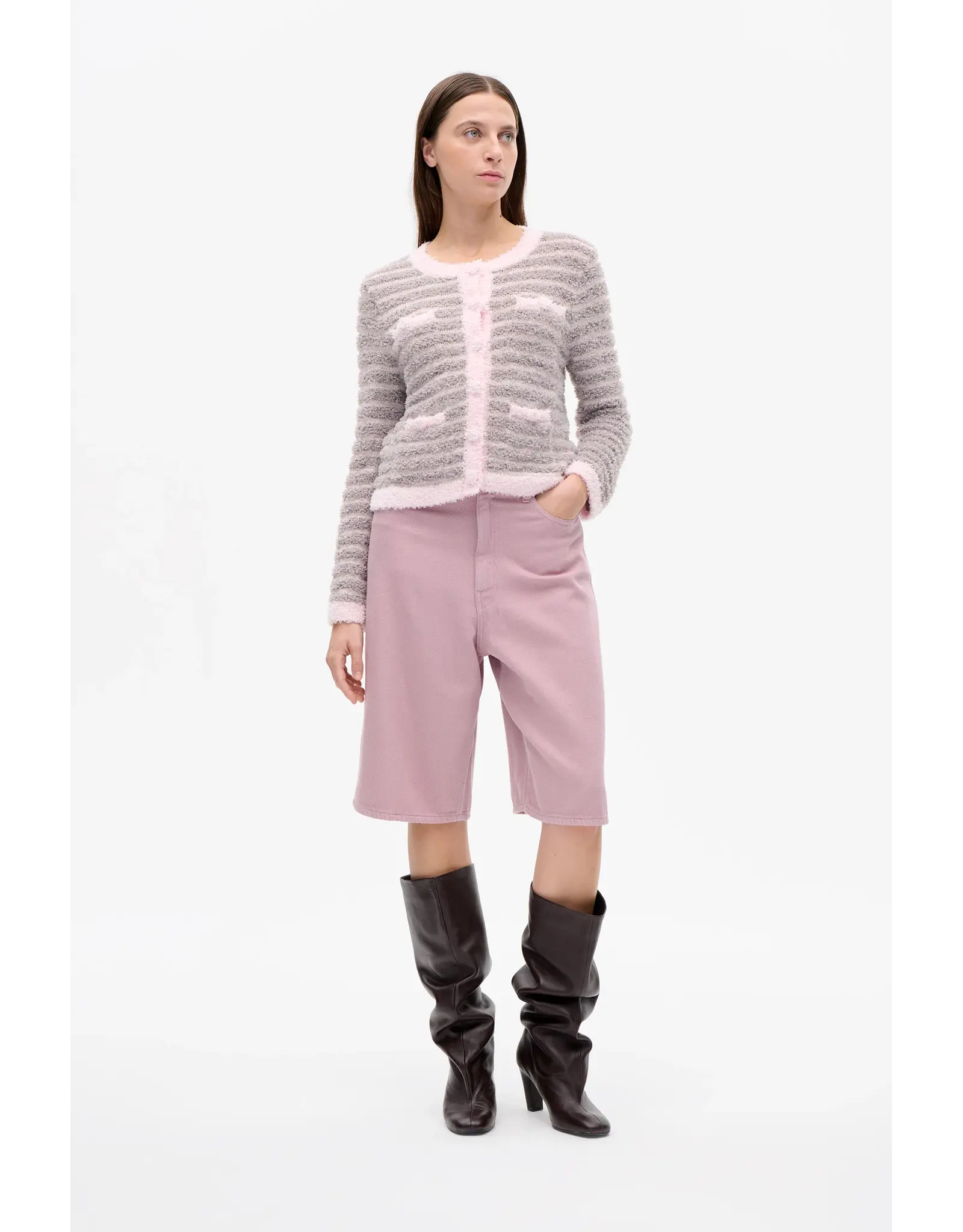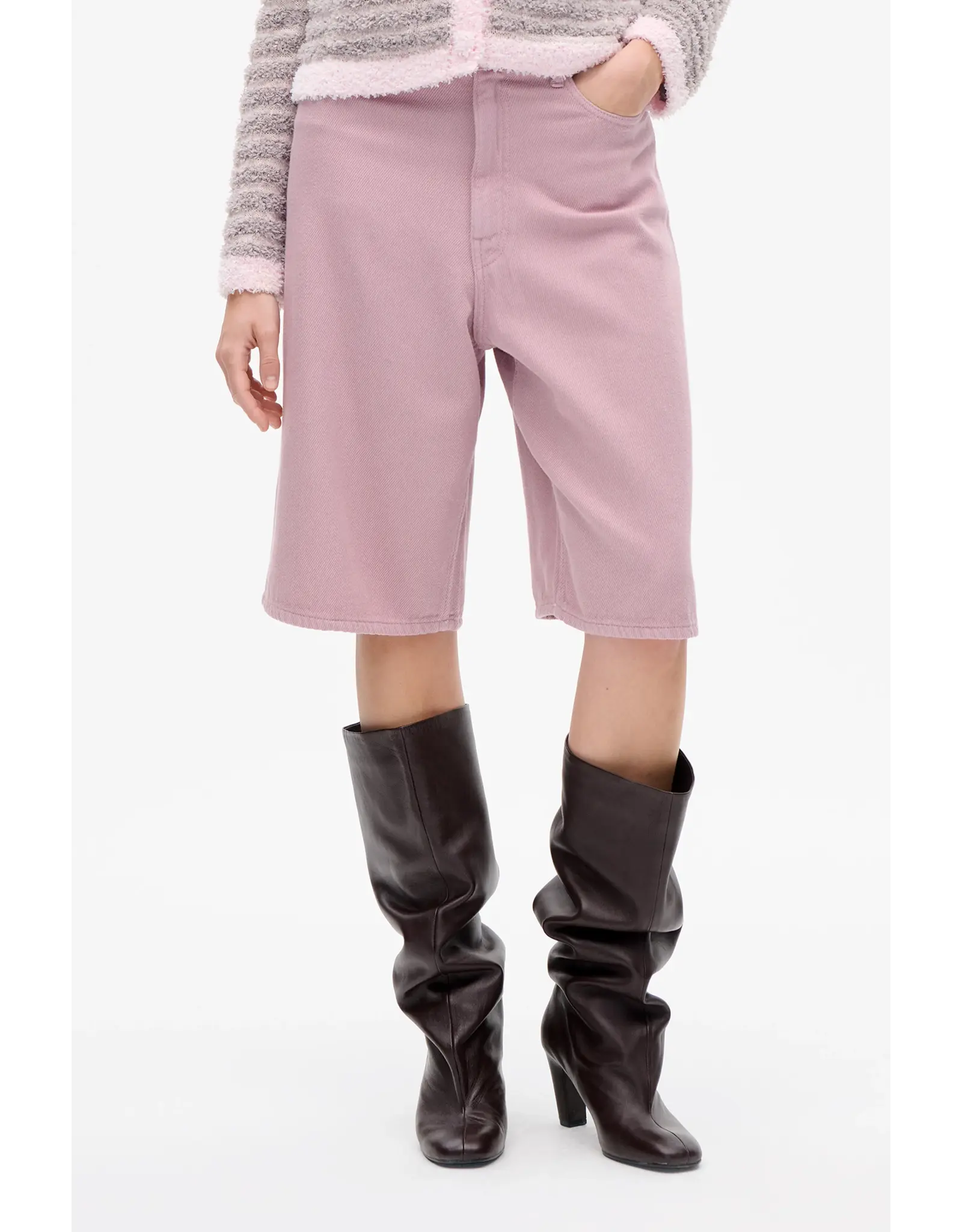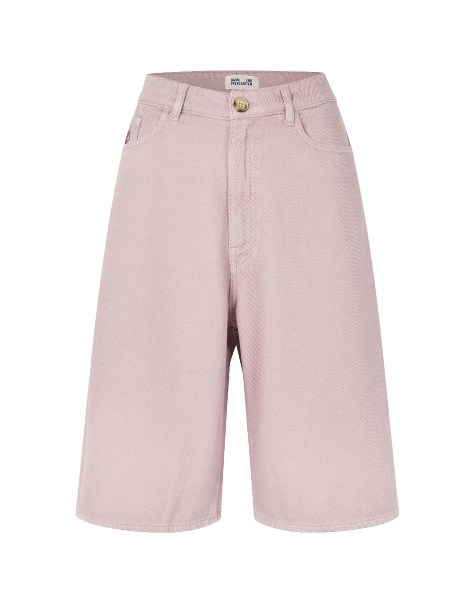 The Niamh Shorts are denim Bermuda-style shorts made in textured organic cotton twill. The soft denim shorts have a high waist and loose fit with an extra detail, the BP logo is embroidered on the coin pocket.