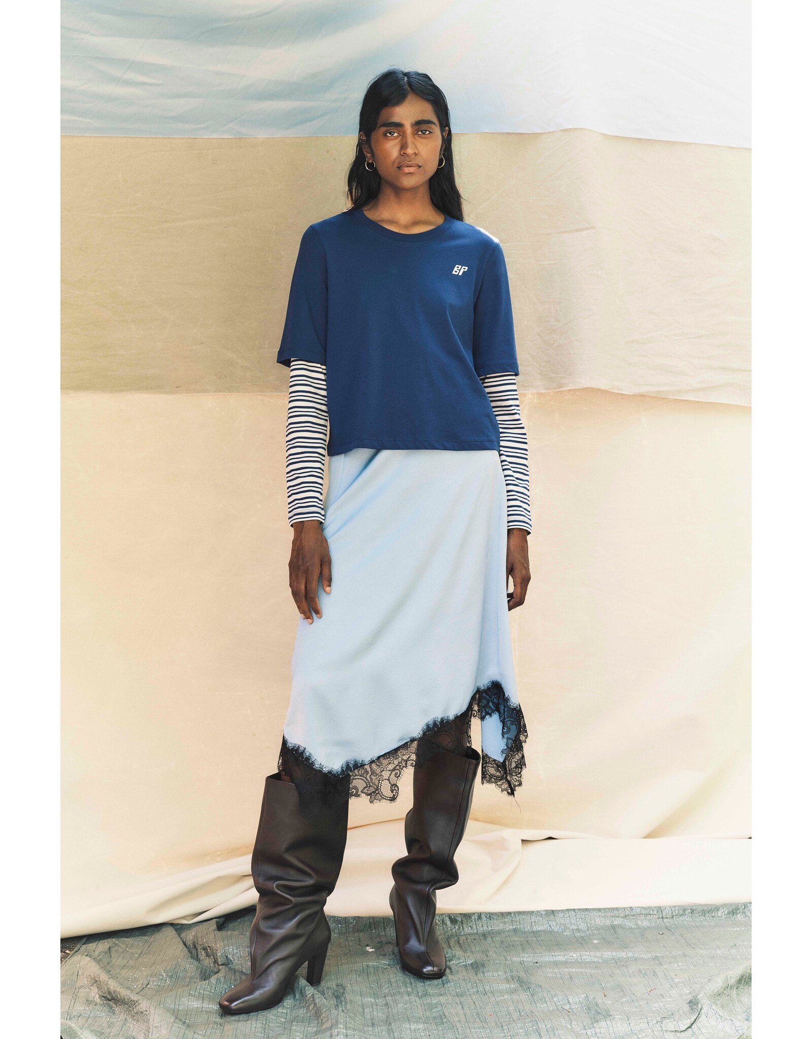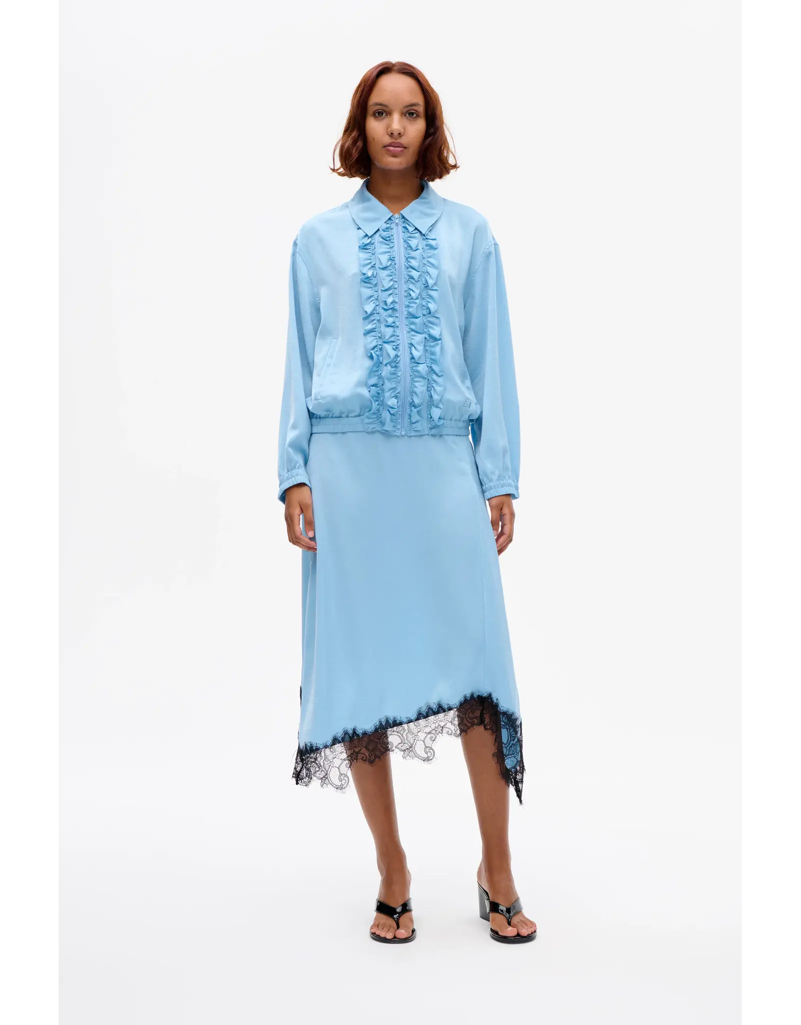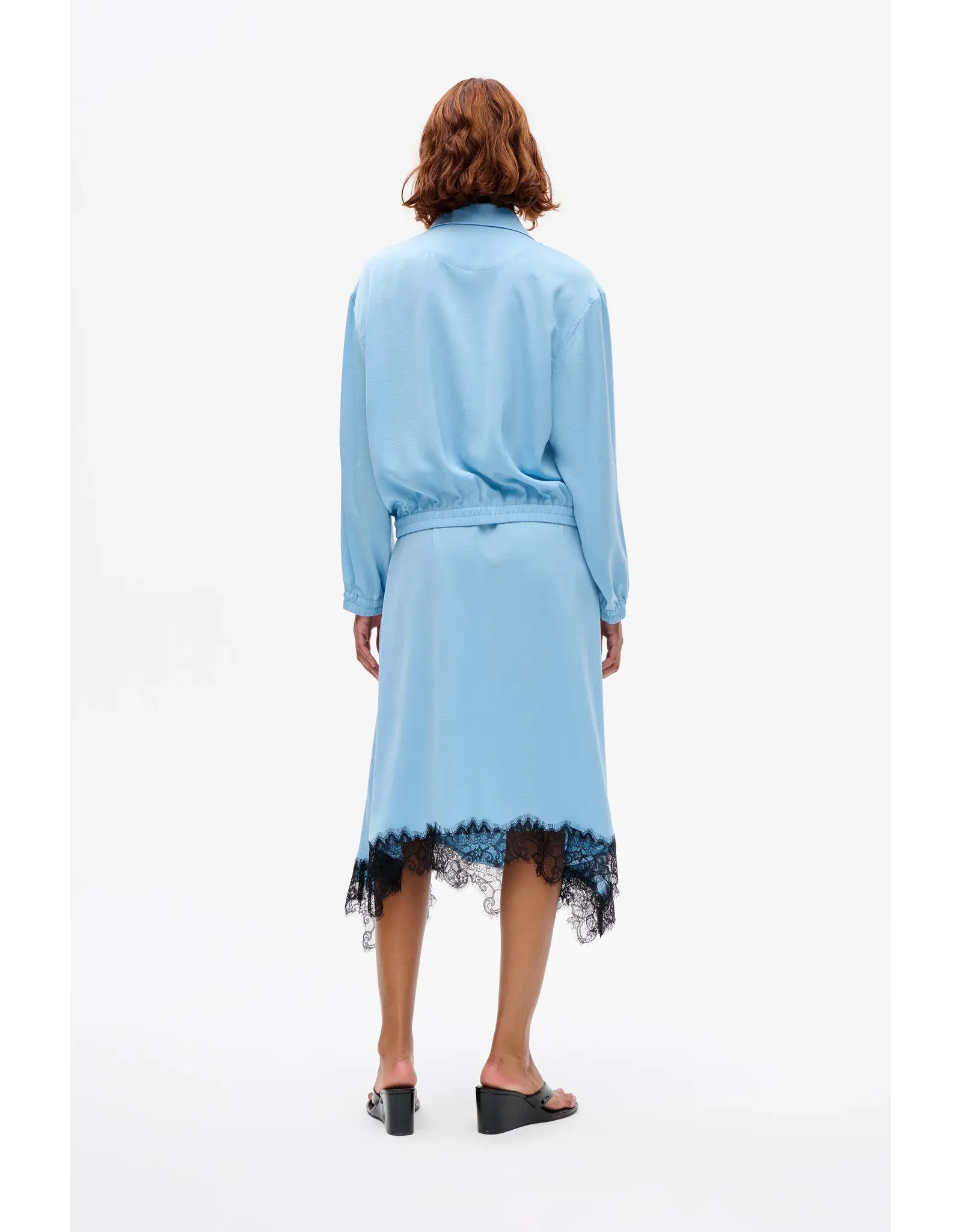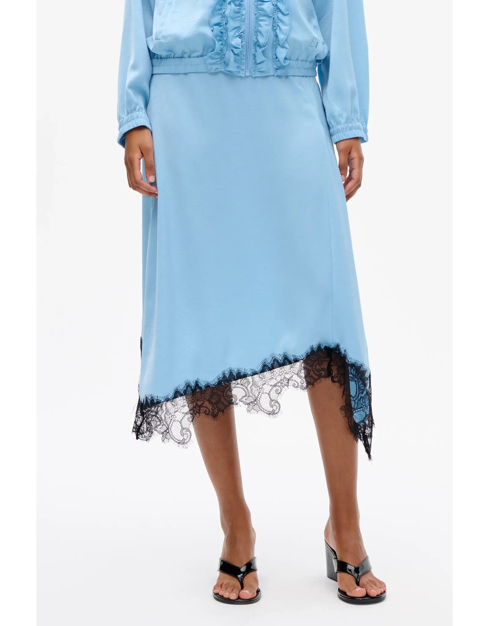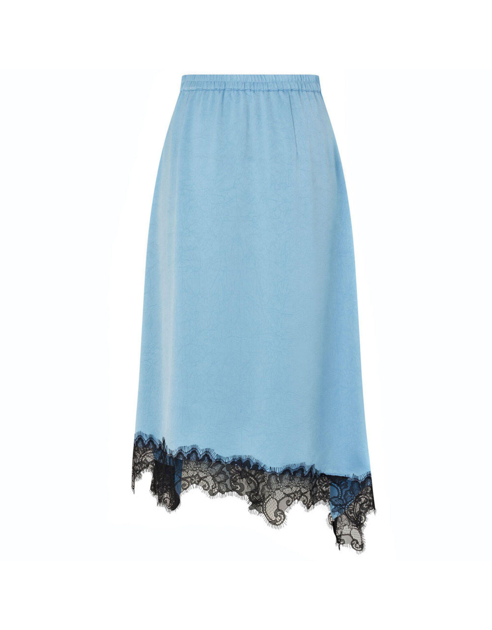 The Sophie Skirt is made in crinkled satin. The high-waisted midi skirt has an elastic waistband at the back and an asymmetric hemline trimmed with lace.