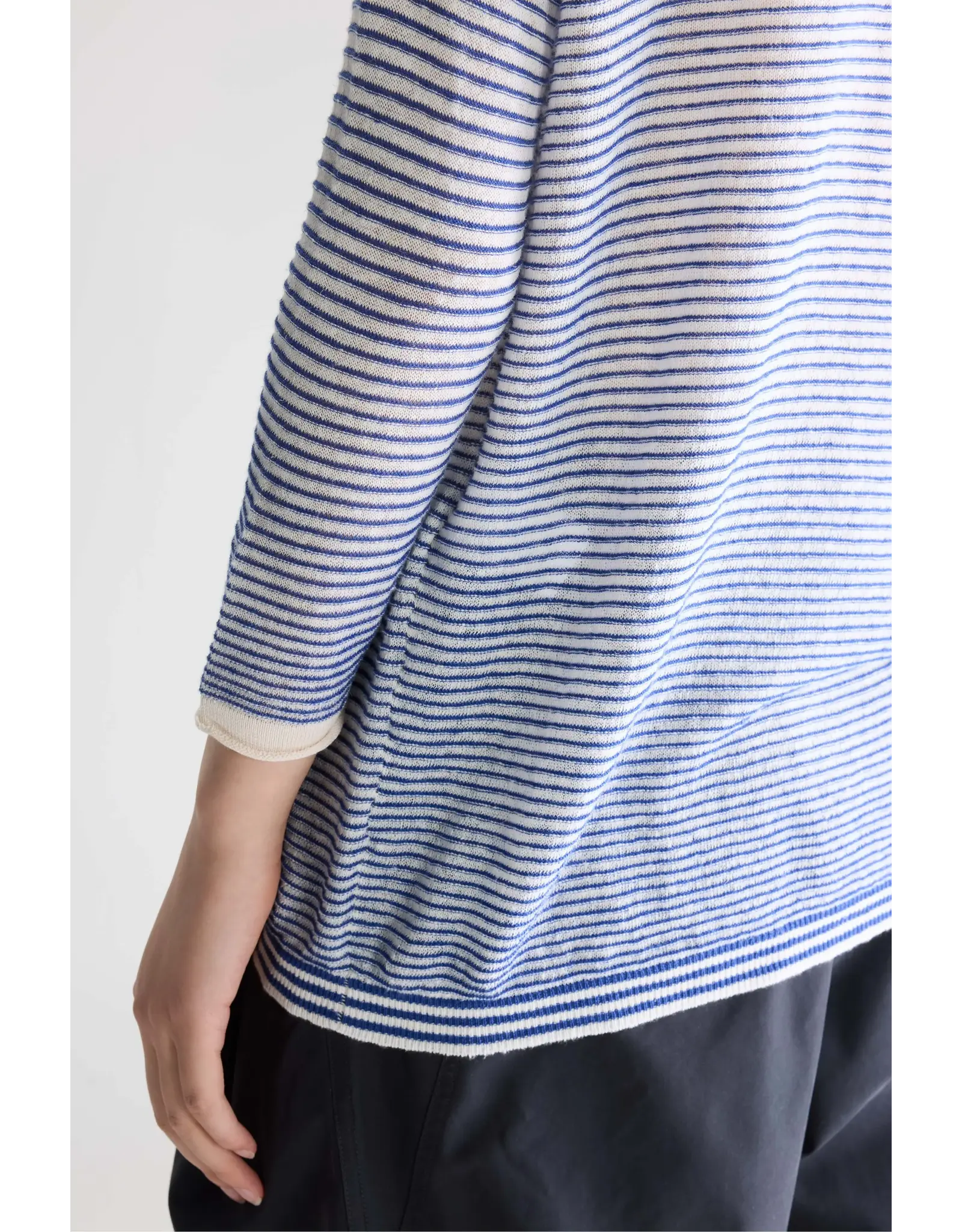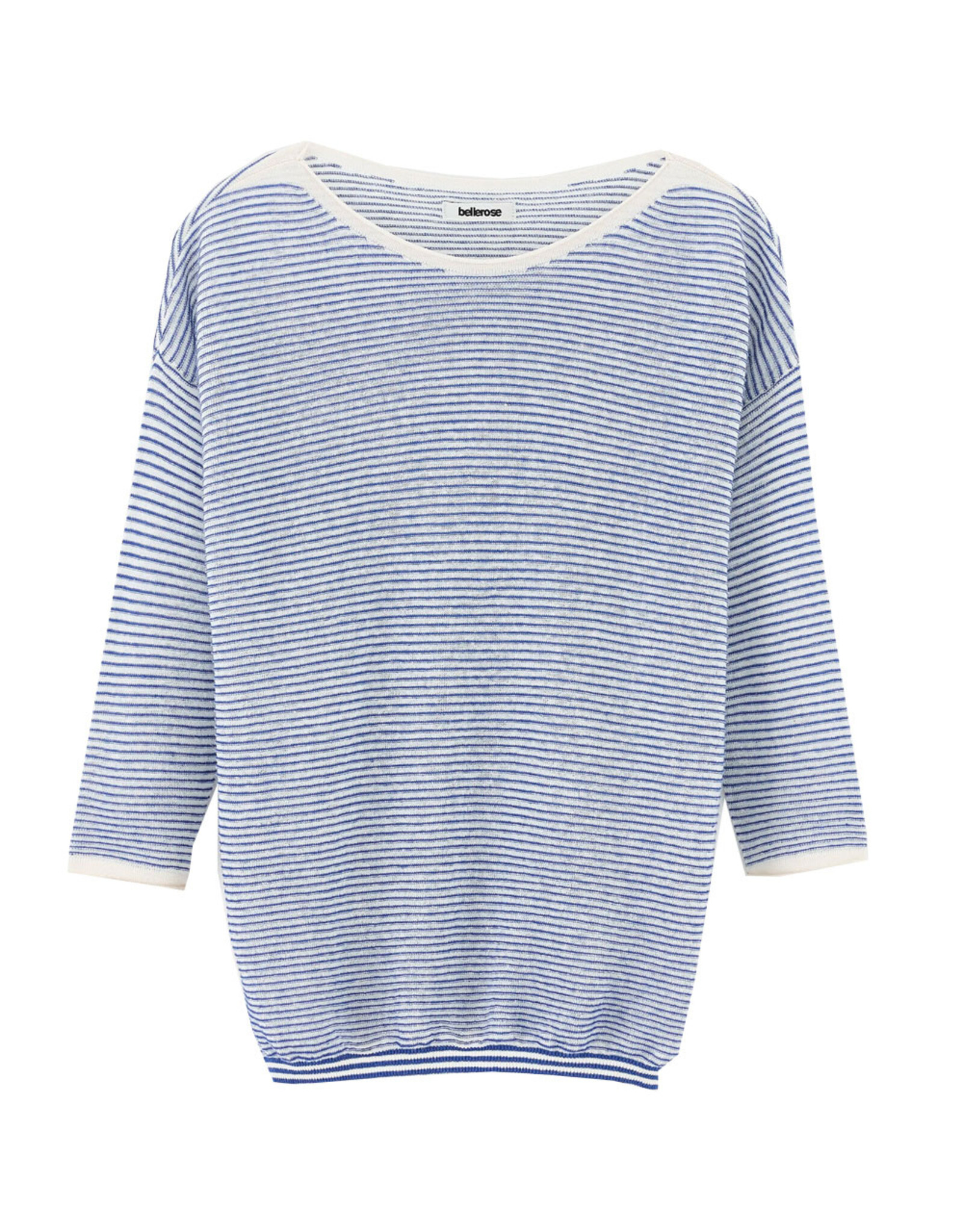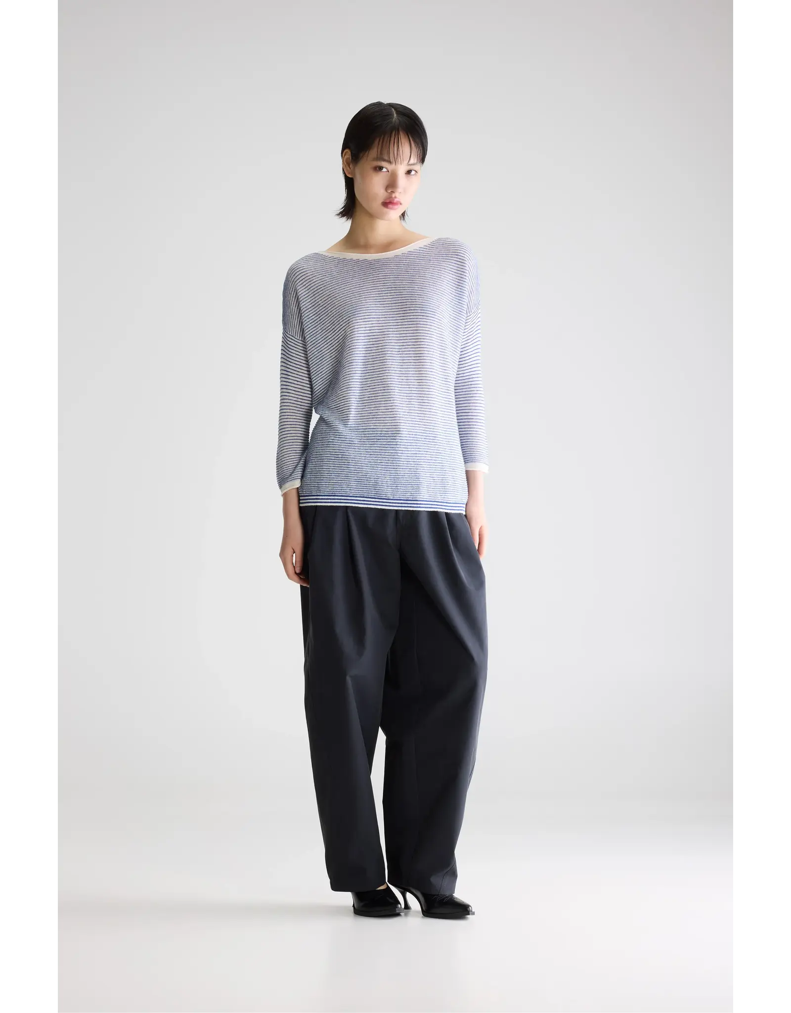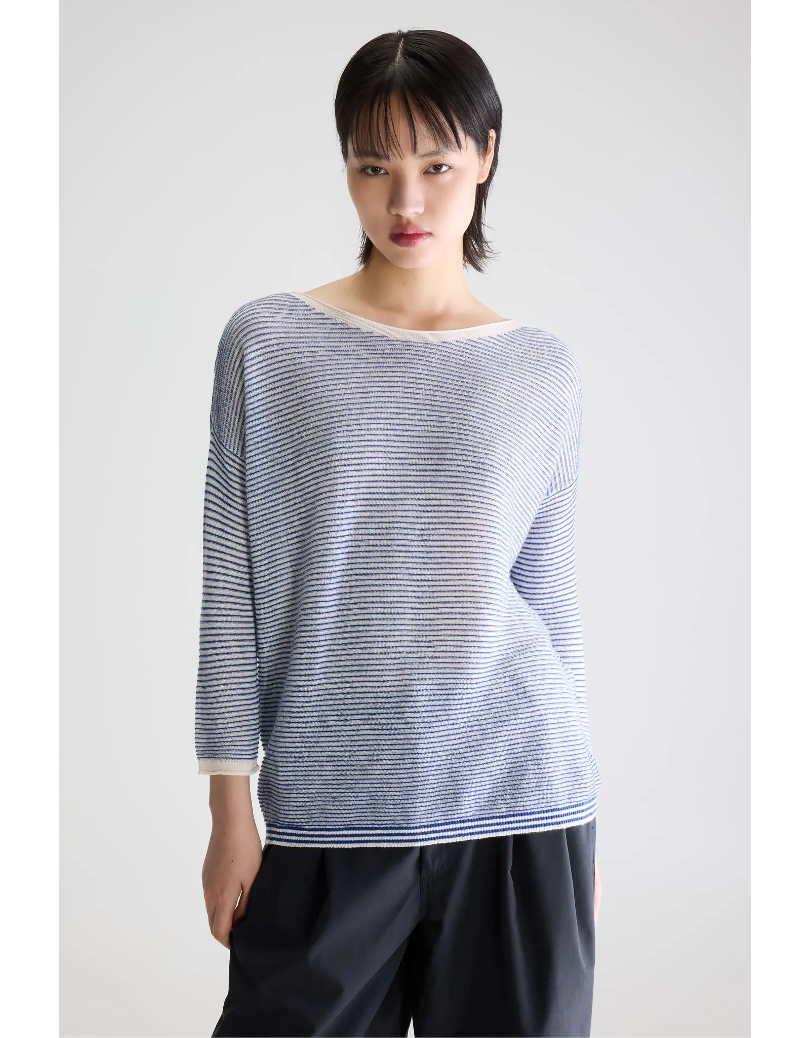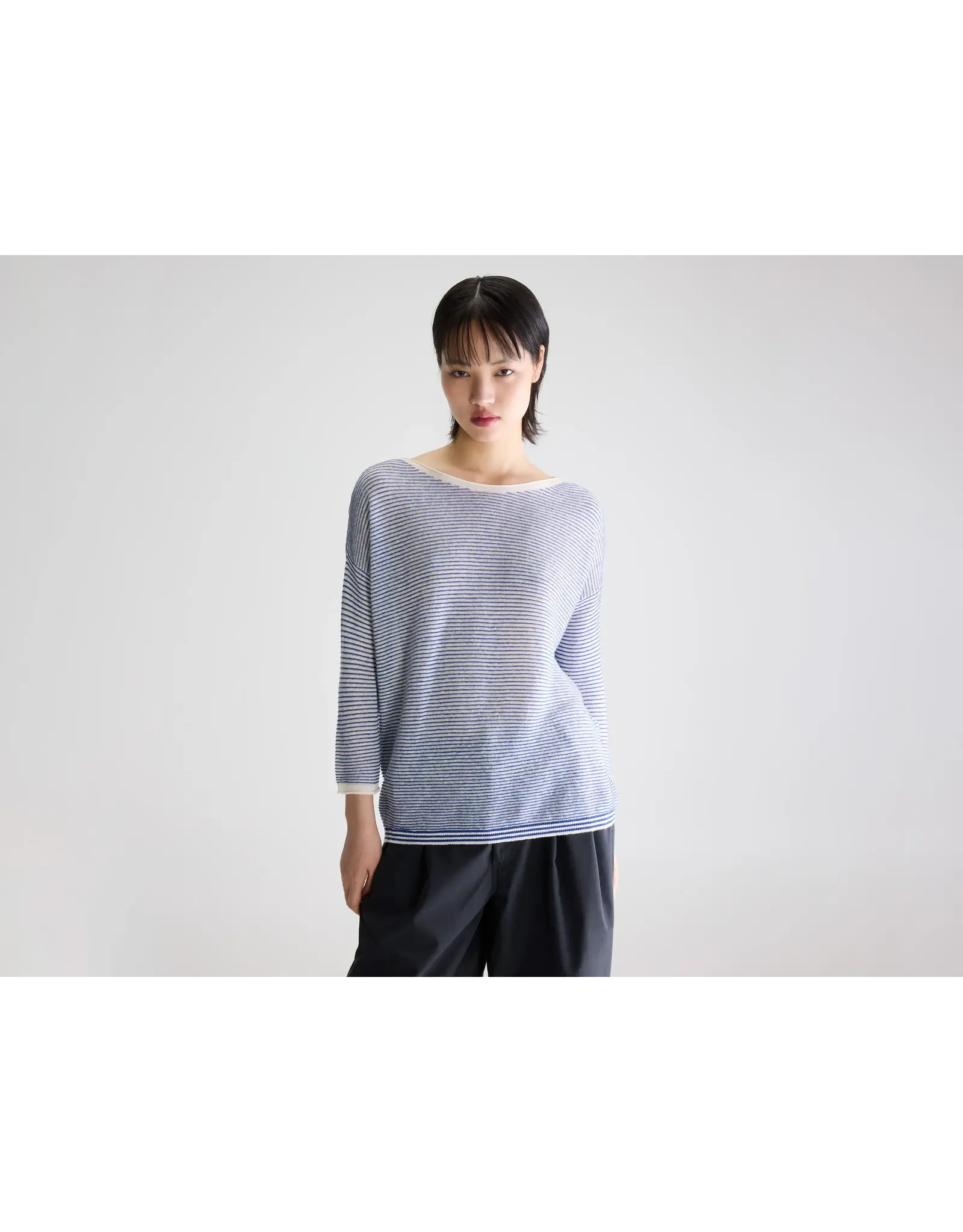 Klassieke trui met boothals, voorzien van blauwe glinsterende horizontale strepen, gemaakt van een zachte linnenmix.