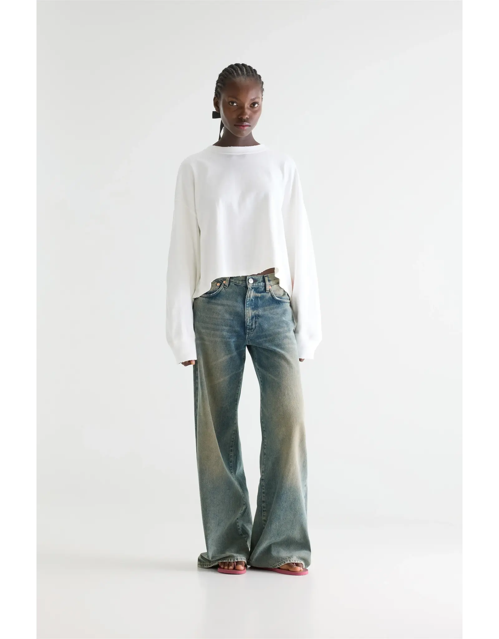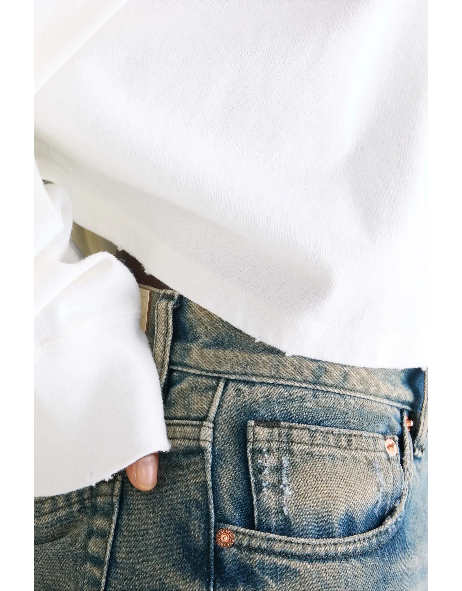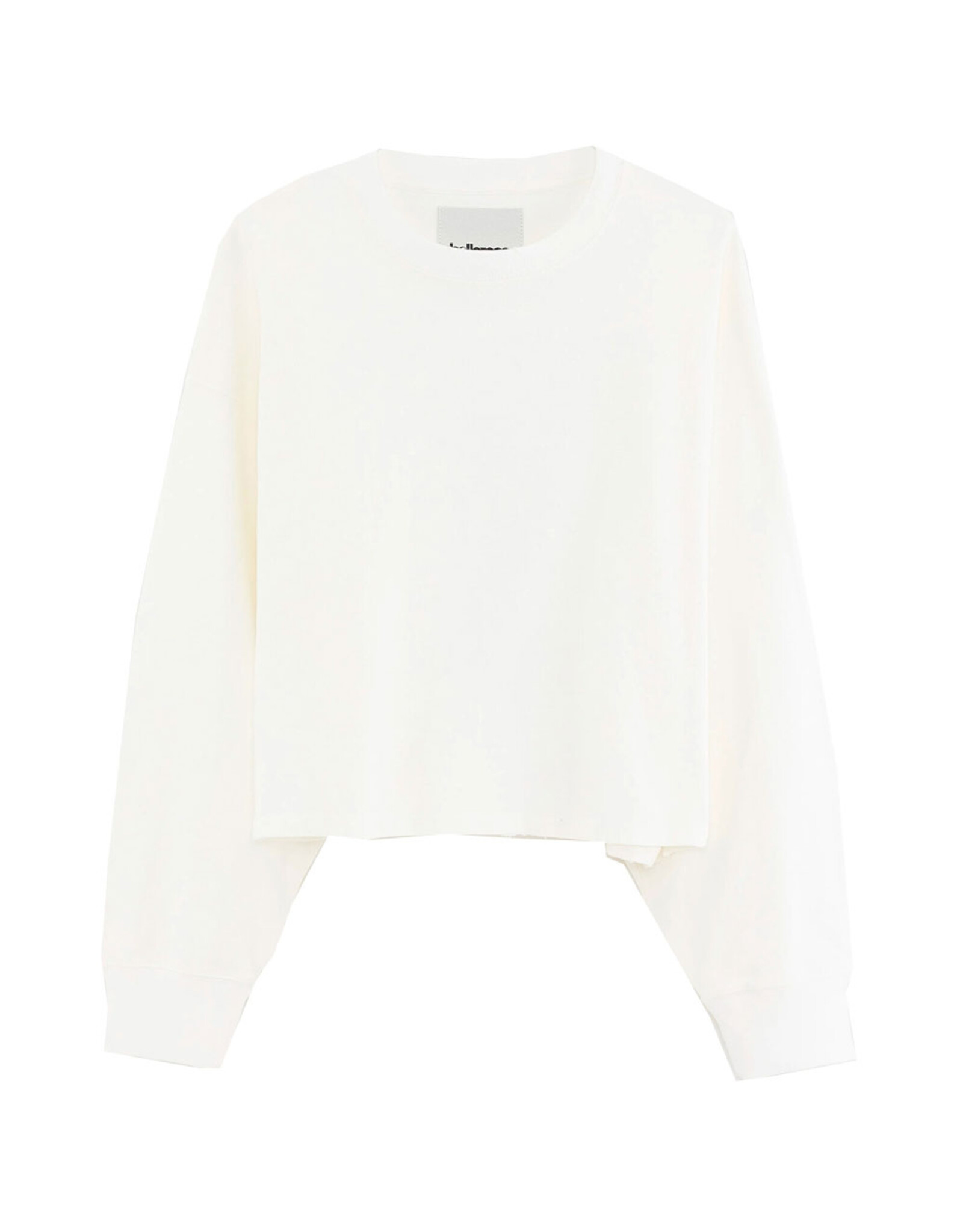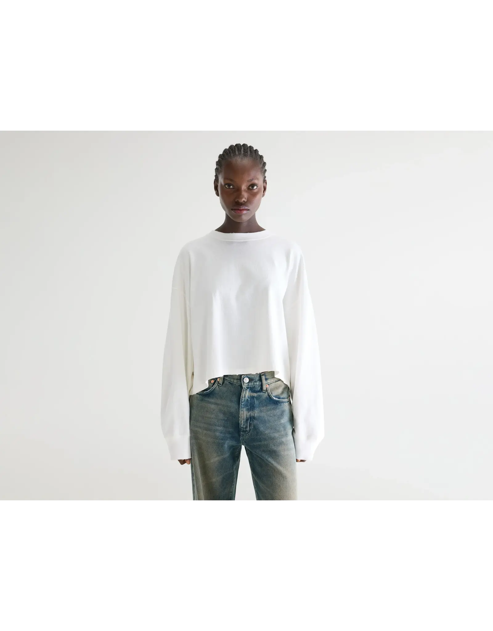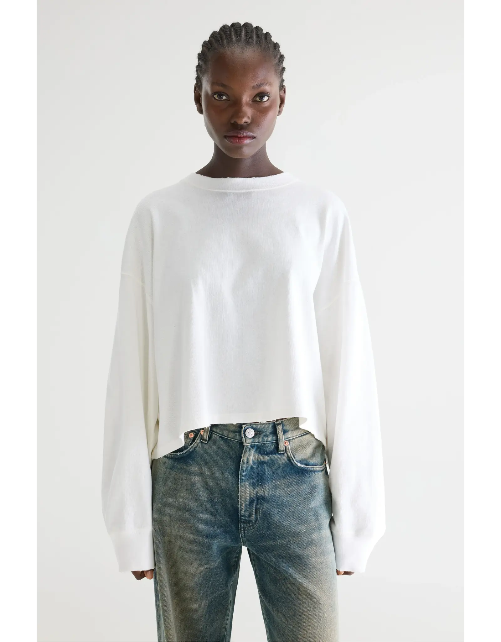 Oversized cropped t-shirt met ronde hals en lange mouwen, in gebroken wit katoenen jersey met distressed randen.