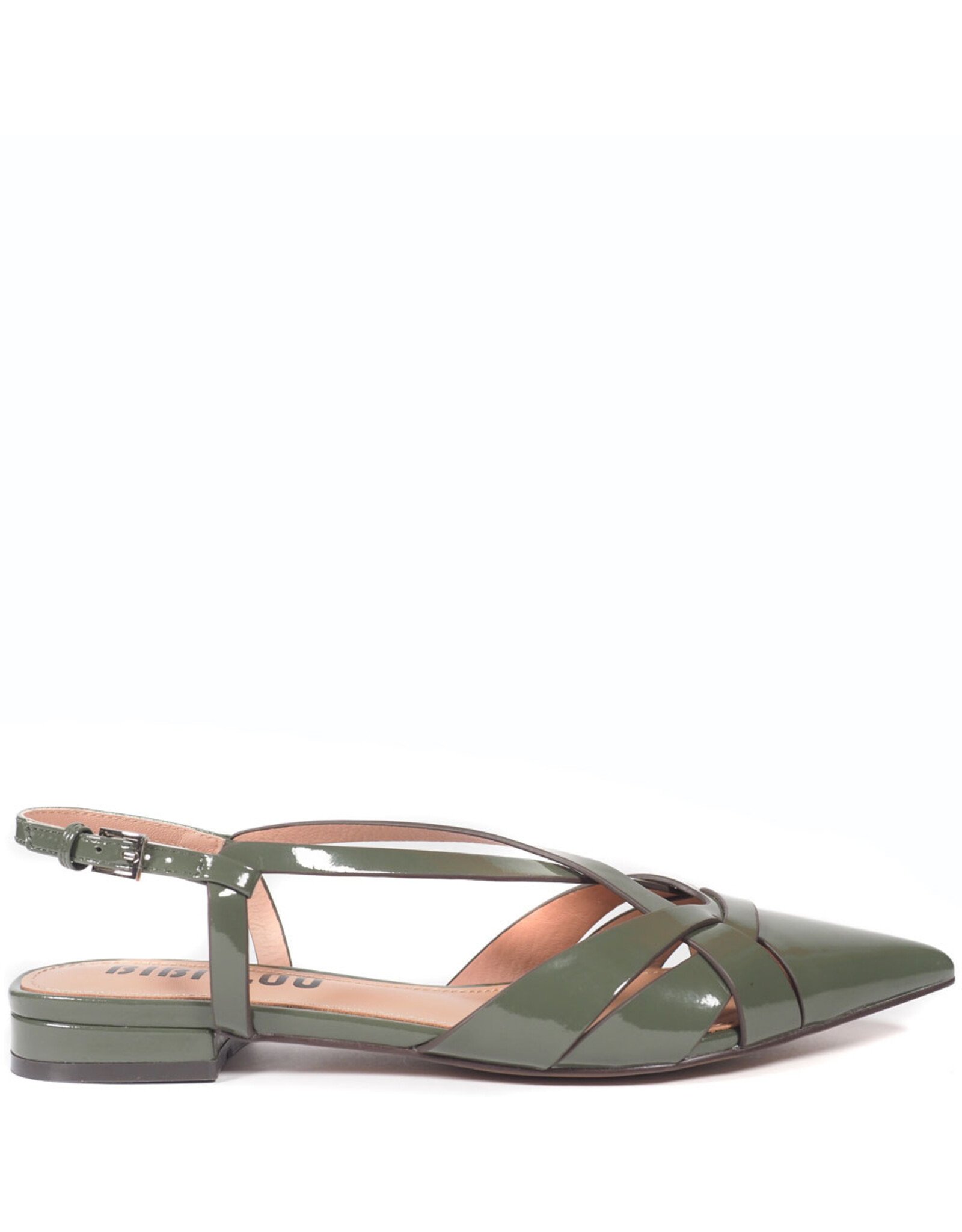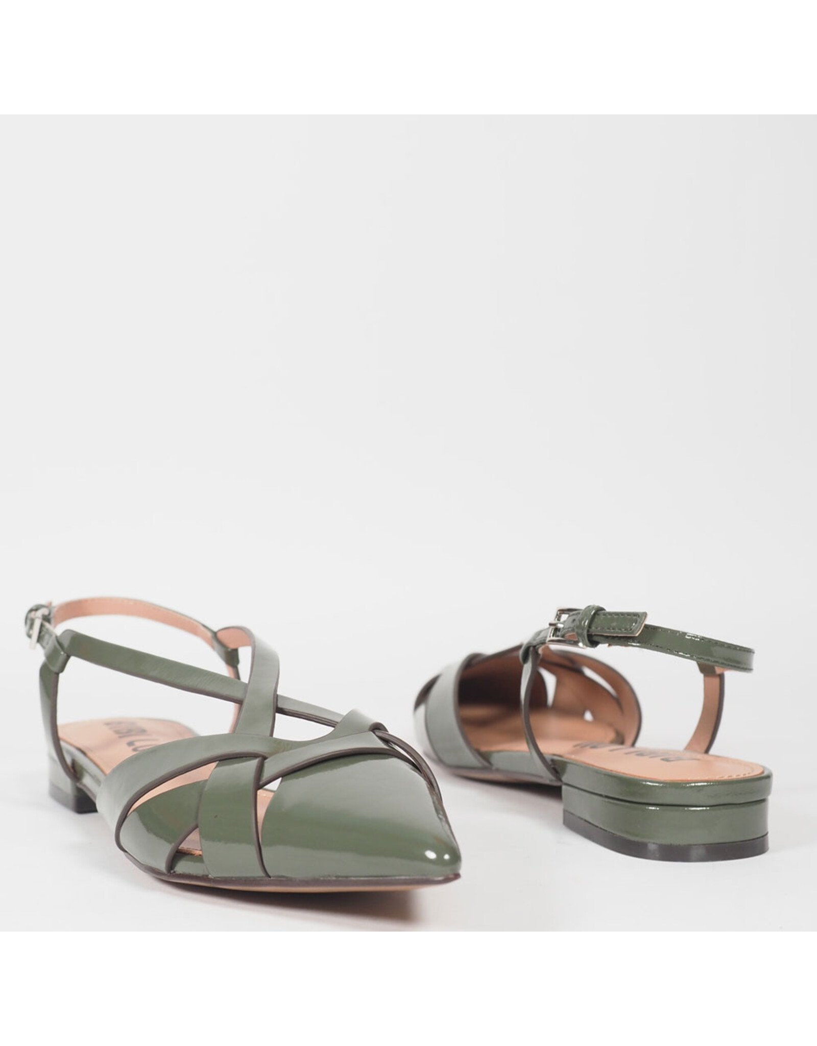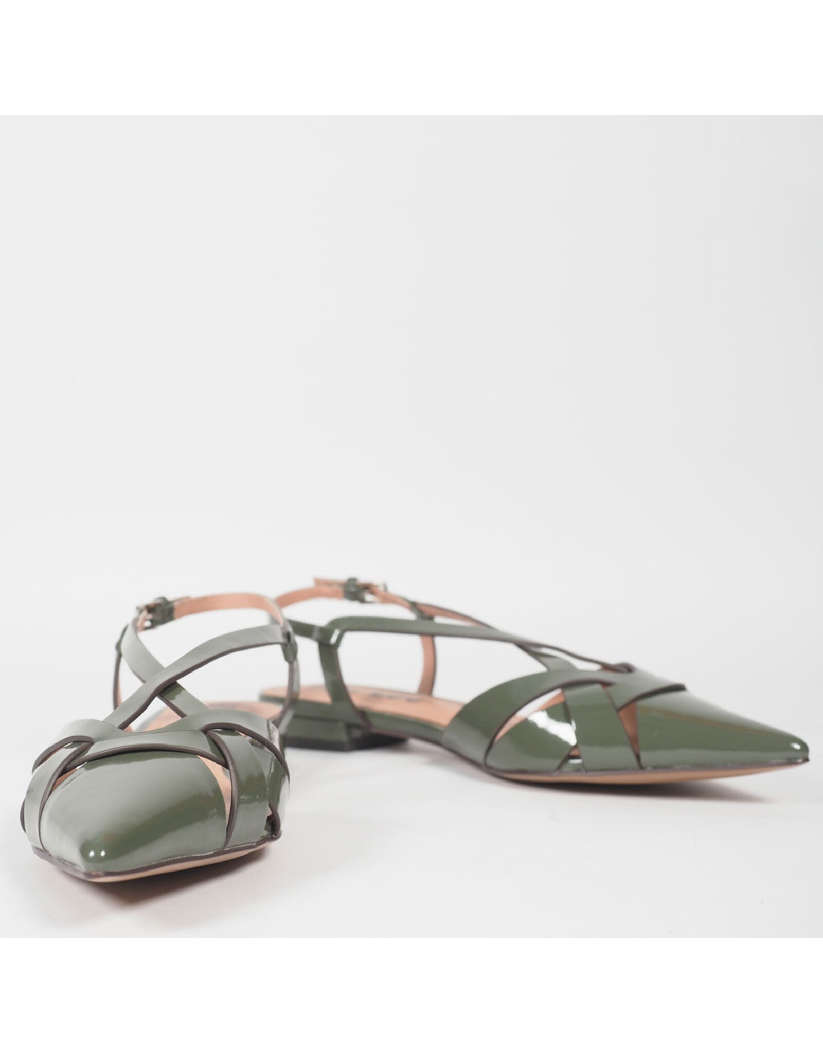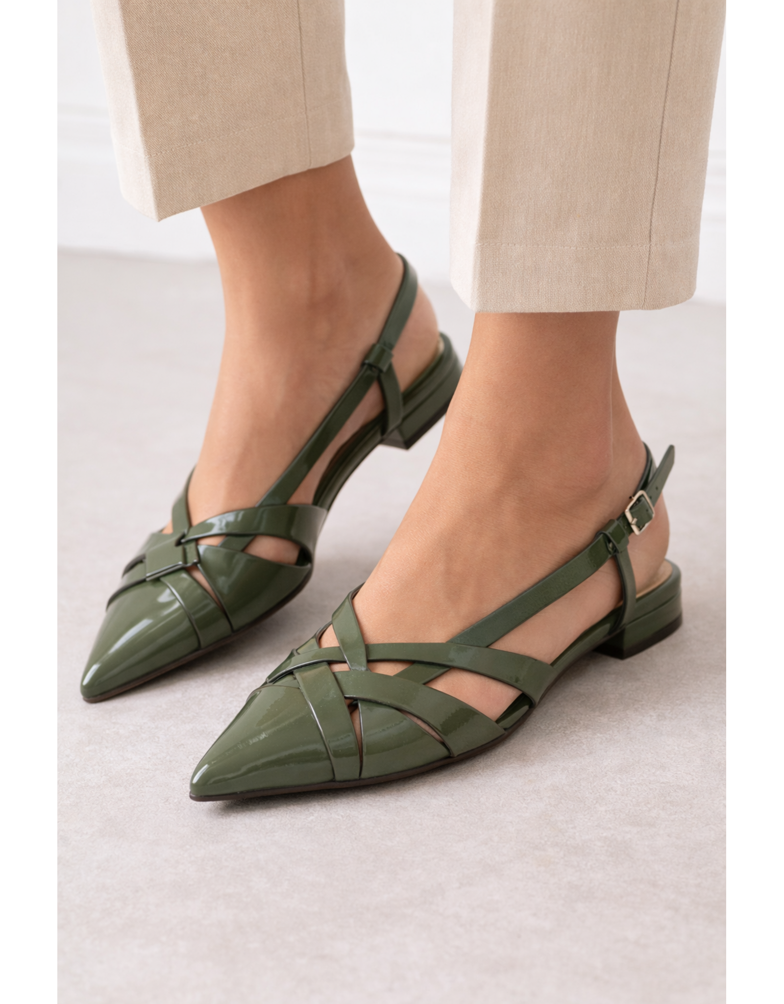 Verfijnde slingback ballerina uitgevoerd in glanzend olijfgroen lakleer. De puntige neus en slanke lijnen zorgen voor een elegante uitstraling, terwijl de gekruiste banden over de wreef een subtiel speels detail toevoegen. Het verstelbare hielbandje met gesp biedt een goede pasvorm en extra comfort. Dankzij de lage hak is deze schoen ideaal voor dagelijks gebruik, van werk tot casual chic momenten.