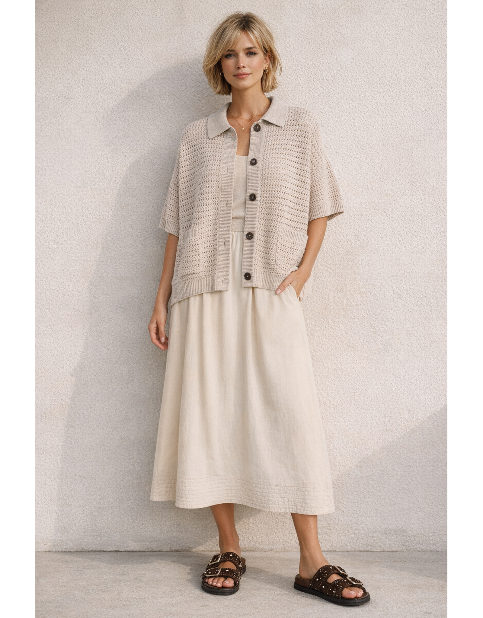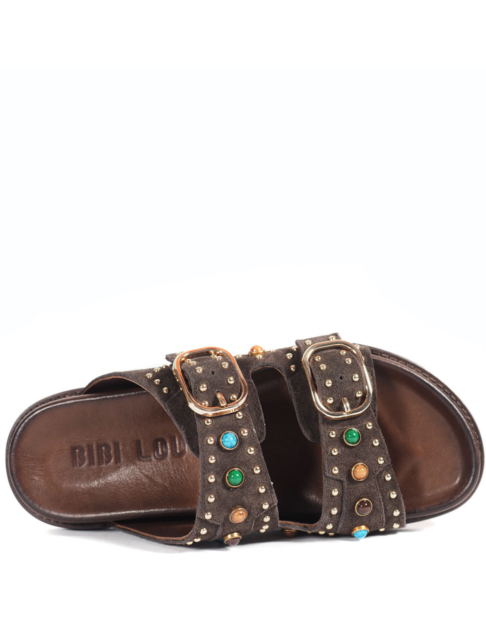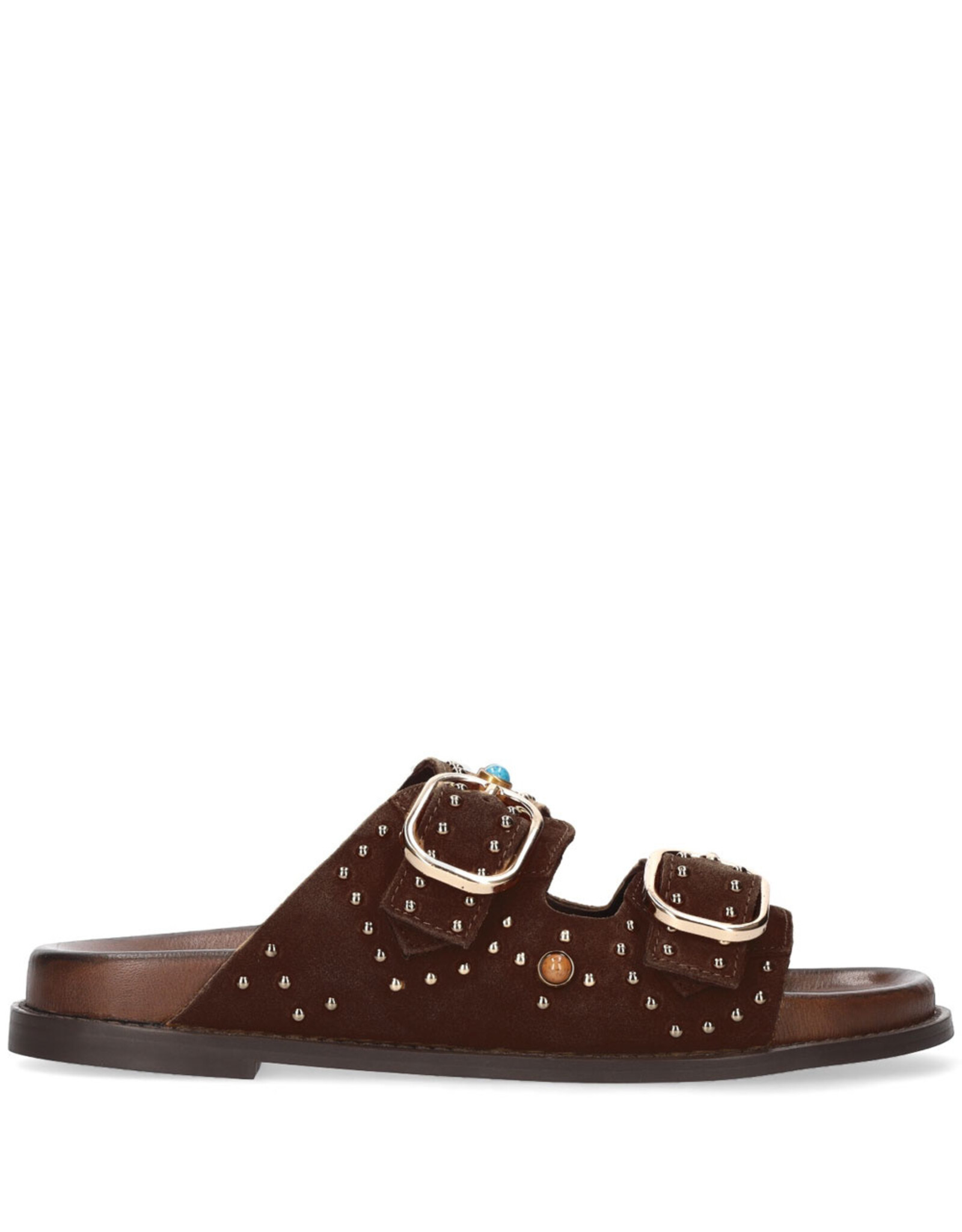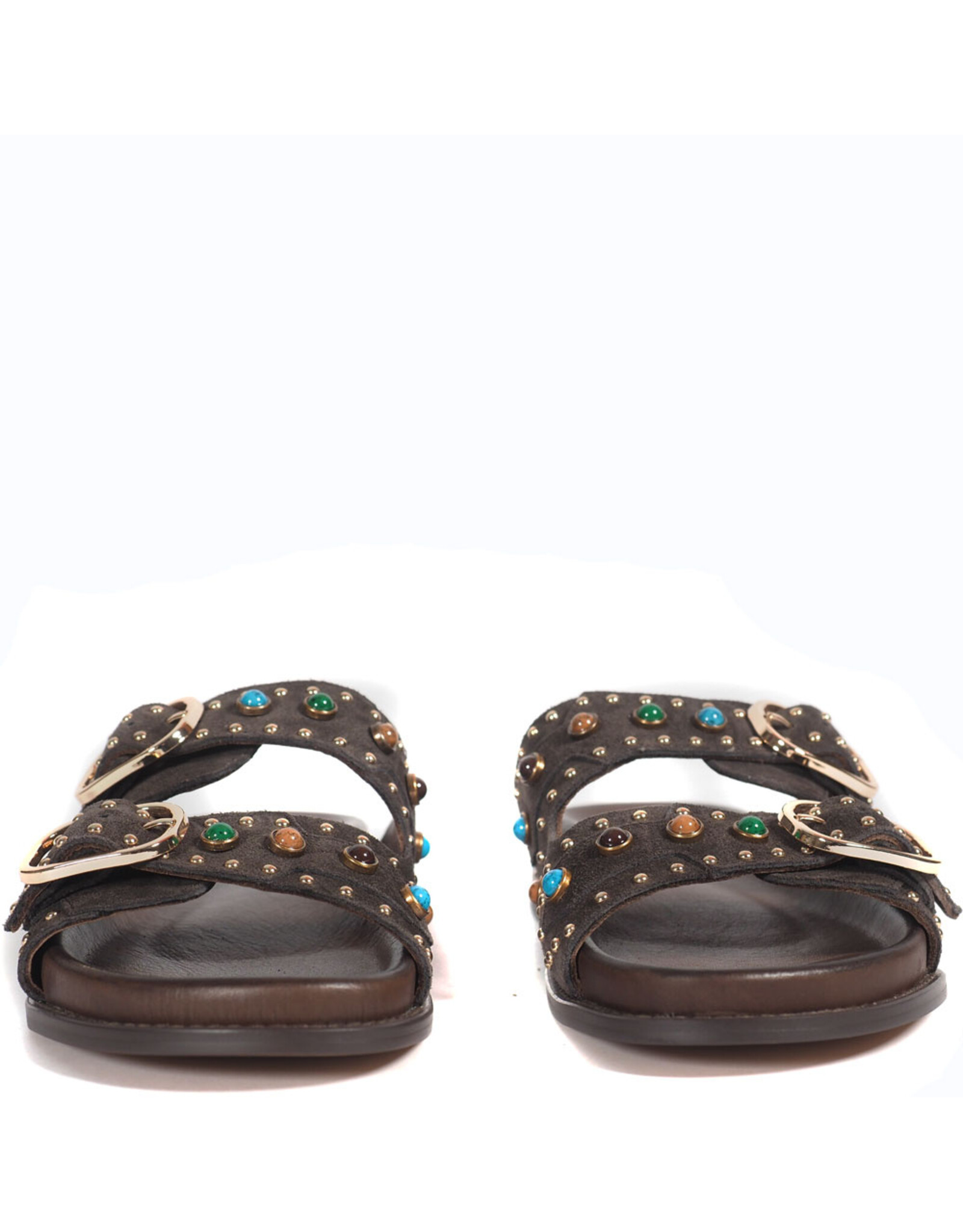 • Twee brede bandjes over de voet, elk voorzien van stijlvolle gouden gespen – een verfijnde look met een speels accent.