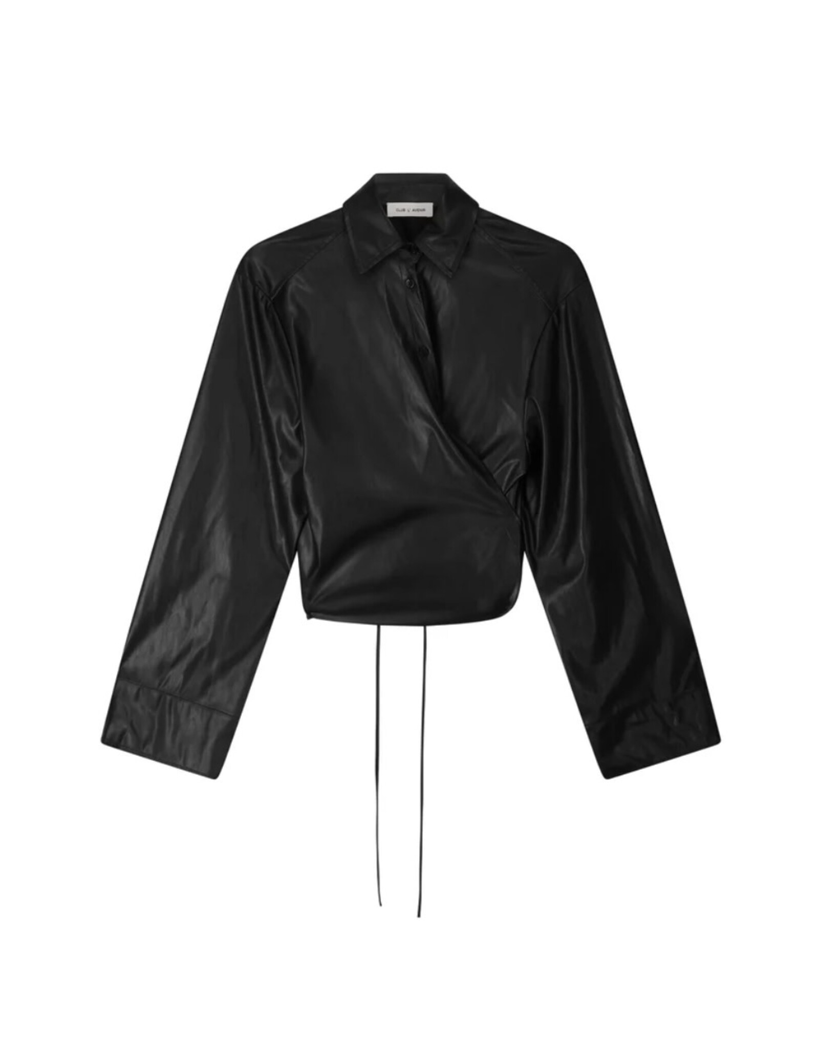 Deze blouse van vegan leer geeft je garderobe een gedurfde uitstraling. Het ontwerp wikkel je elegant om de taille en wordt aan de achterkant vastgeknoopt met twee smalle bandjes voor een verstelbare en flatterende pasvorm.