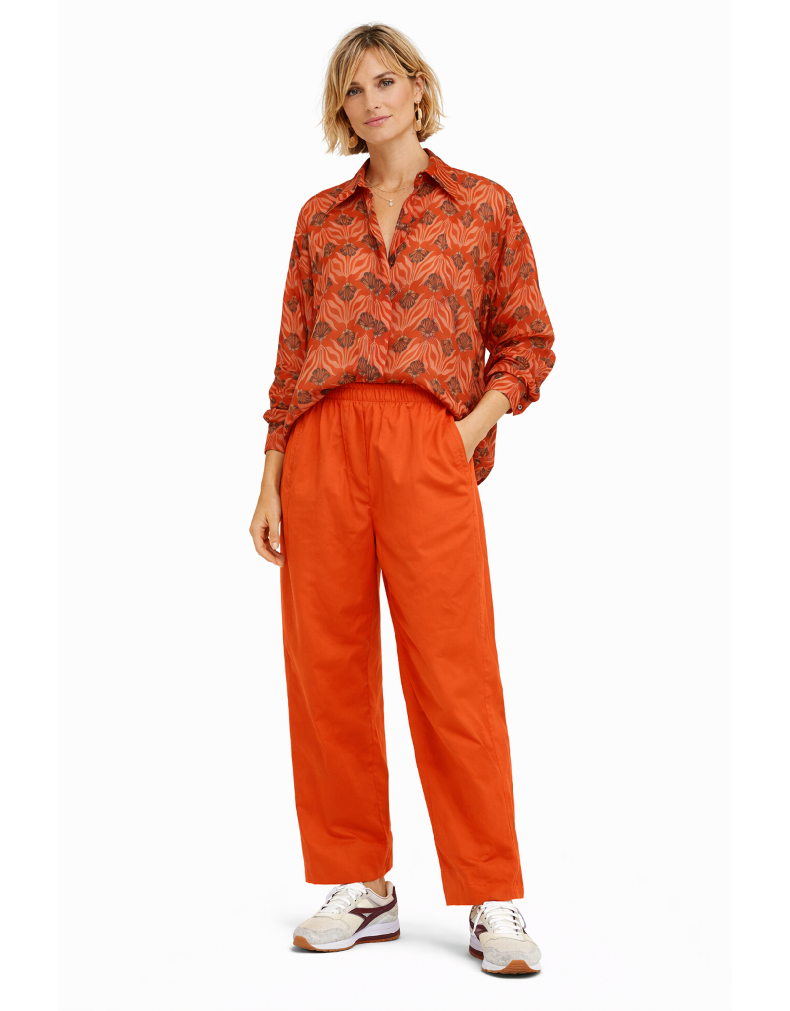 Deze stijlvolle broek in een warme oranje tint is een echte blikvanger voor je garderobe. Het minimalistische ontwerp wordt gecombineerd met een comfortabele, elastische tailleband die zorgt voor een perfecte pasvorm en extra draagcomfort. De rechte pijpen geven de broek een moderne en ontspannen uitstraling, terwijl de soepele stof licht en prettig aanvoelt.