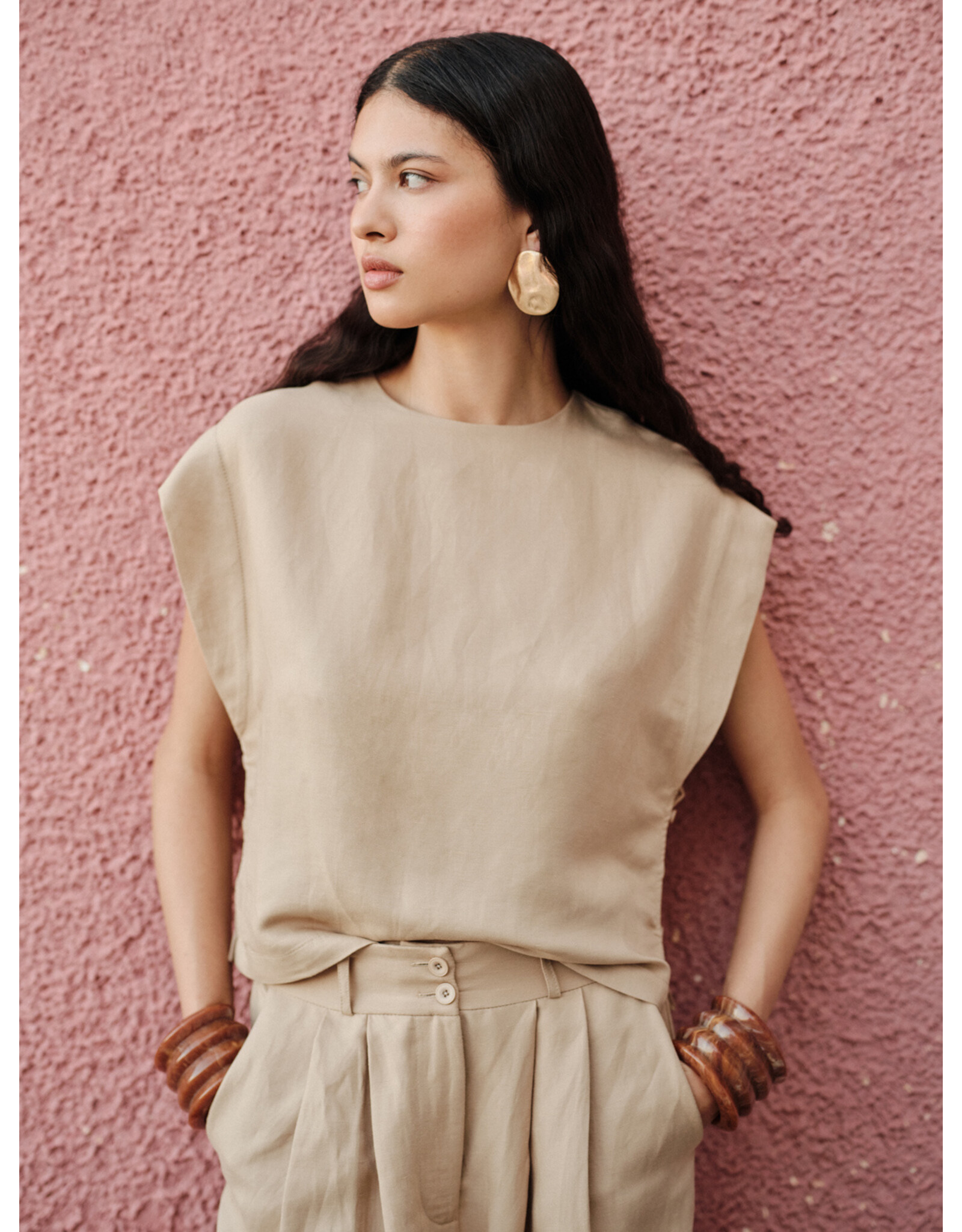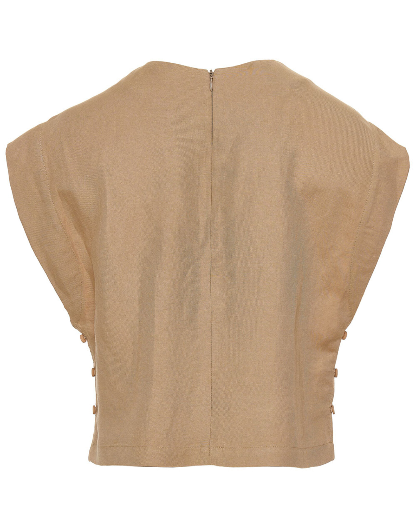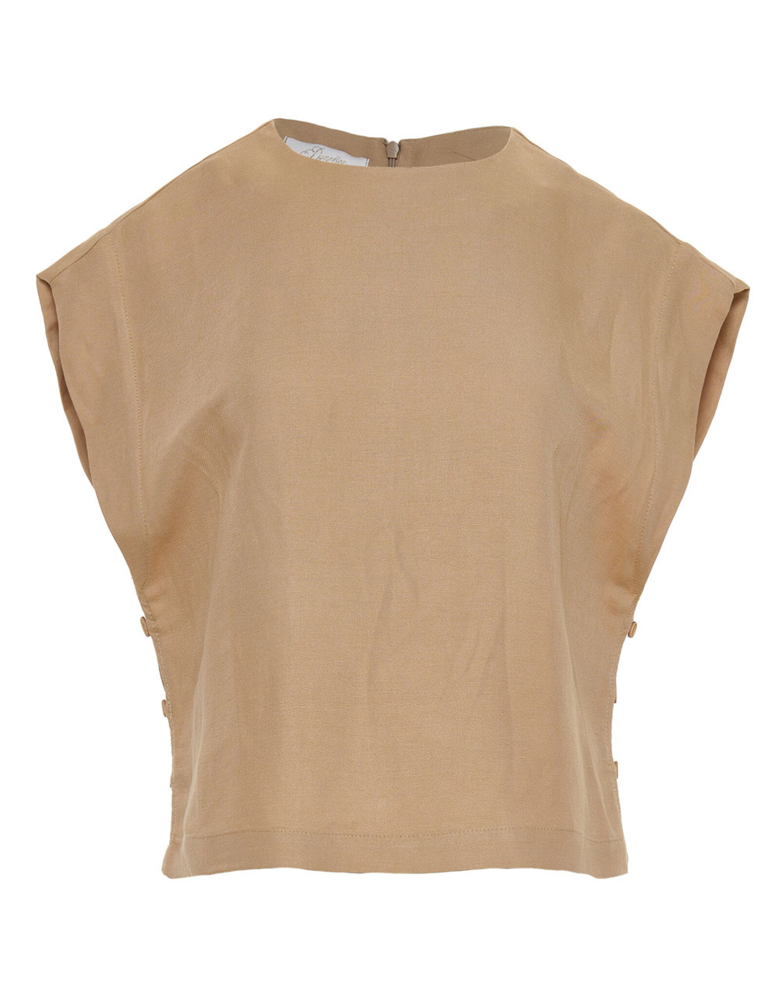 Minimalistische top in een elegante beige tint met een moderne en verfijnde uitstraling. De top heeft een ronde halslijnen een mouwloos ontwerp met licht verlengde schouders, wat zorgt voor een stijlvolle en eigentijdse look.