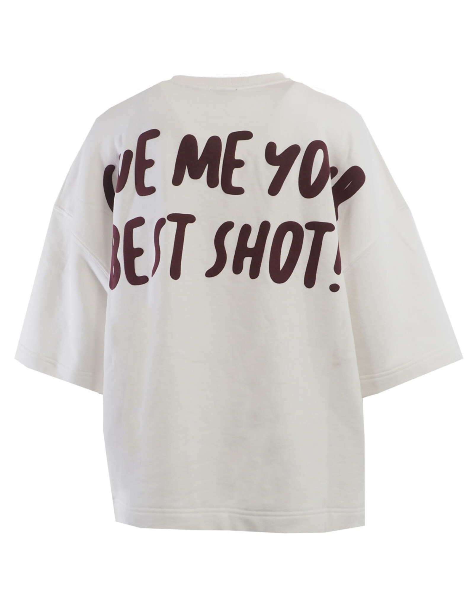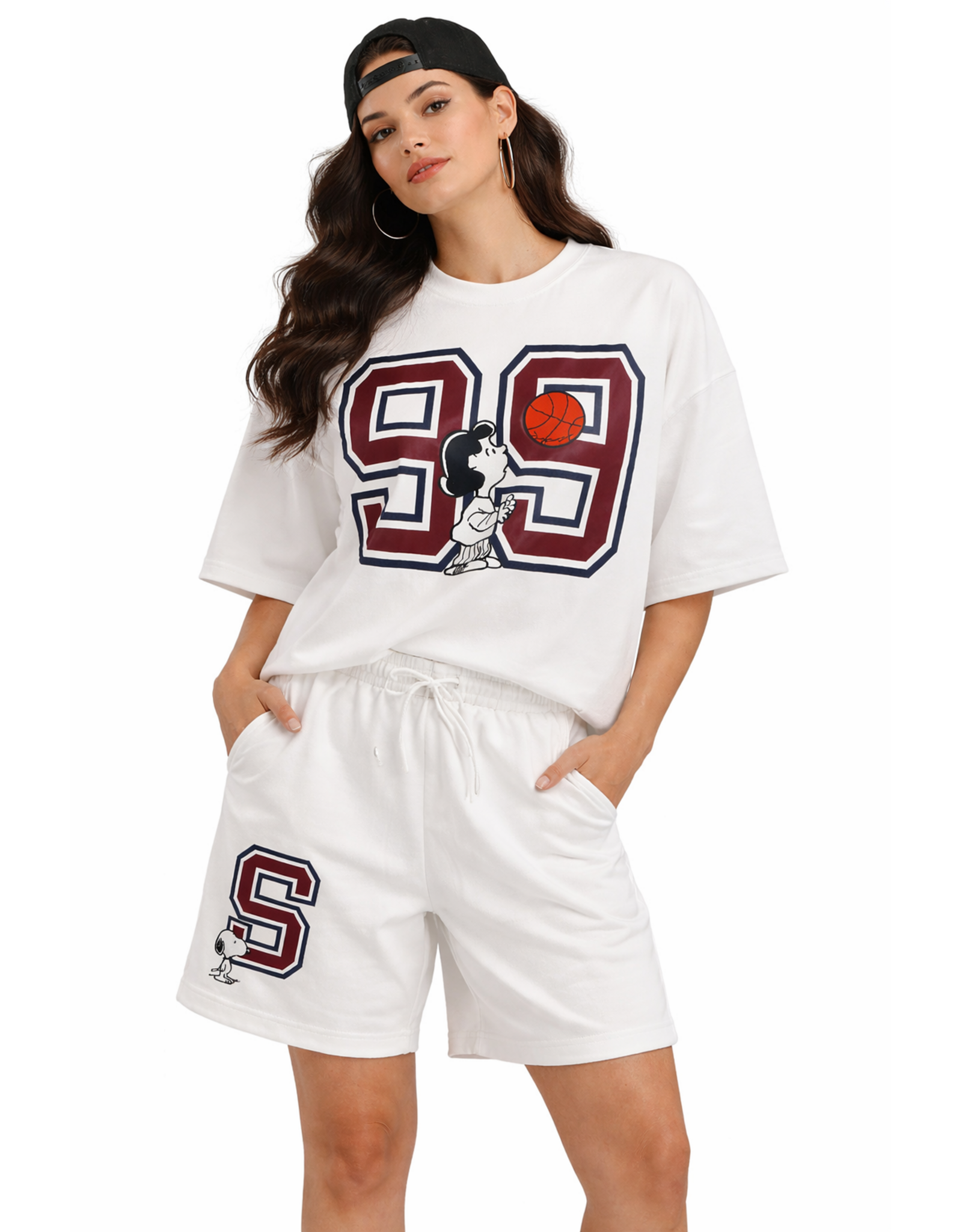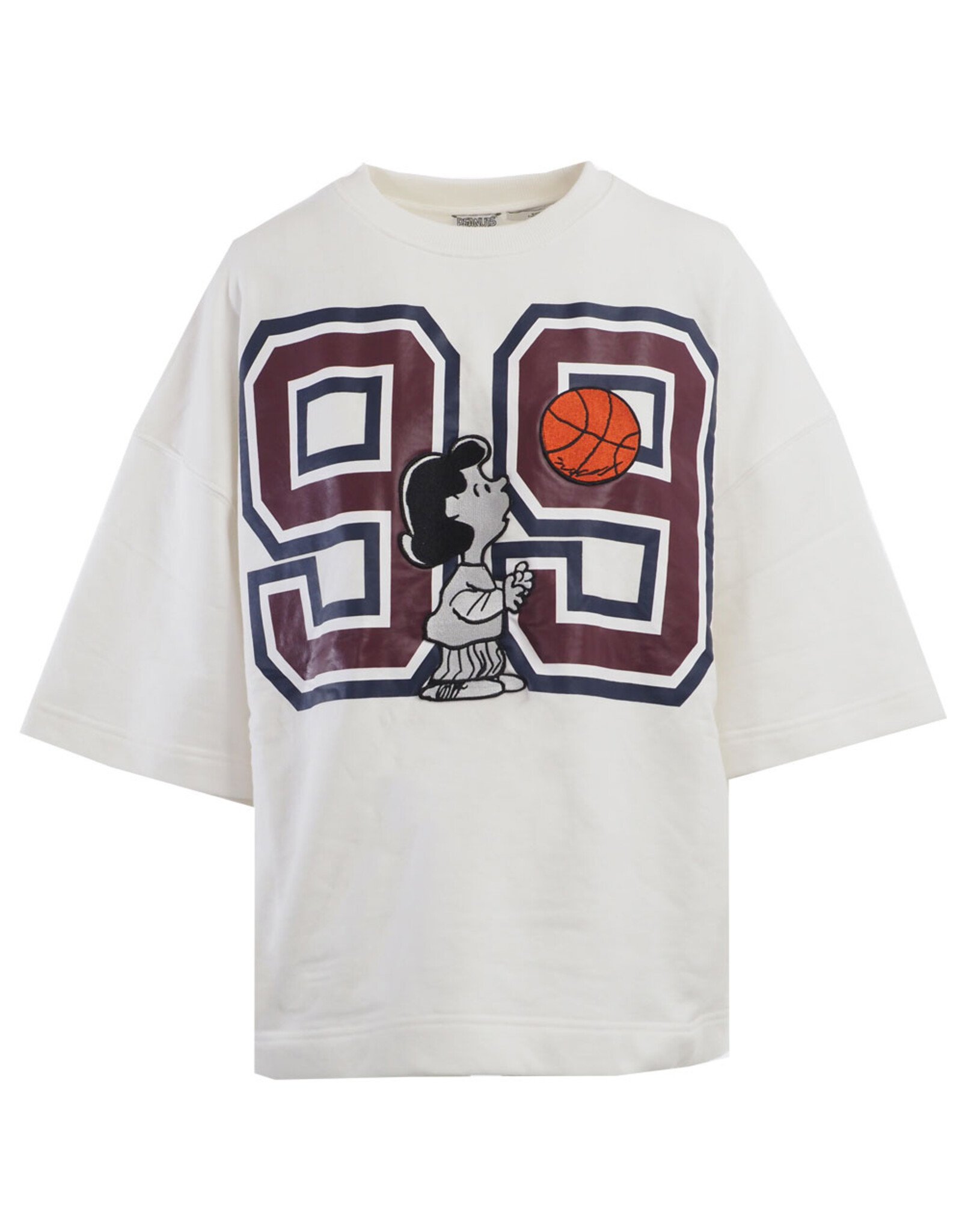 Het model is uitgevoerd in een frisse off-white kleur en afgewerkt met een grote “99”-print in bordeaux en navy, met een speelse Snoopy graphic en basketbal op de voorzijde. De oversized fit en zachte katoenkwaliteit zorgen voor een comfortabele, relaxte uitstraling met een retro twist.