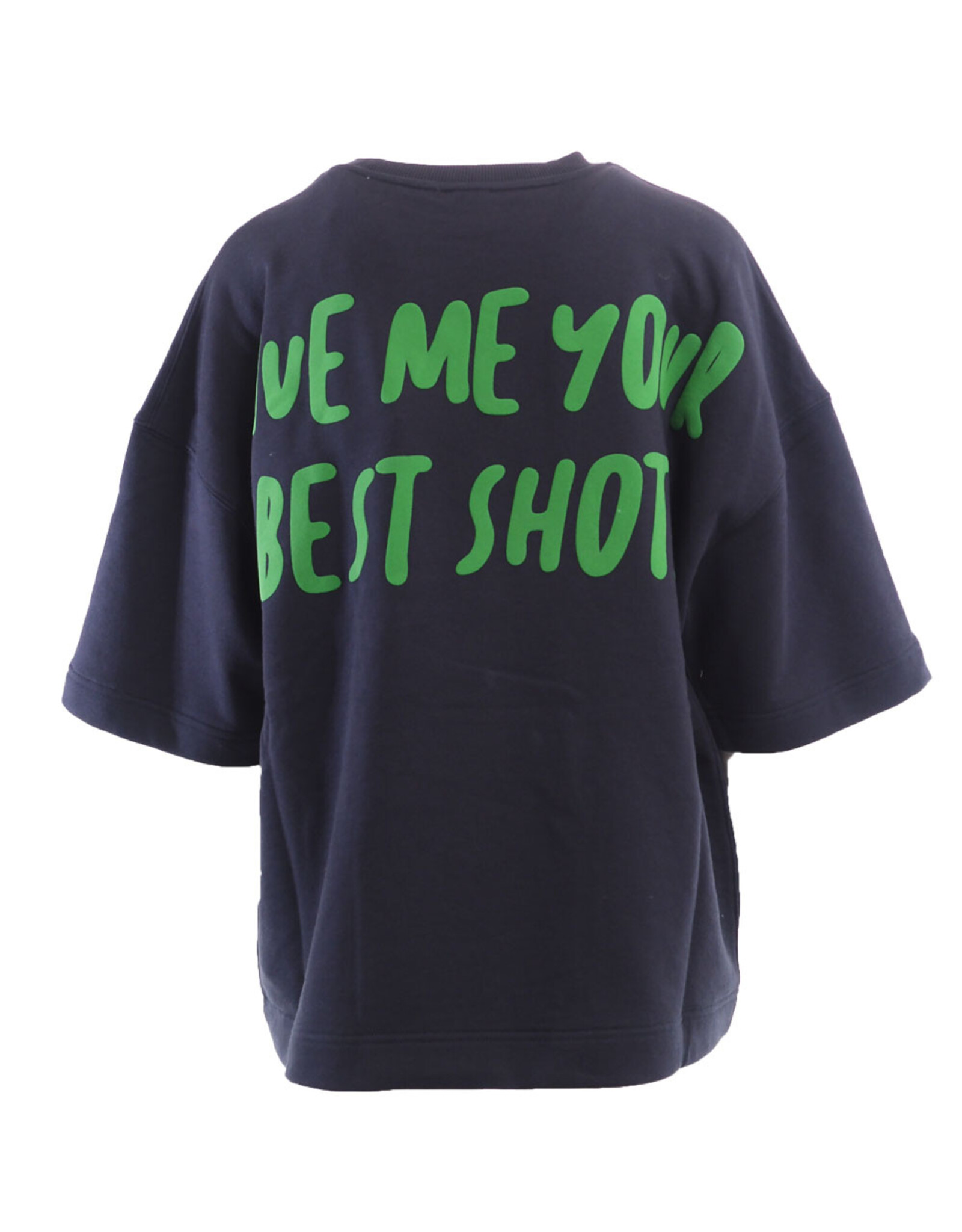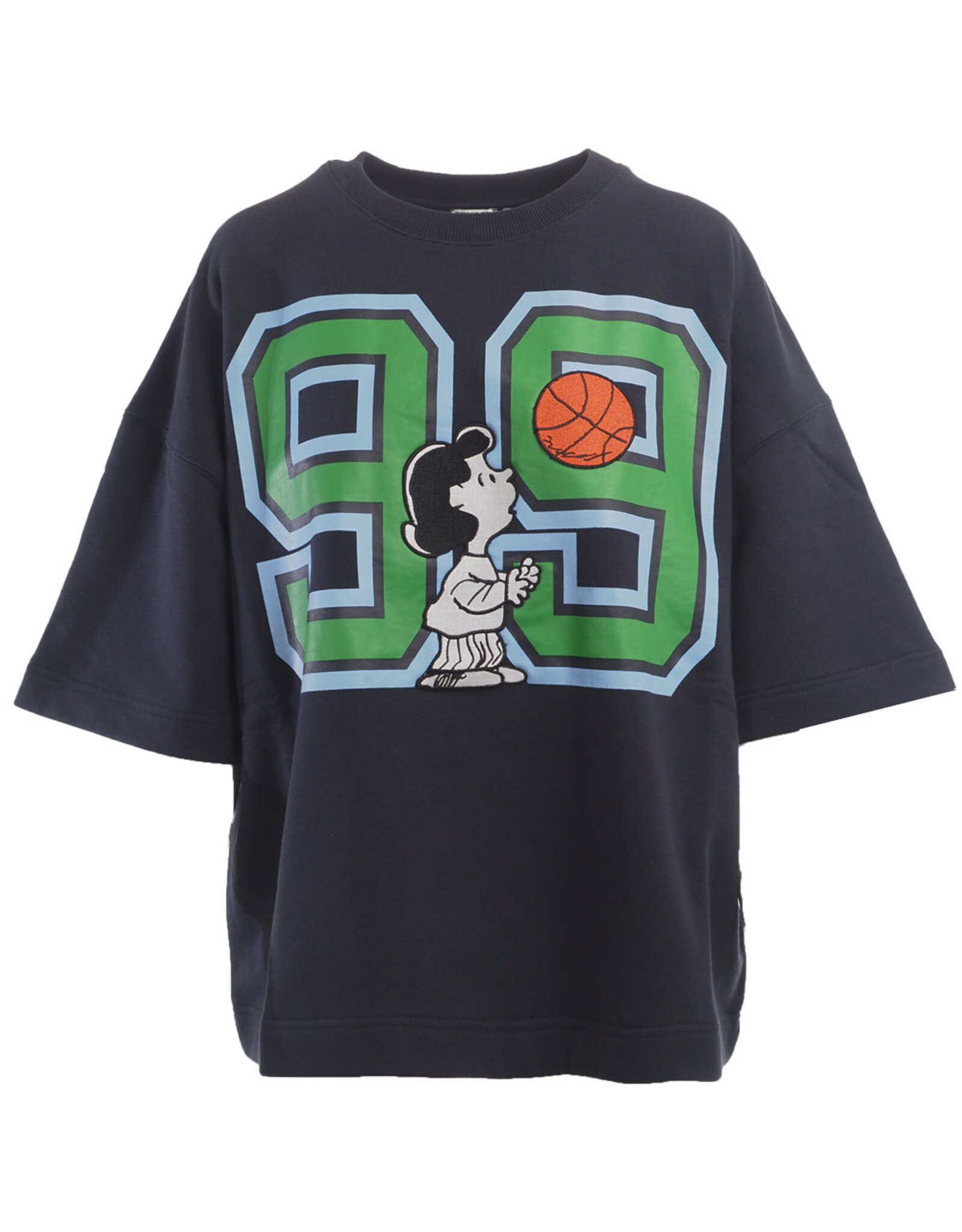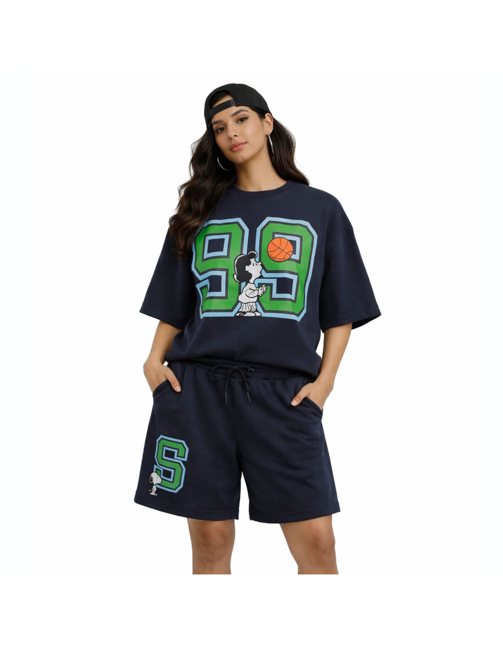 Het model is uitgevoerd in een diepe navy kleur en afgewerkt met een opvallende “99”-print in groen en lichtblauw, met een speelse Snoopy graphic en basketbal op de voorzijde. De oversized fit en zachte katoenkwaliteit zorgen voor een comfortabele, relaxte look met een retro varsity vibe.