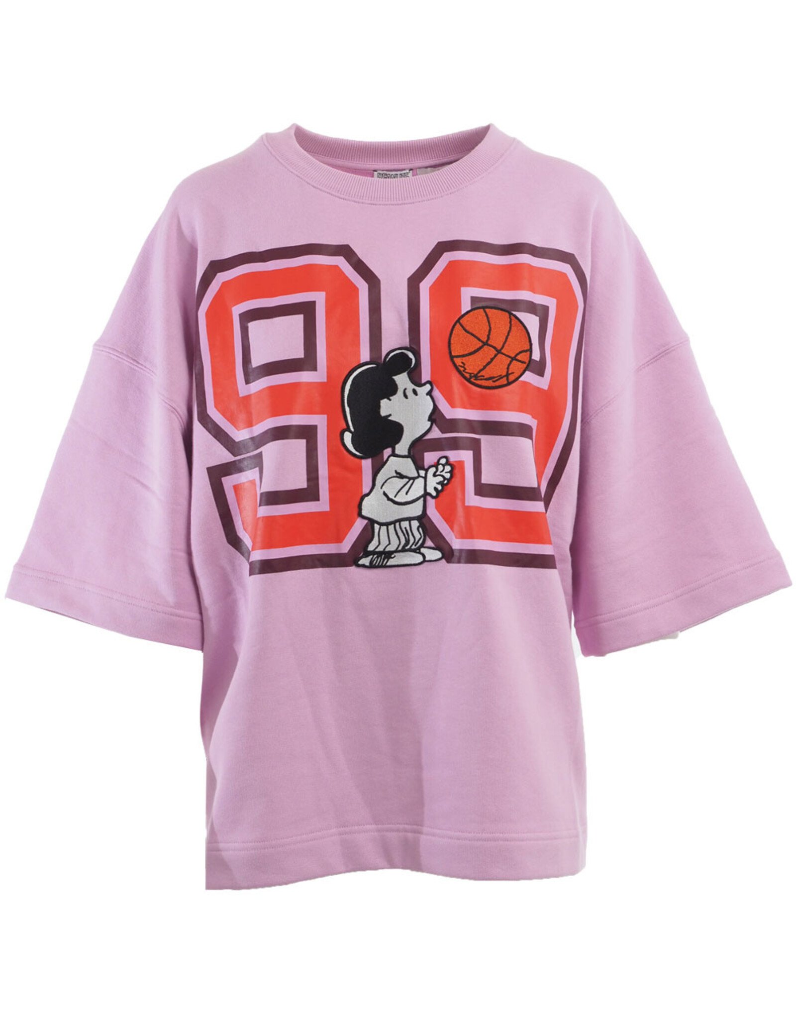 Het model is uitgevoerd in een zachte roze tint en afgewerkt met een opvallende “99”-print en een speelse Snoopy graphic met basketbal op de borst. De losse, oversized fit en zachte katoenkwaliteit zorgen voor een comfortabele en trendy look met een retro varsity touch.