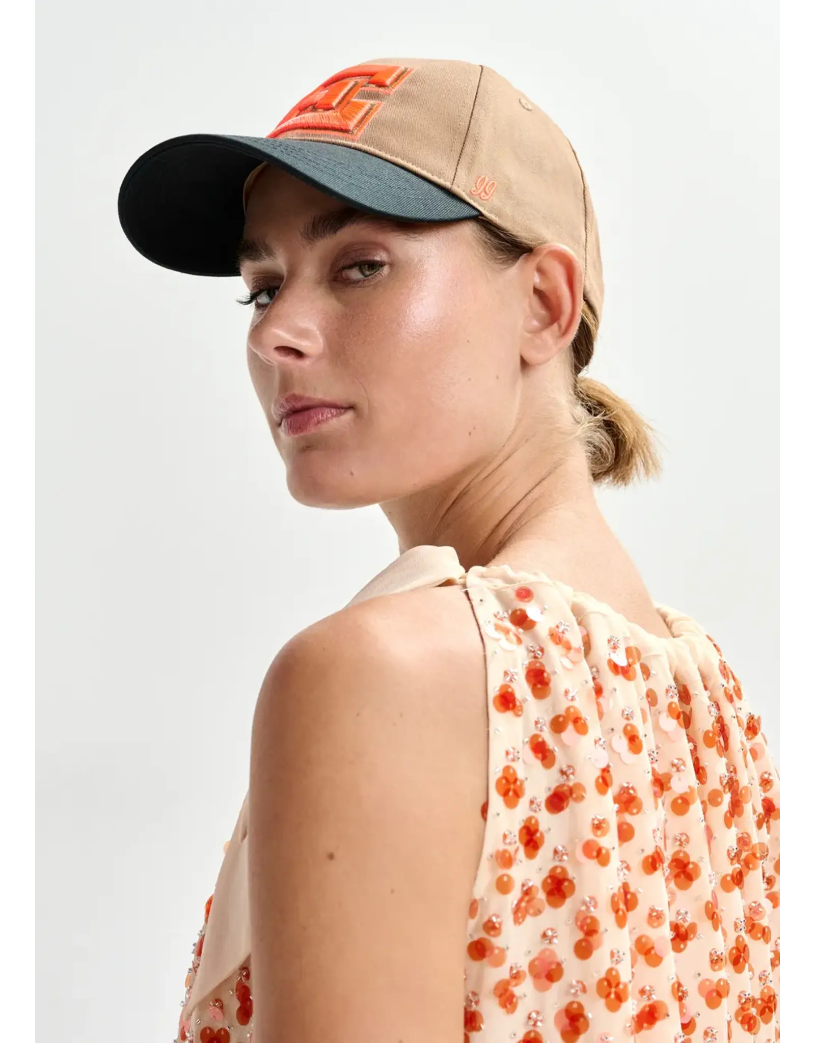 Baseballpet vervaardigd van stevig katoenen canvas en versierd met een opvallende geborduurde 'E' op de voorkant. Het tweekleurige ontwerp zorgt voor een moderne uitstraling, terwijl een kleine '99' geborduurd op de zijkant een subtiel detail toevoegt. De regelbare velcrosluiting achteraan zorgt dat hij goed blijft zitten.