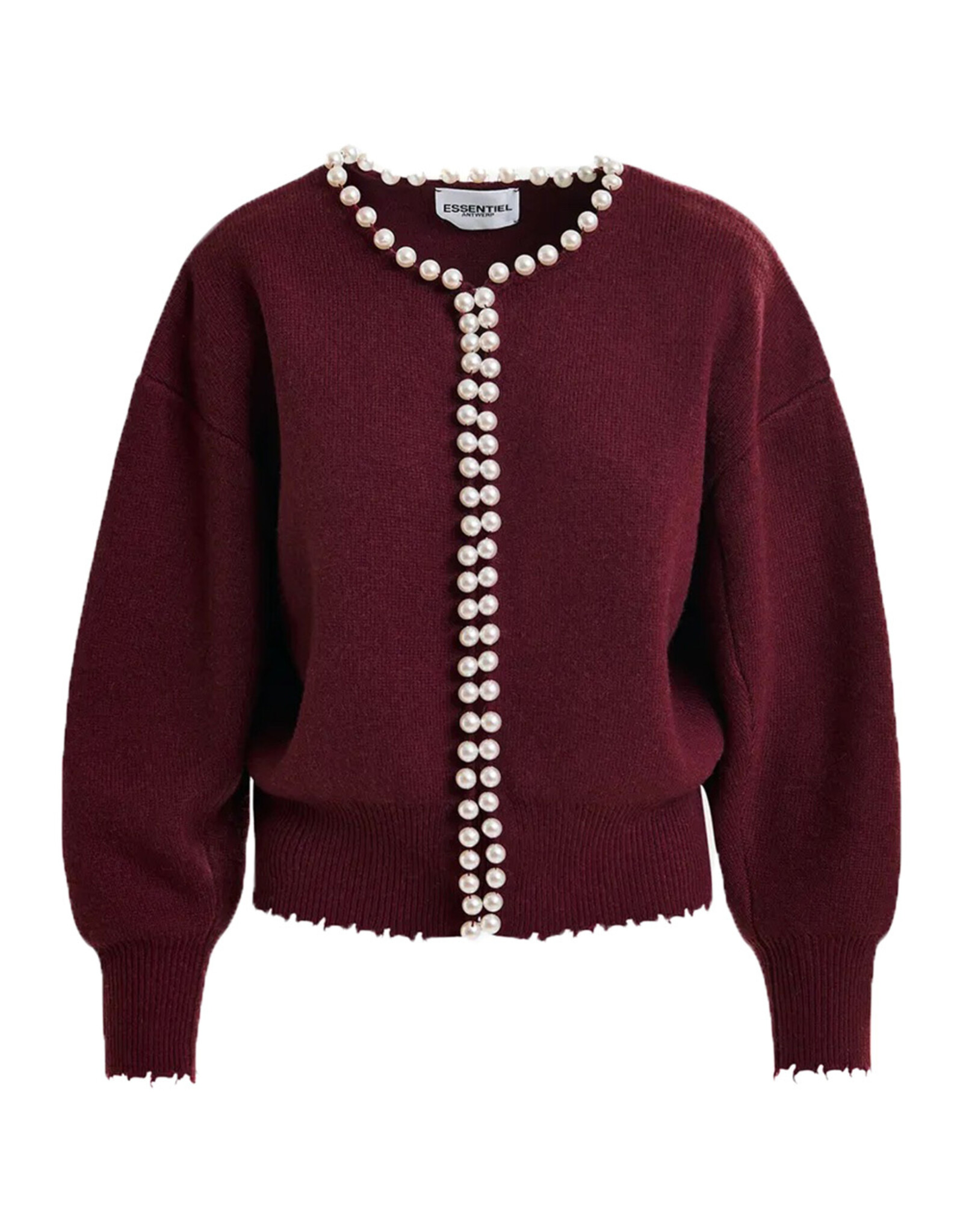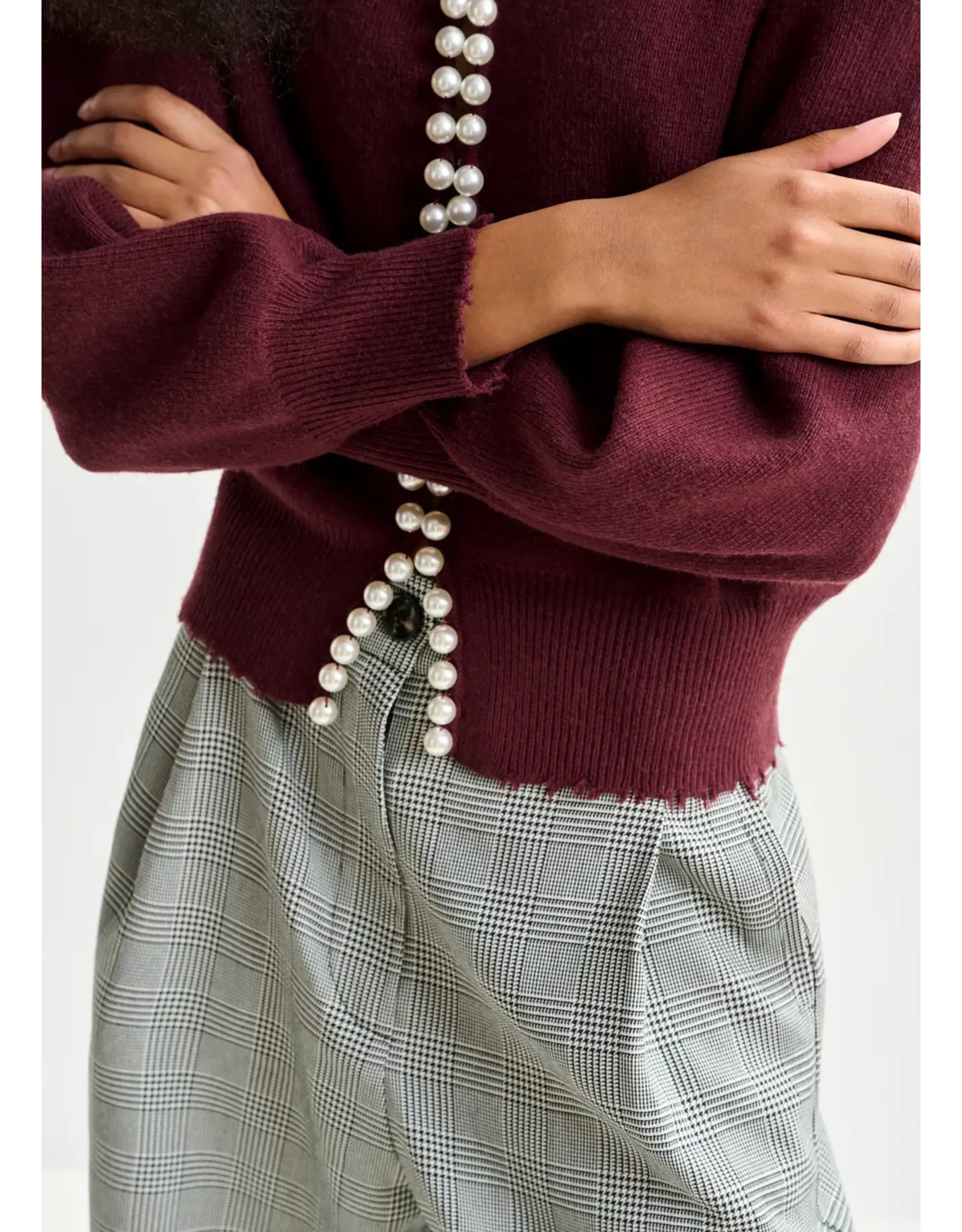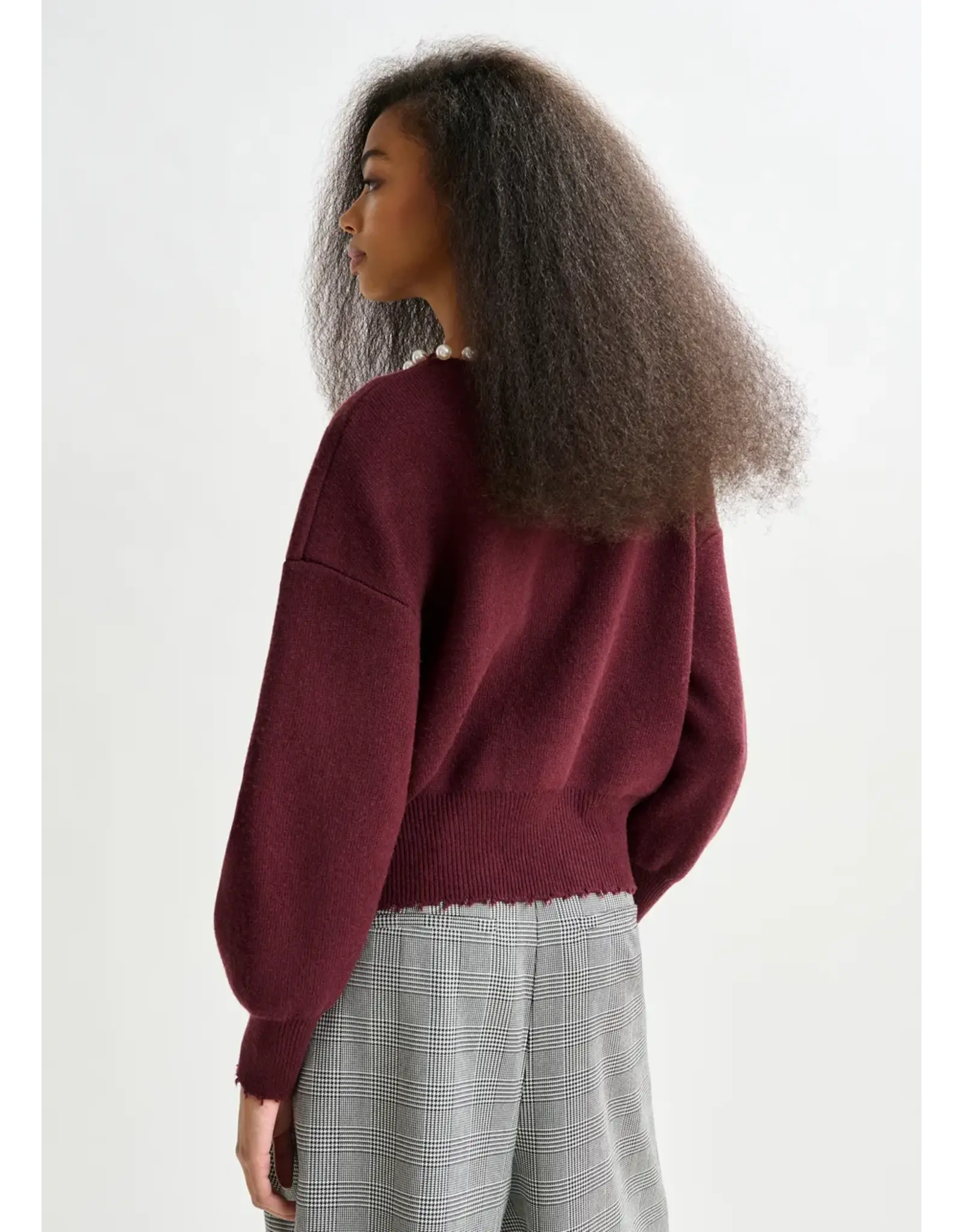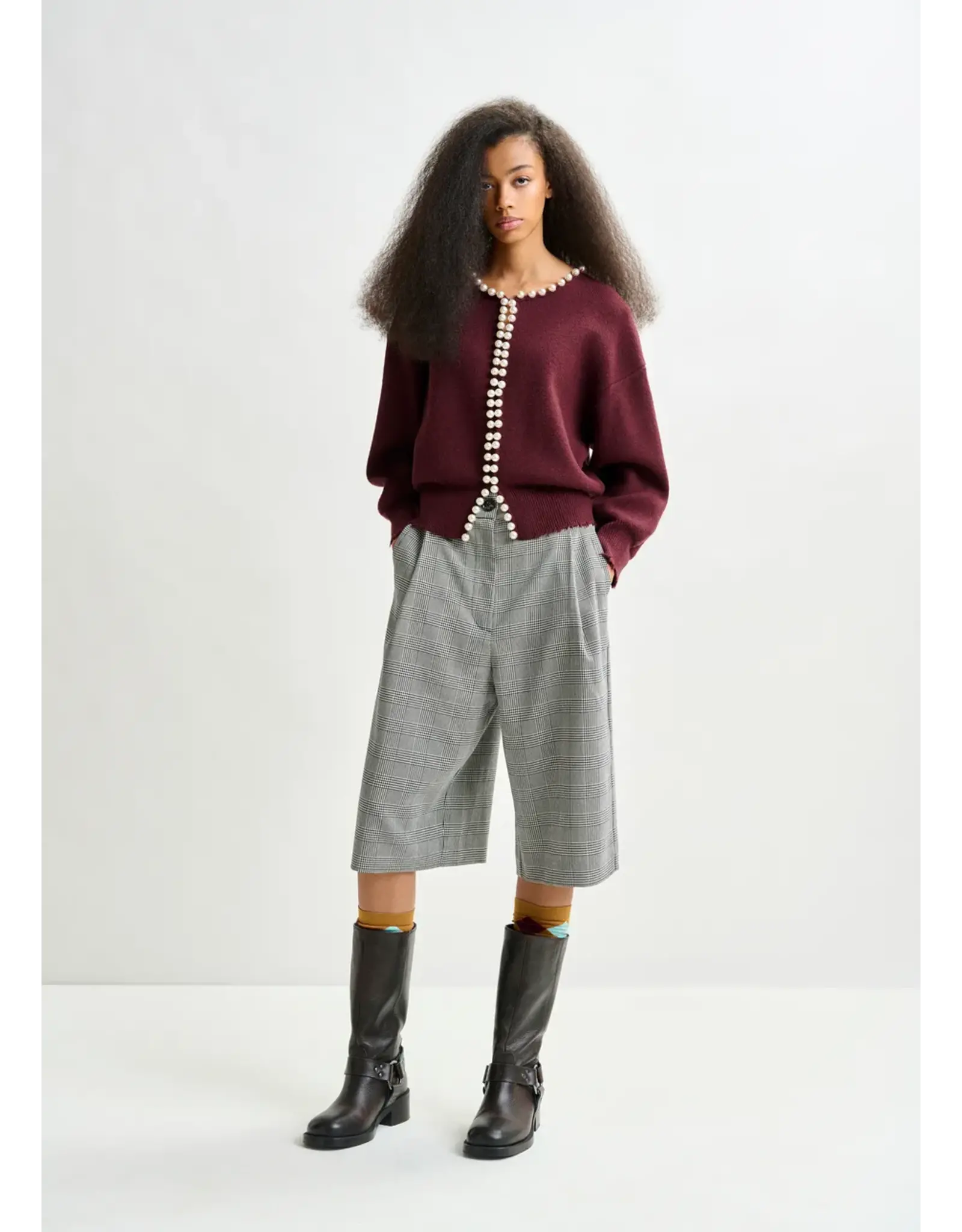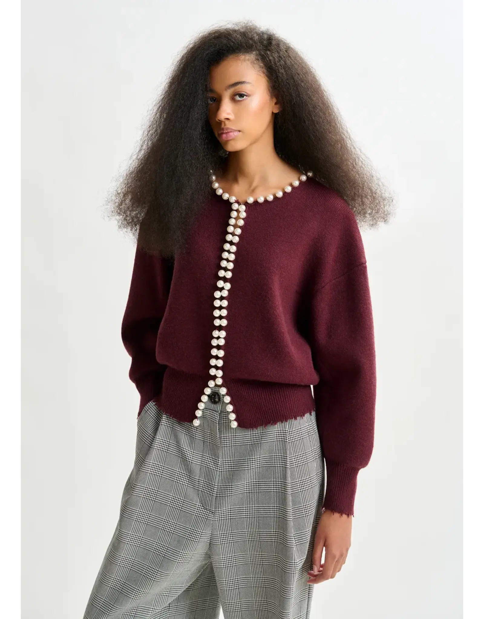 Comfortabele cardigan met relaxte pasvorm, die nog wordt versterkt door een lage mouwinzet en volumineuze mouwen. Parelversieringen langs de halslijn en de opening vooraan zorgen voor een vleugje elegantie. Met zijn ronde halslijn, gerafelde boorden en discrete haak- en oogsluiting, is deze cardigan een chic en handig extra laagje voor elke gelegenheid.