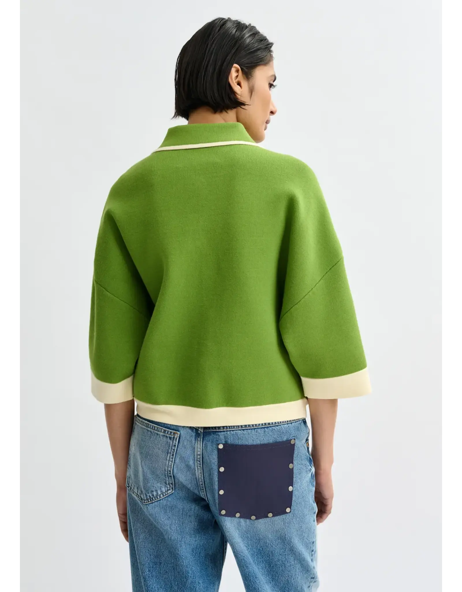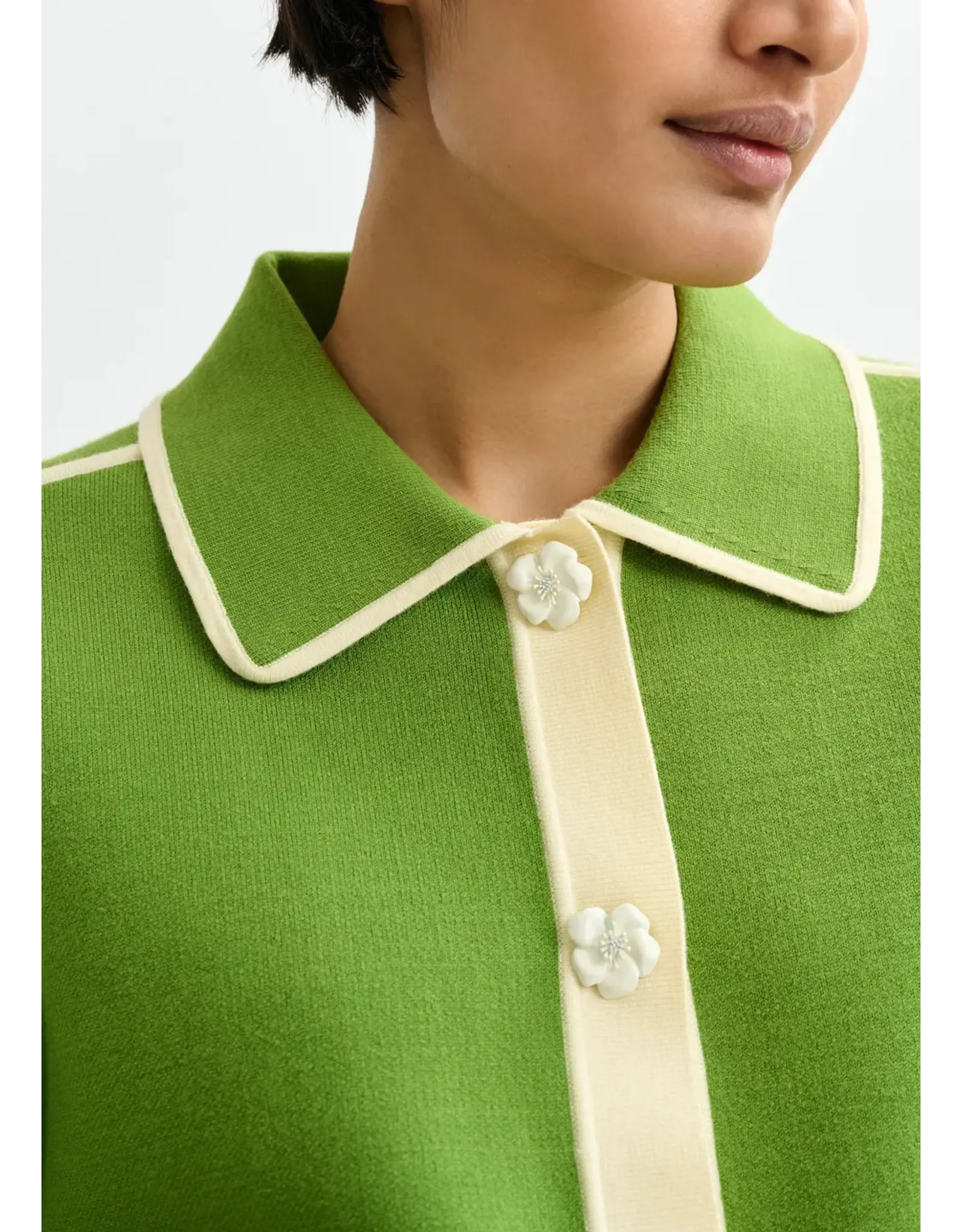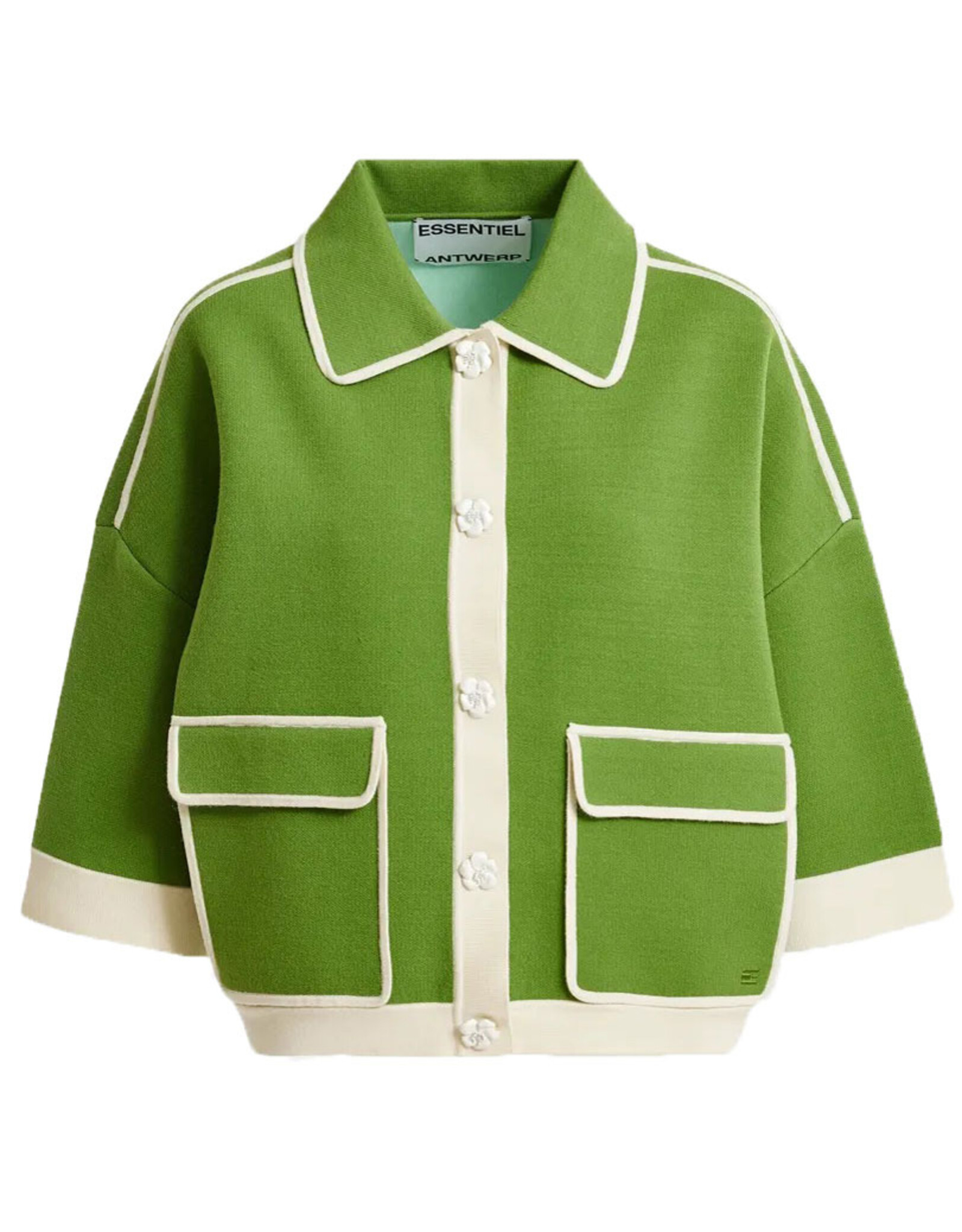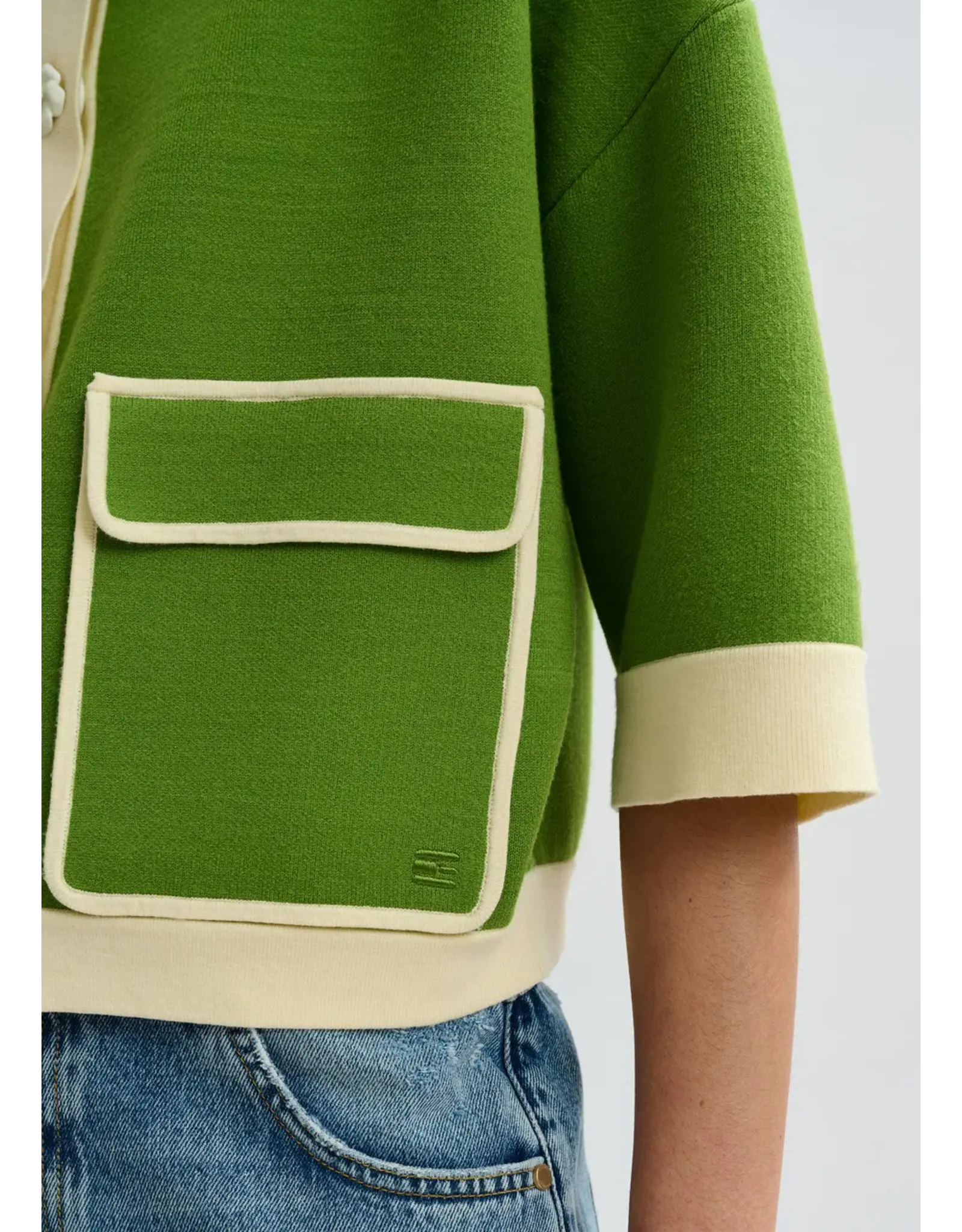 Cardigan vervaardigd van fijn breiwerk met gerecyclede polyester voor een licht gevoel. Hij is ontworpen in een relaxte pasvorm met schattige bloemetjesdrukknopen en een opvallende contrastboord als speelse toets. Afgewerkt met klepzakken en 3/4-mouwen. Altijd handig als extra laagje over jouw outfit.
