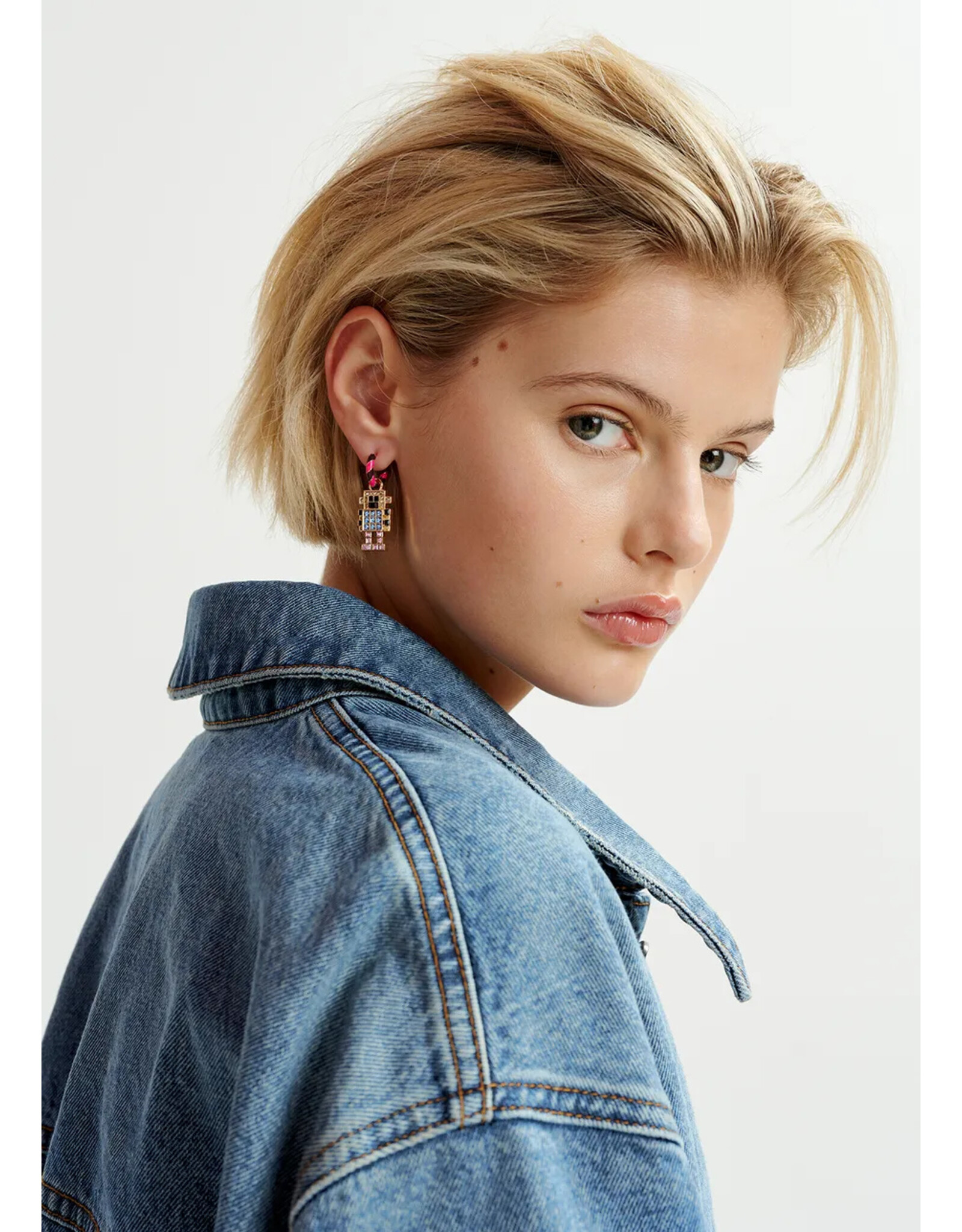 Met deze hoepeloorbellen van Essentiel Antwerp sla je de bal nooit mis: de ene heeft als hanger een robot bezet met stras en de andere een tennisbal in email.