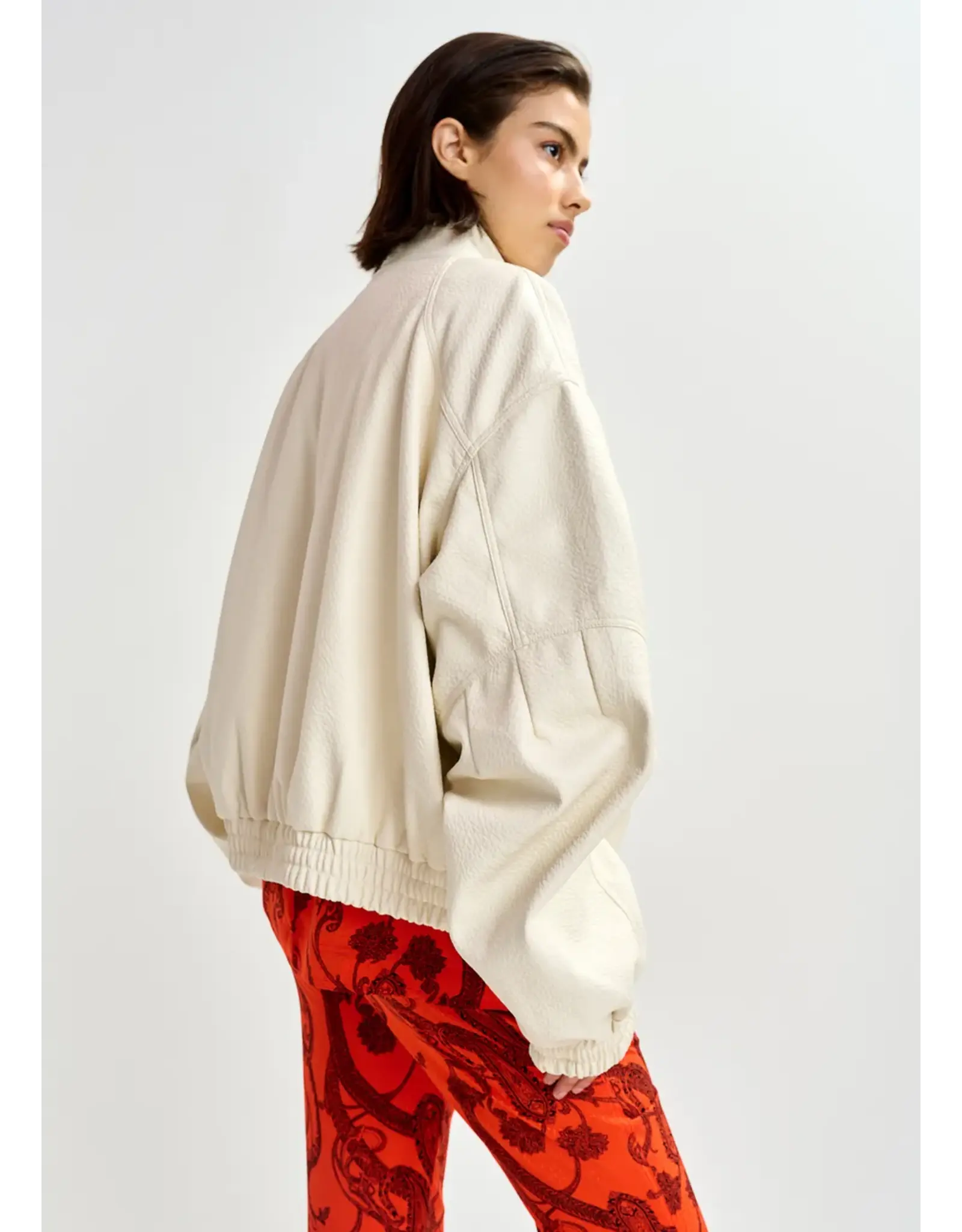 Oversized bomberjack vervaardigd van soepel faux leer met een hoge kraag, een ritssluiting en inzetstukken die het silhouet structuur geven. Twee ingezette borstzakken, waarvan één met klep en ritsdetail, worden in evenwicht gehouden door schuine steekzakken opzij voor extra gemak en functionaliteit. Afgewerkt met een gewatteerde en doorgestikte voering voor een aangenaam gevoel van comfort en volume.