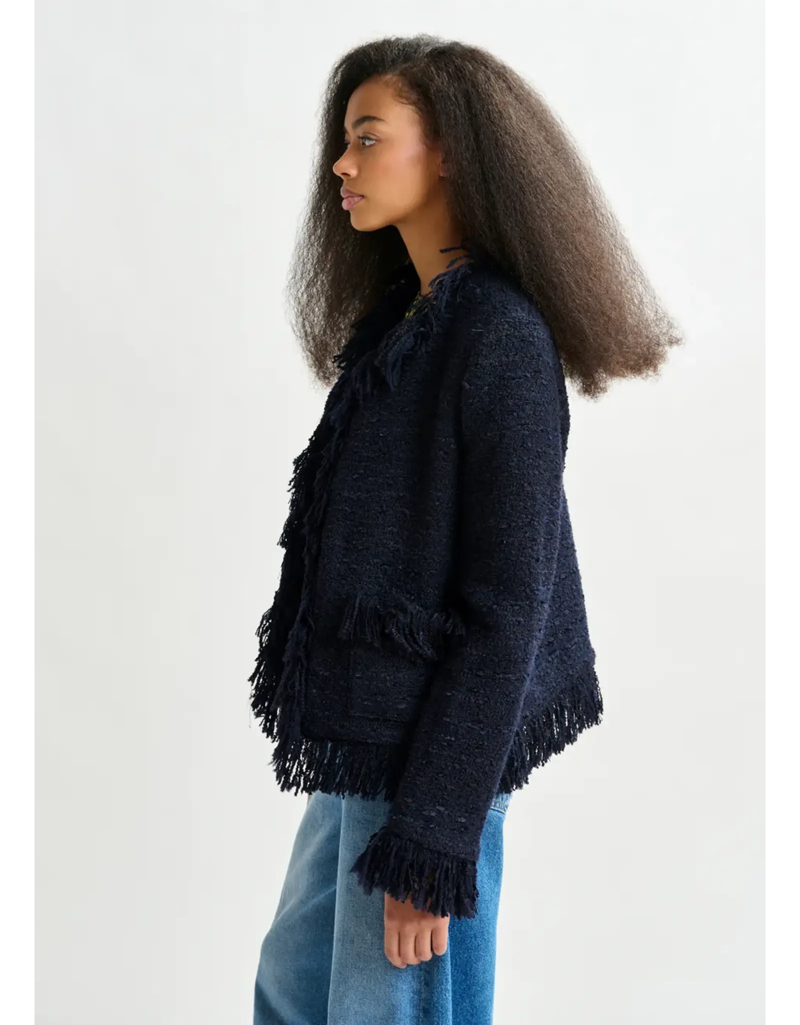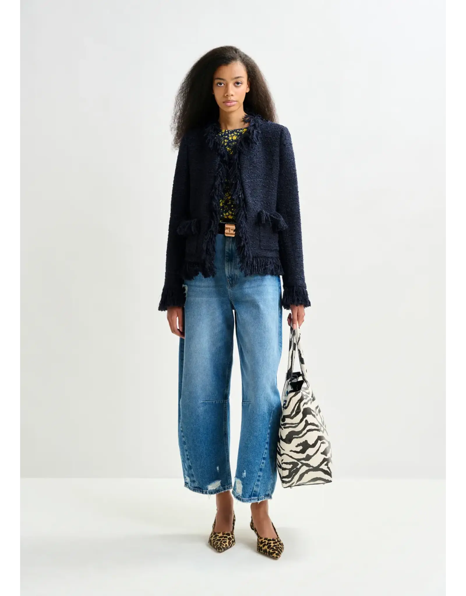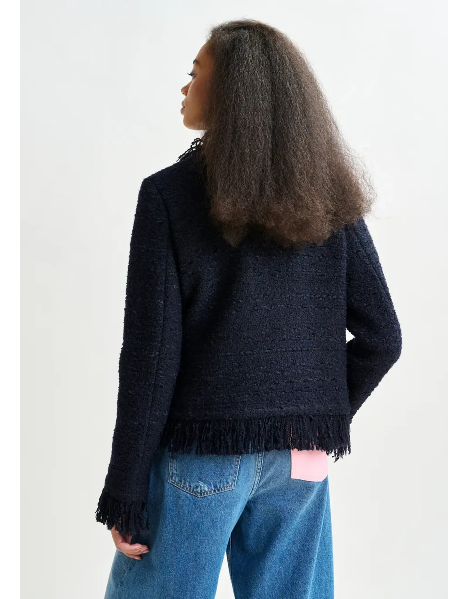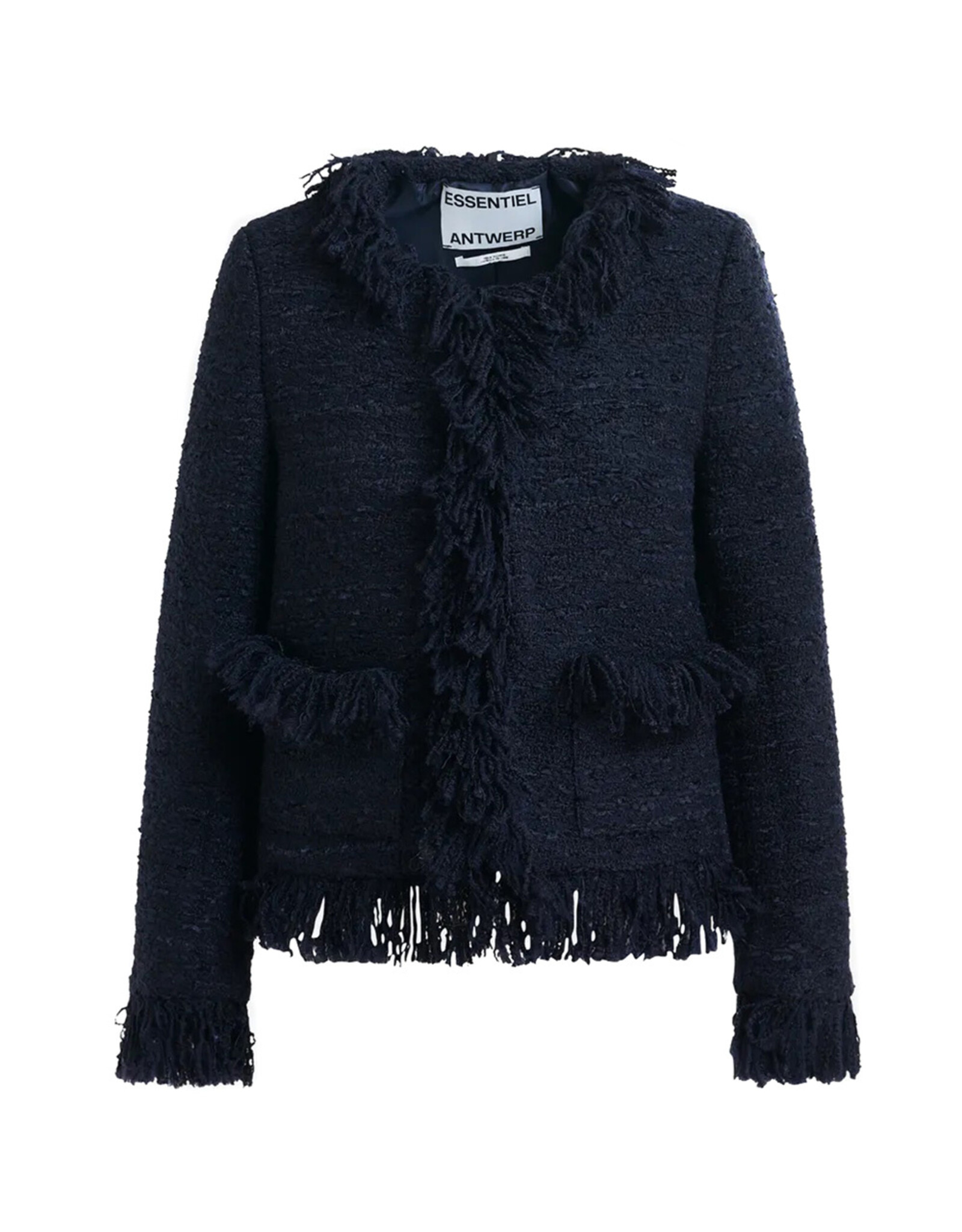 Dit jasje is gemaakt van een gestructureerde wolmix en heeft een boxy silhouet en een nauwsluitende pasvorm. De stof wordt geaccentueerd met speelse franjes langs de kraag, sluiting, manchetten, zoom en opgestikte zakken - voor een zachte beweging en subtiel contrast. Het is volledig gevoerd voor een soepele pasvorm en sluit discreet met haak- en oogsluitingen. Combineer hem met een pantalon of jeans voor een moeiteloos verfijnde look.