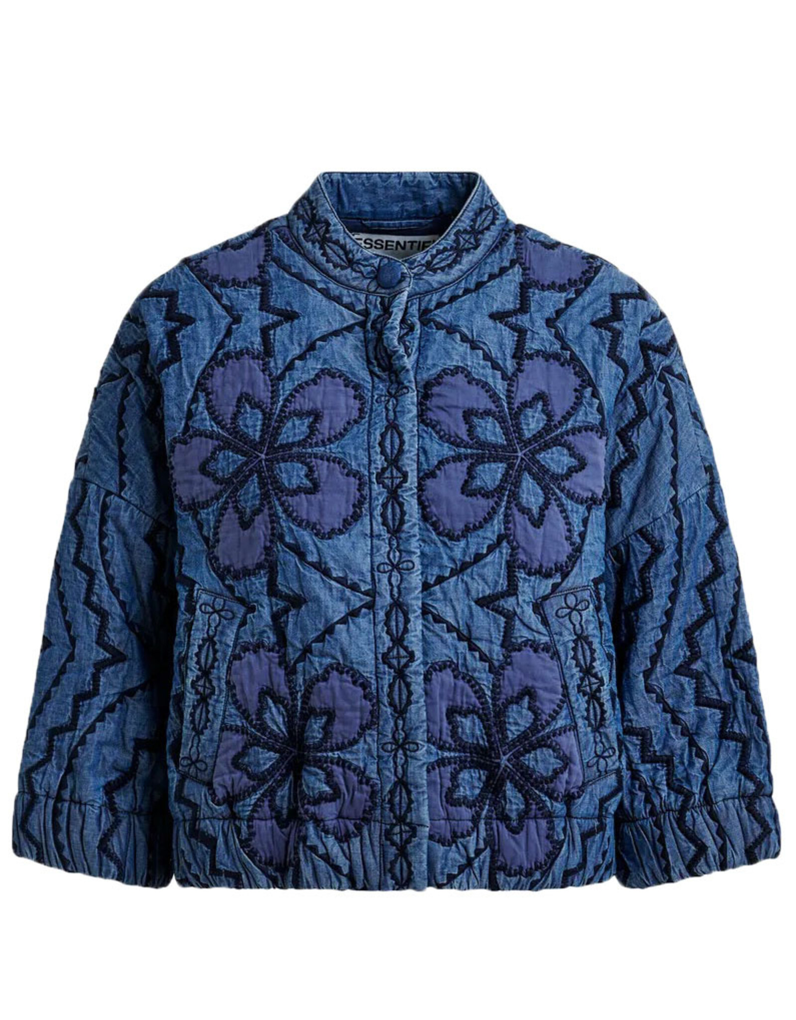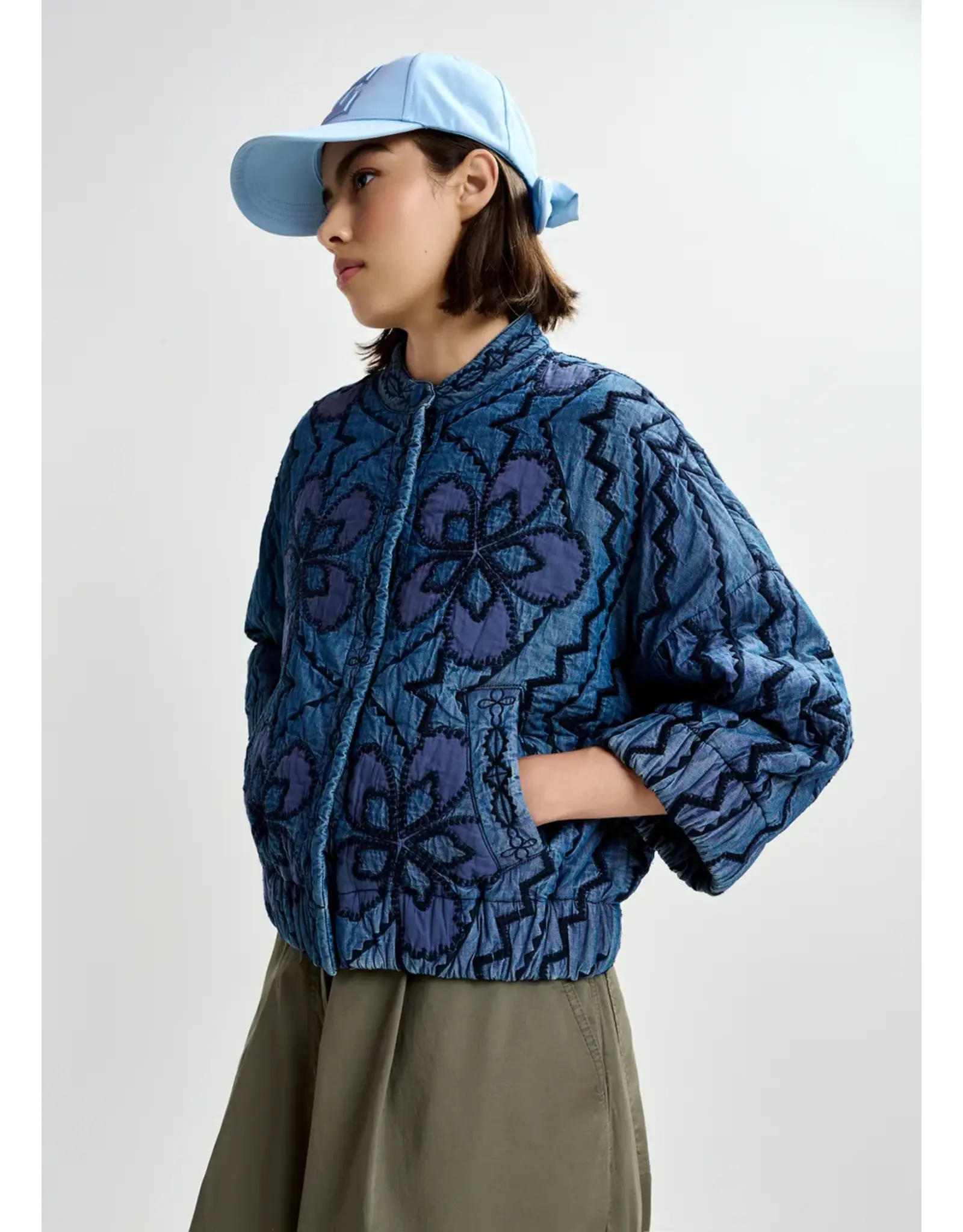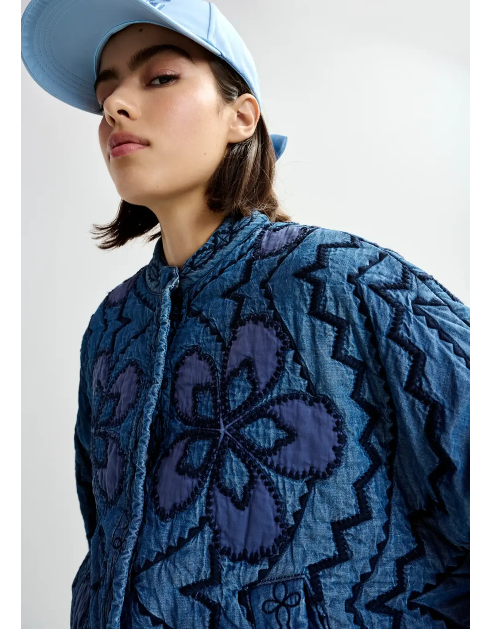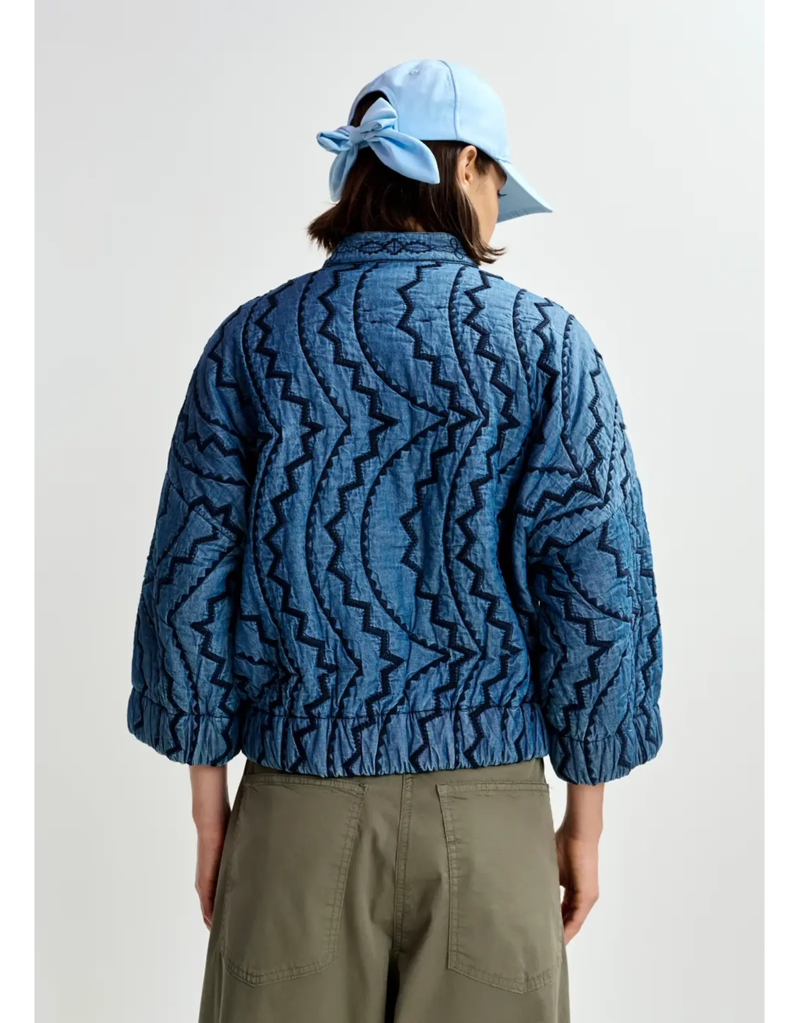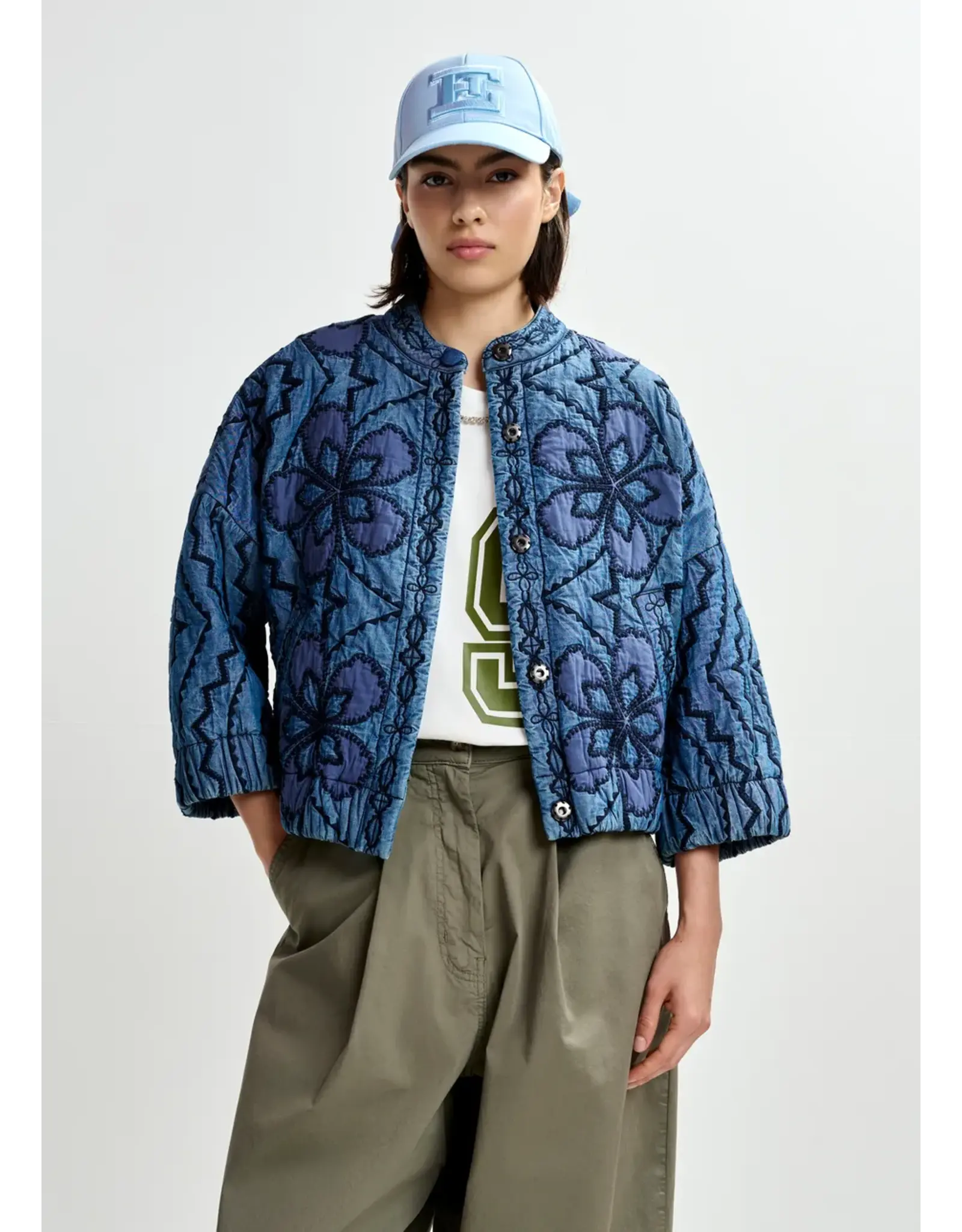 Jeansvest vervaardigd van 100% katoen en geborduurd met delicate bloemmotieven. Het is ontworpen in een korte pasvorm met elastische zoom en lage mouwinzet voor een subtiel volume, gebalanceerd door volumineuze 3/4-mouwen met elastische uiteinden. De maokraag is afgewerkt met één zichtbare, met stof bedekte knoop, terwijl de drukknoopsluiting zorgt voor een nette en ingetogen voorkant. Schuine zakken en een zachte voering zorgen voor doordachte structuur en comfort.