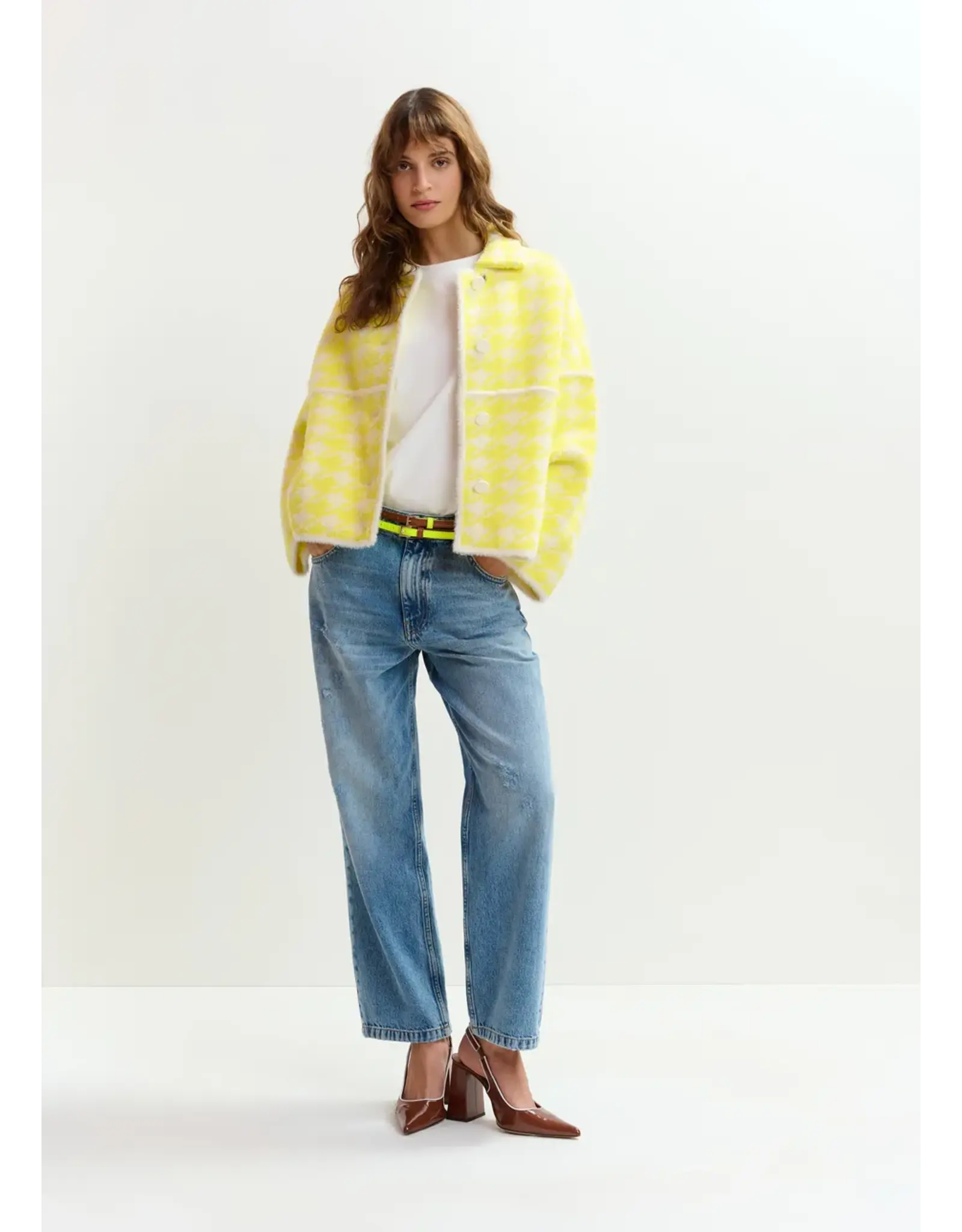 as vervaardigd van een middelzwaar gebreide stof met zachte tactiele afwerking in een relaxte pasvorm die soepel valt. Het opvallende pied-de-poule-patroon zorgt voor een speels grafisch kantje, terwijl de strakke knoopsluiting en gestructureerde kraag het silhouet in balans brengen met een vleugje verfijning. Het jasje is afgewerkt met licht gebogen lijnen, subtiele inzetstukken en biedt zowel comfort als karakter.