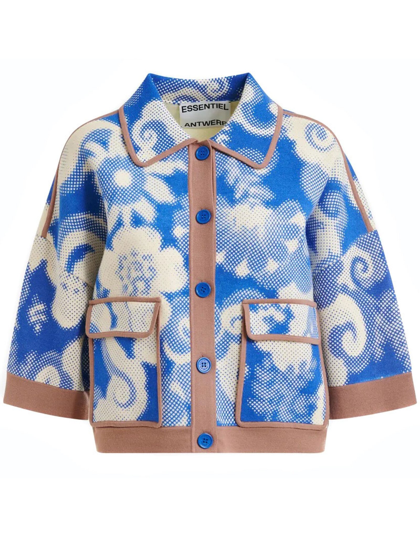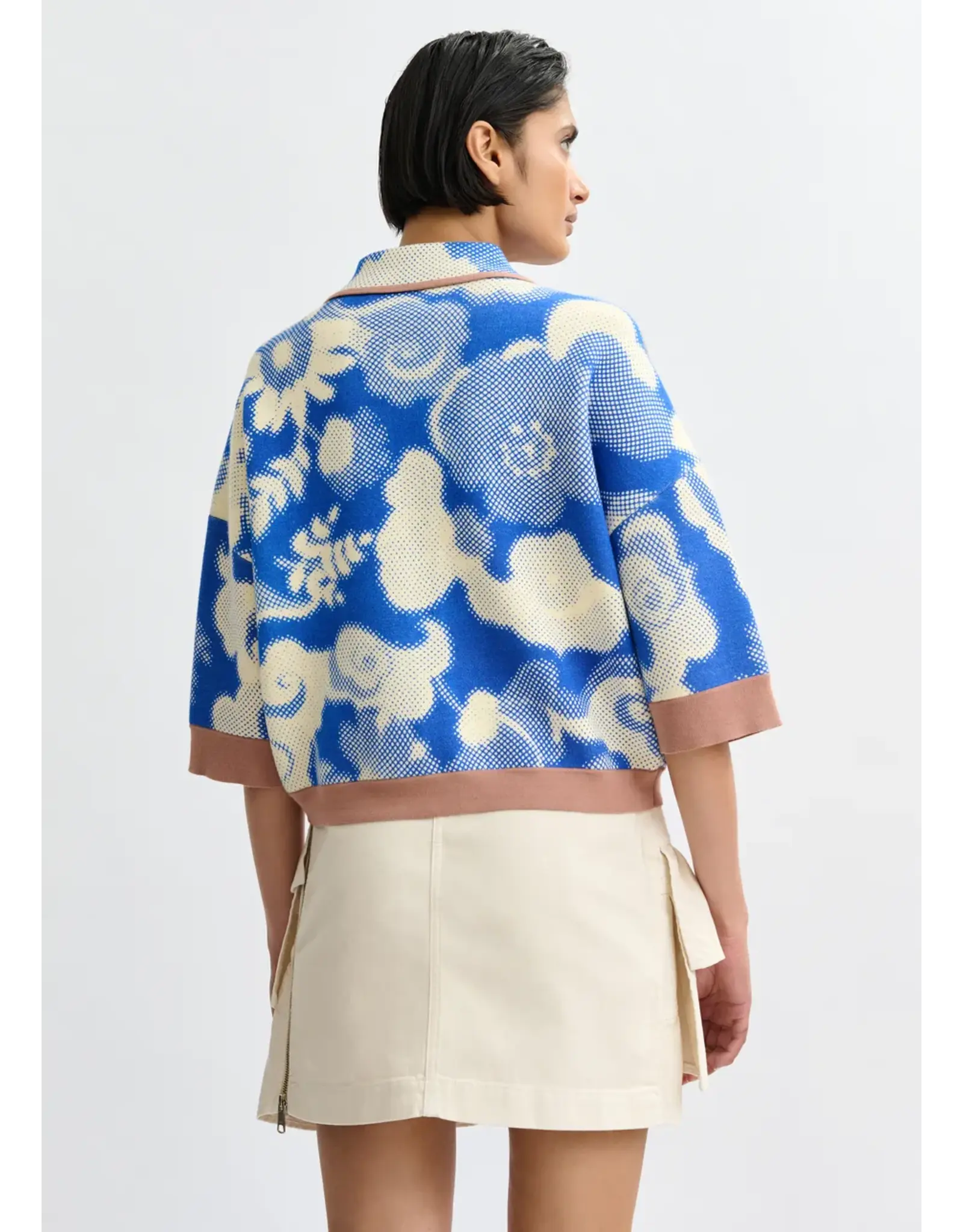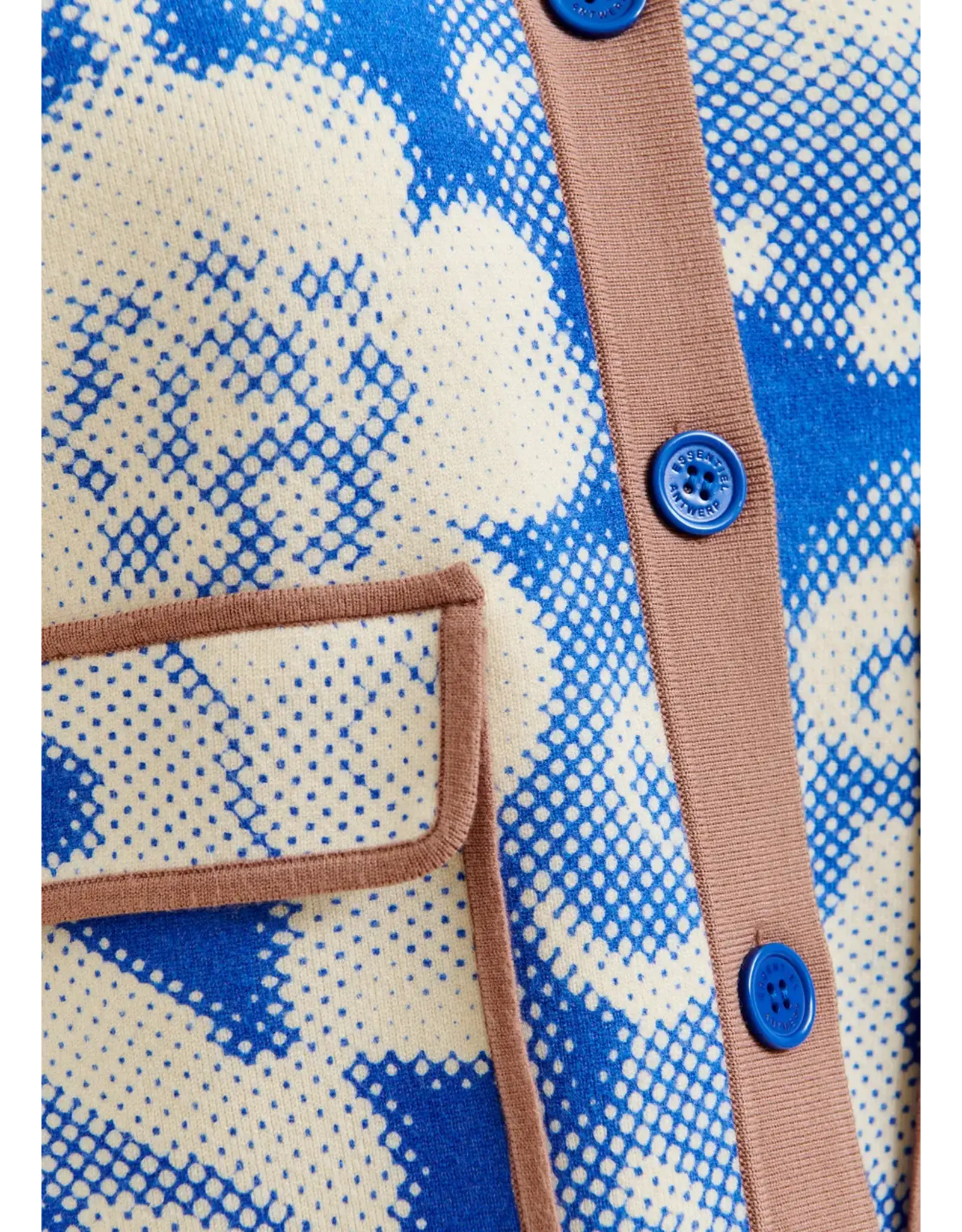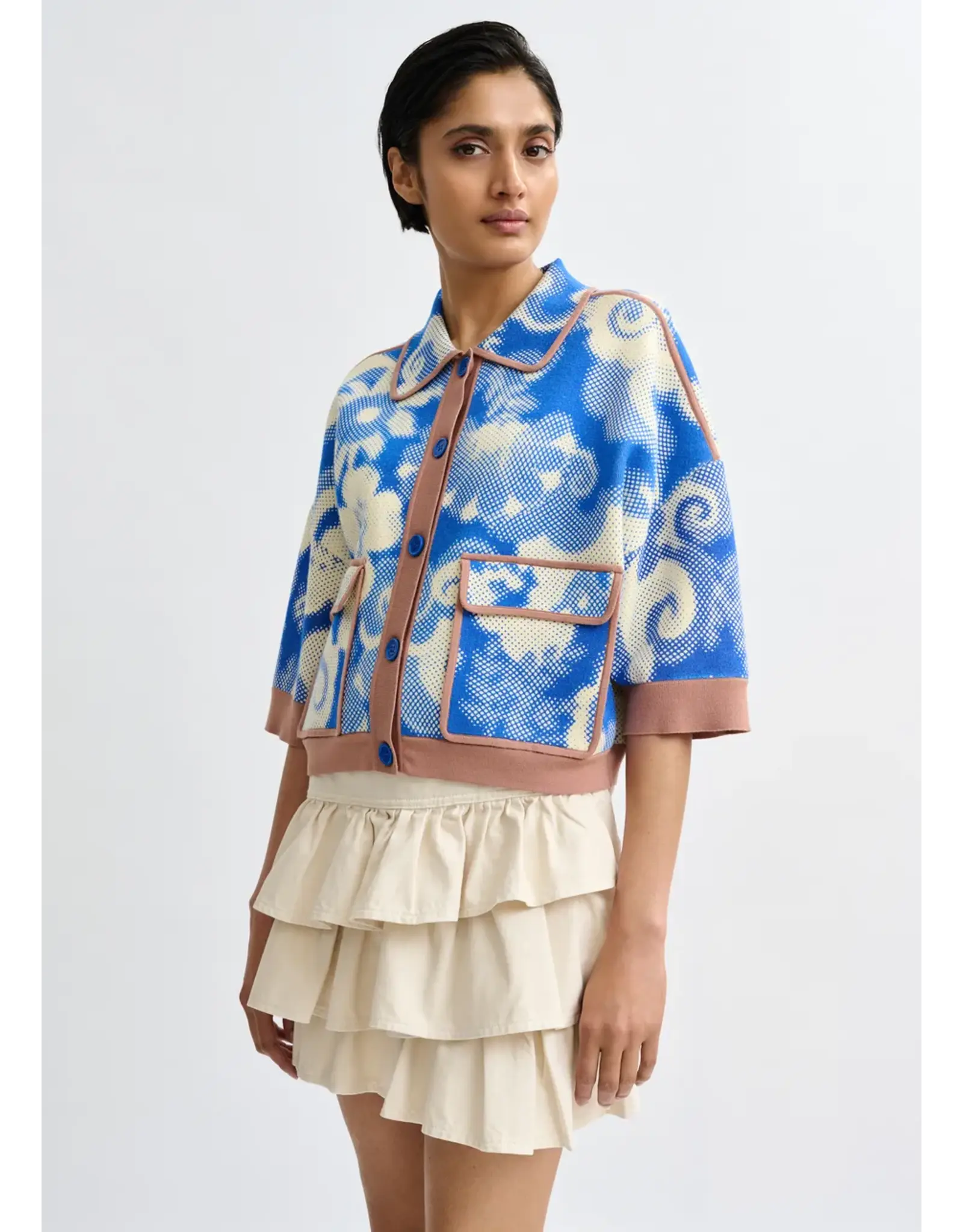 Cardigan vervaardigd van fijn breiwerk voor een licht gevoel en versierd met een subtiel bloemenpatroon dat doet denken aan psychedelische bloemen. Hij is ontworpen in een relaxte pasvorm met knopen en een opvallende contrastboord als speelse toets. Afgewerkt met klepzakken en 3/4-mouwen. Altijd handig als extra laagje over jouw outfit.