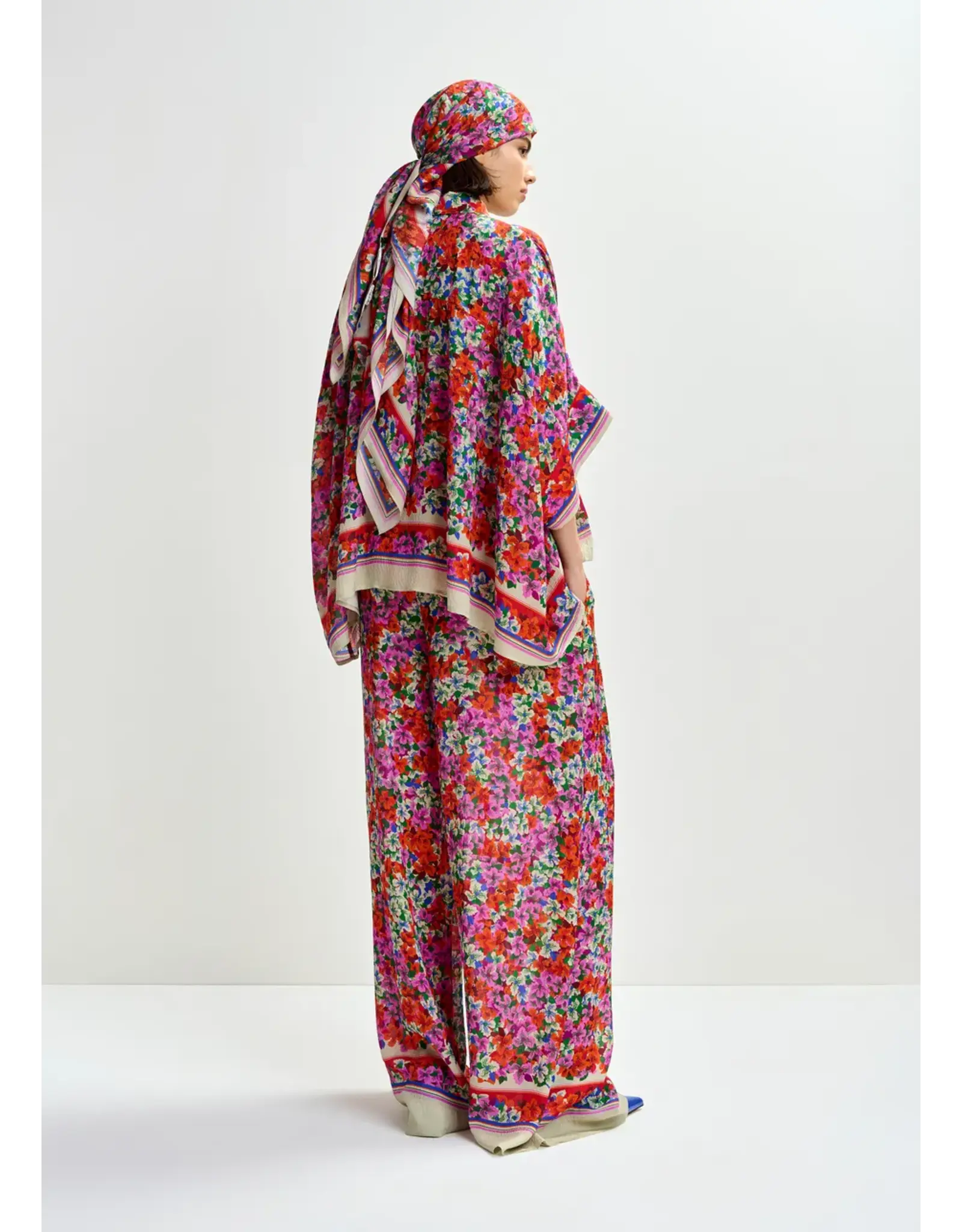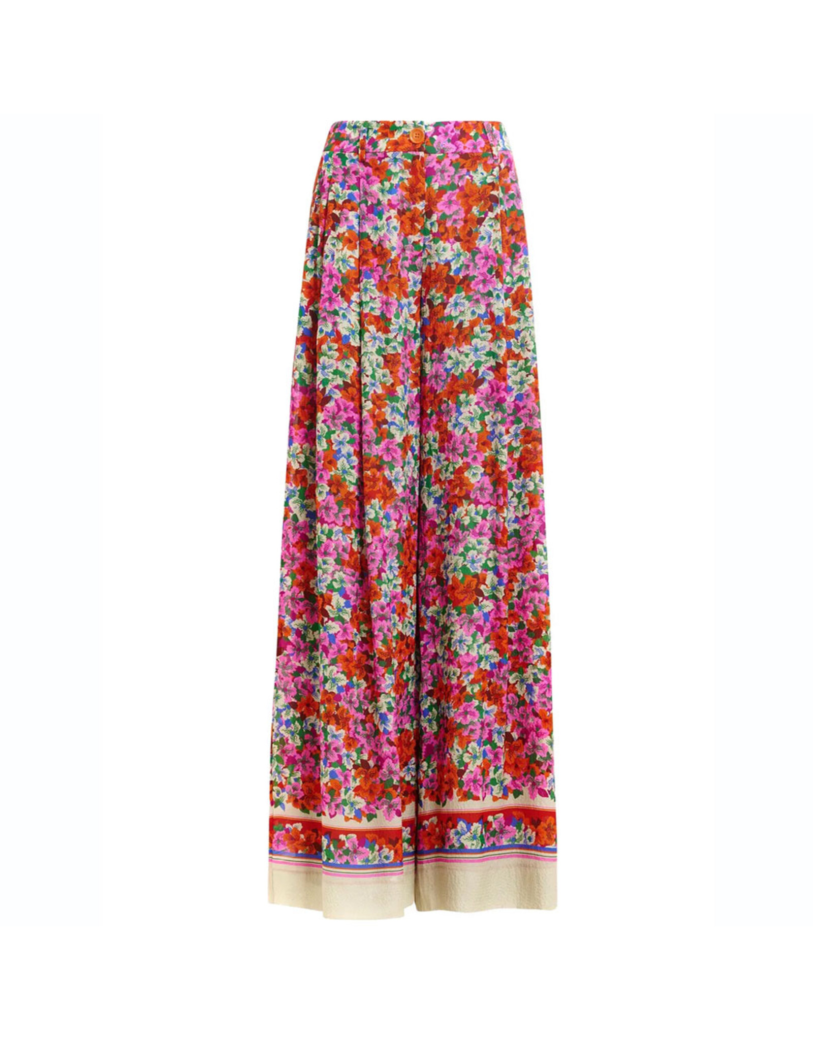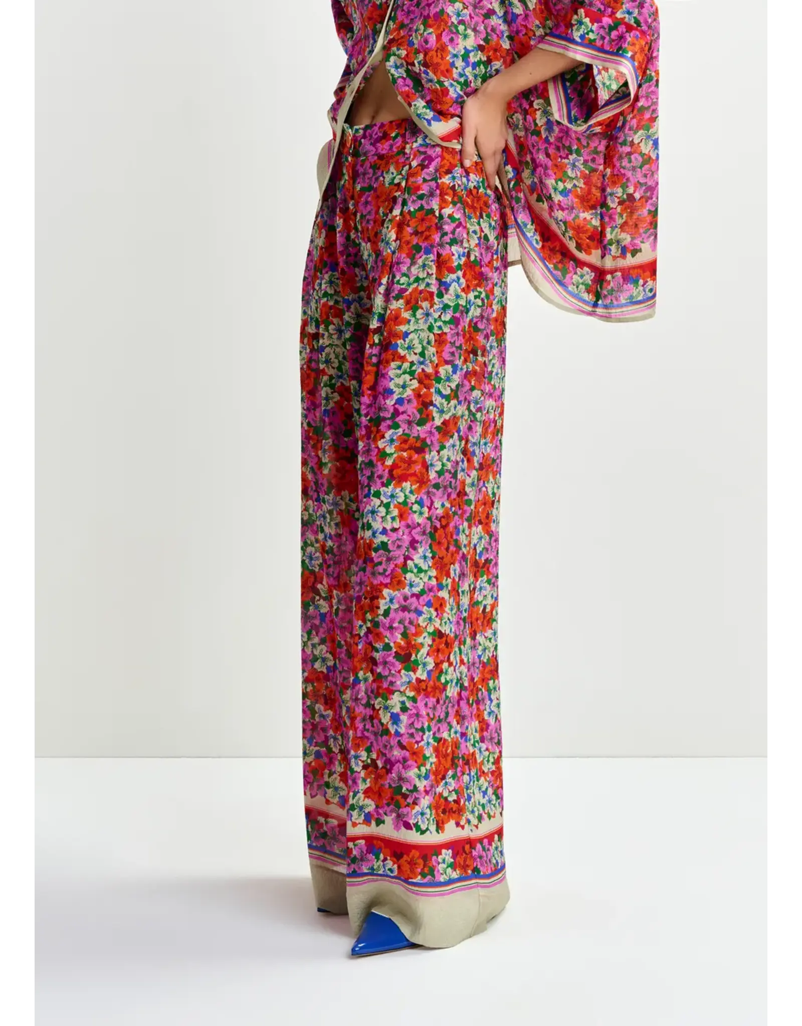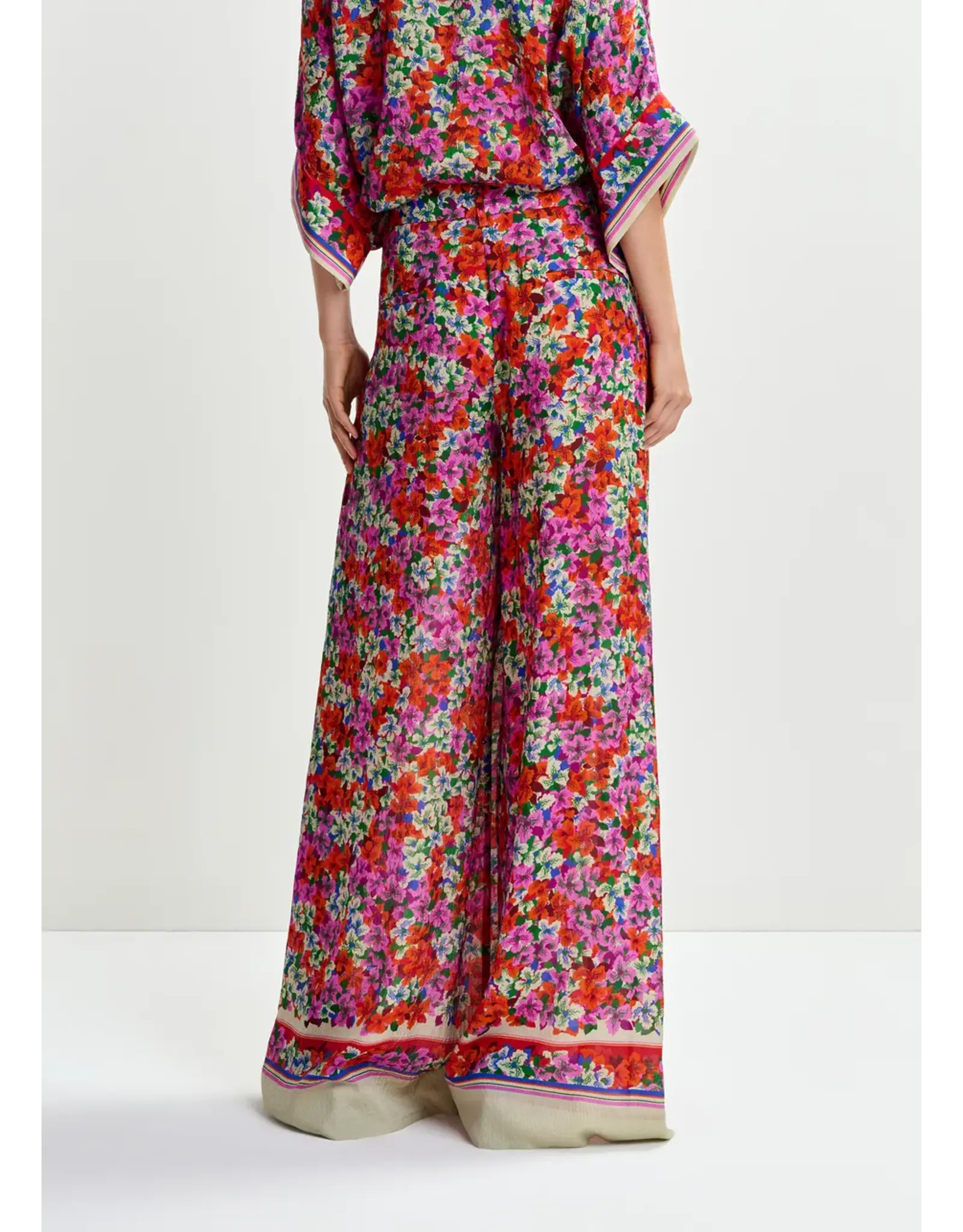 Broek met bloemenprint, vervaardigd van een glanzende zijdemix met gebogen zijnaden langs de brede pijpen. Hij is afgewerkt met twee paspelzakken achteraan, schuine steekzakken vooraan, riemlussen en een rits- en knoopsluiting.