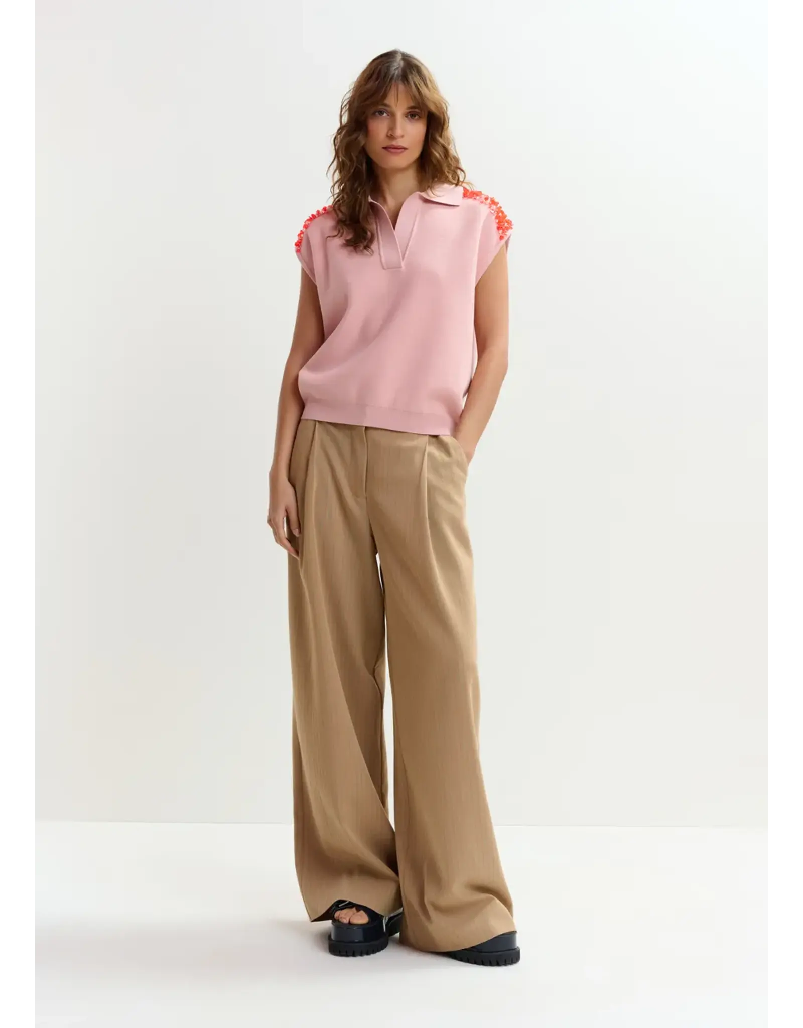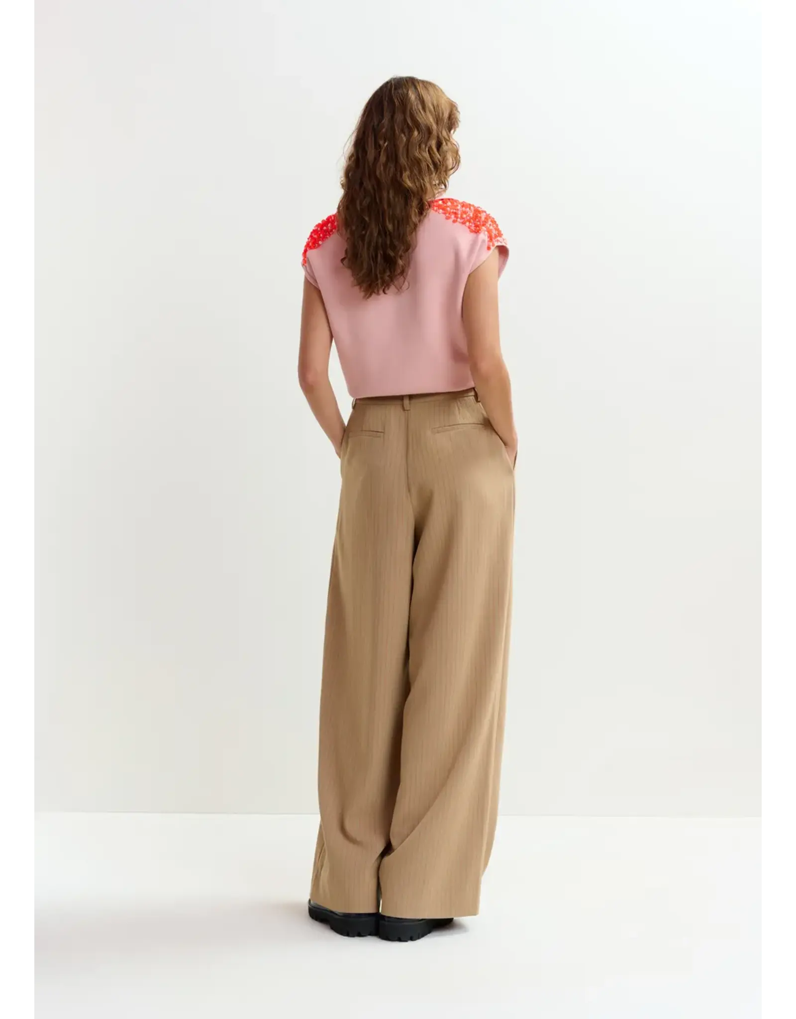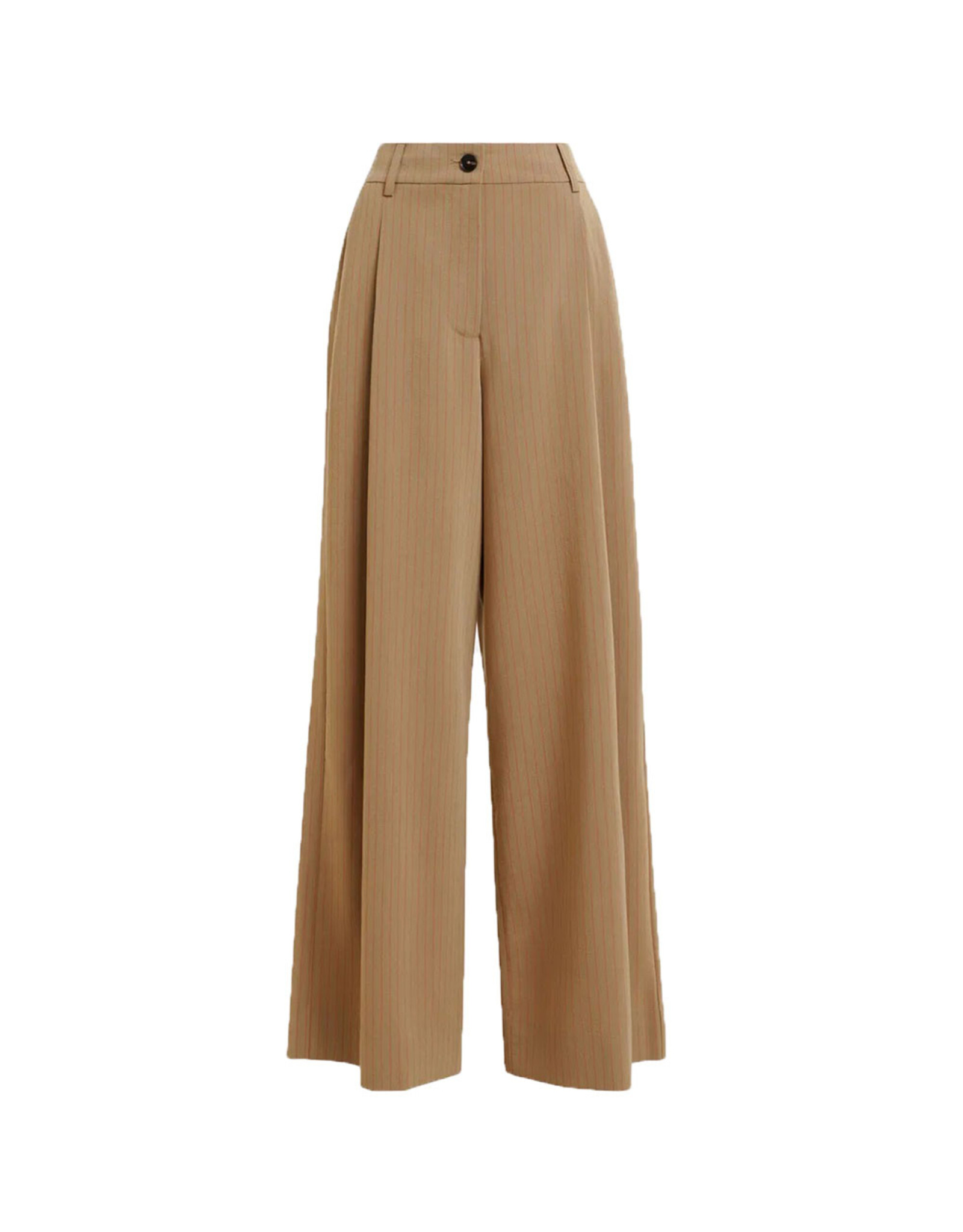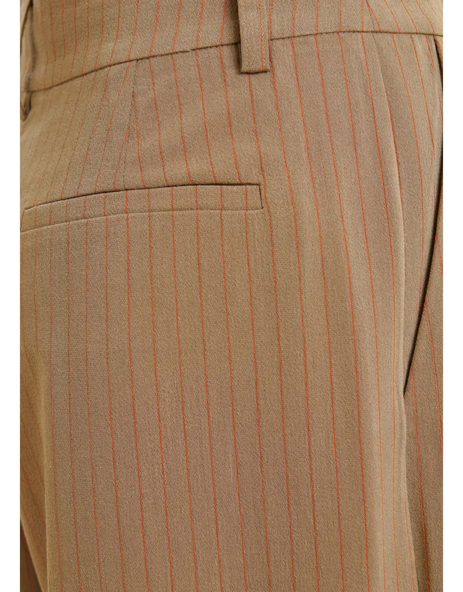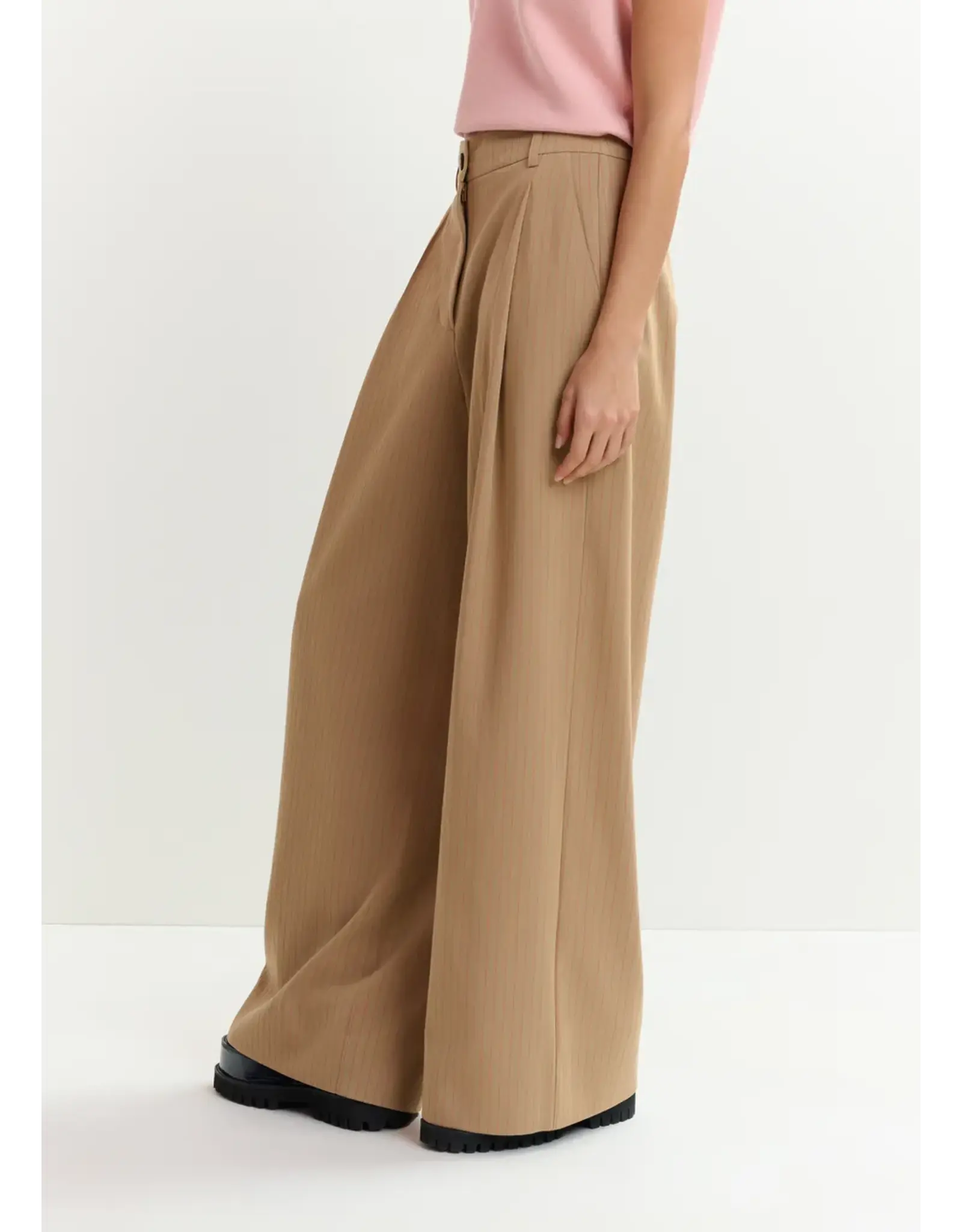 Broek met streepmotief ontworpen met elegante plooien in de taille die overgaan in losvallende brede pijpen. Hij is afgewerkt met schuine voorzakken, twee paspelzakken achteraan en een rits- en knoopsluiting voor een verzorgde uitstraling.