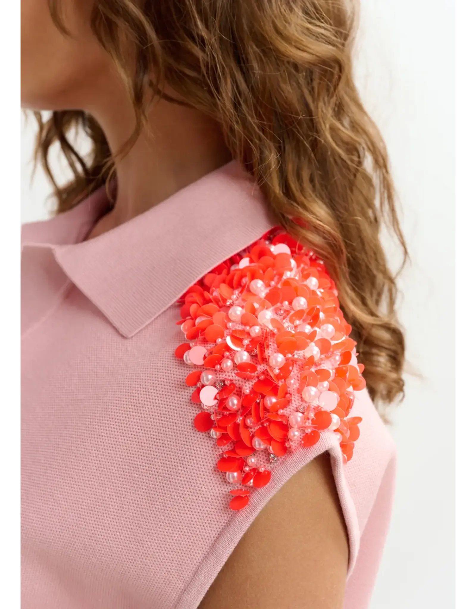 Mouwloze polo in tricot met een relaxte pasvorm en een strak, gestroomlijnd silhouet. Het ontwerp wordt naar een hoger niveau getild met borduurwerk van pailletten en kralen langs de schouders, terwijl de geribbelde zoom onderaan het ontwerp een subtiele dosis structuur geeft.