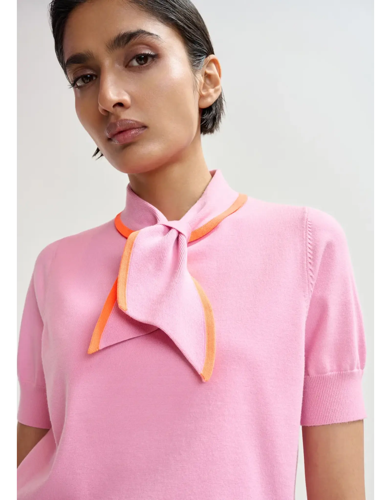 Elegante fijn gebreide polo, vervaardigd van gerecyclede polyester in een relaxte pasvorm. De ribgebreide boorden omlijsten het silhouet en geven het wat structuur. Het opvallende detail – een contrasterende kraag die je als een sjaaltje kan knopen – geeft het klassieke ontwerp een verrassende twist.
