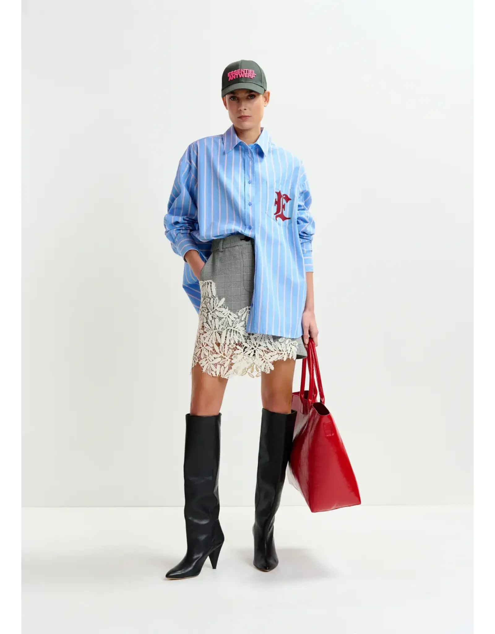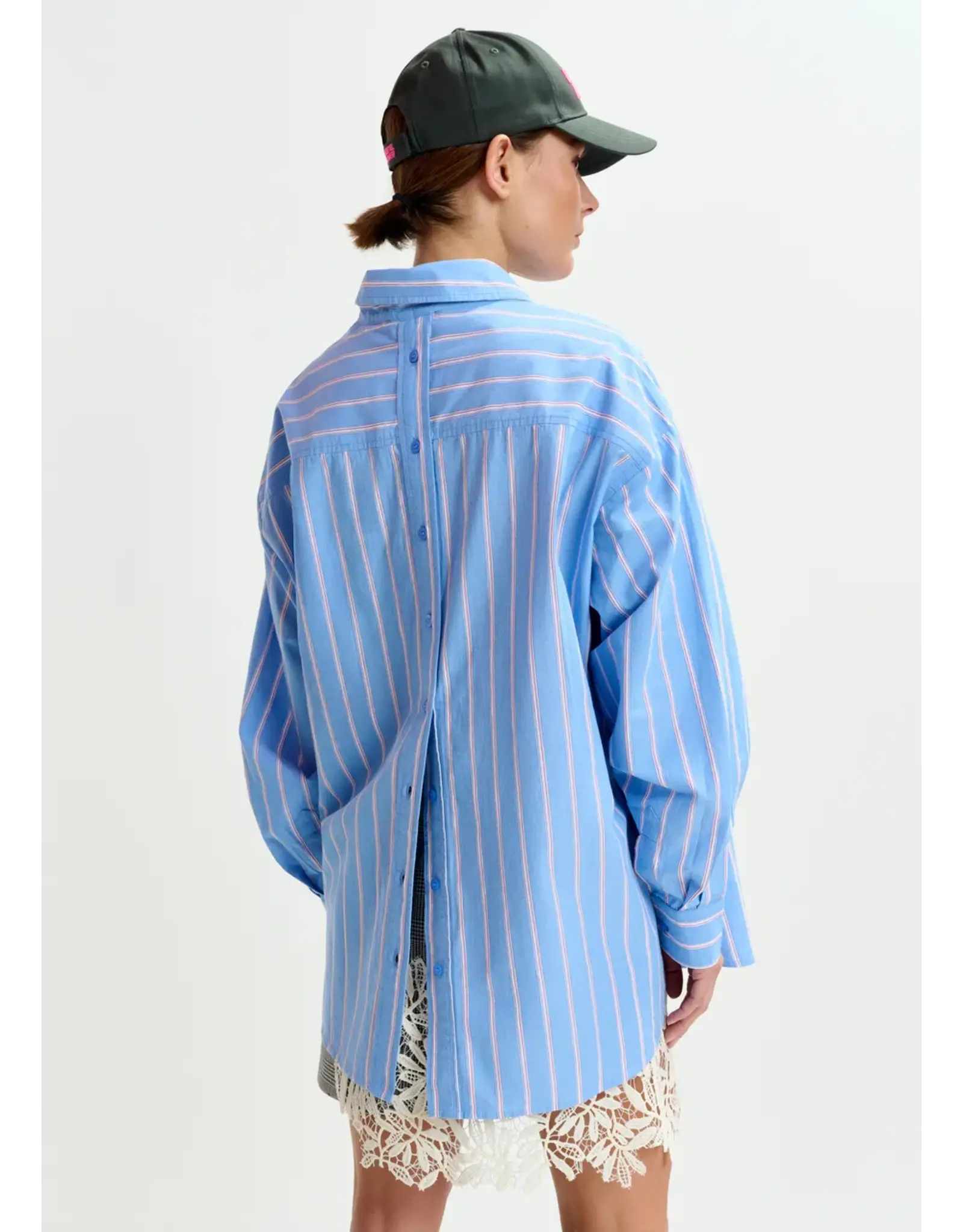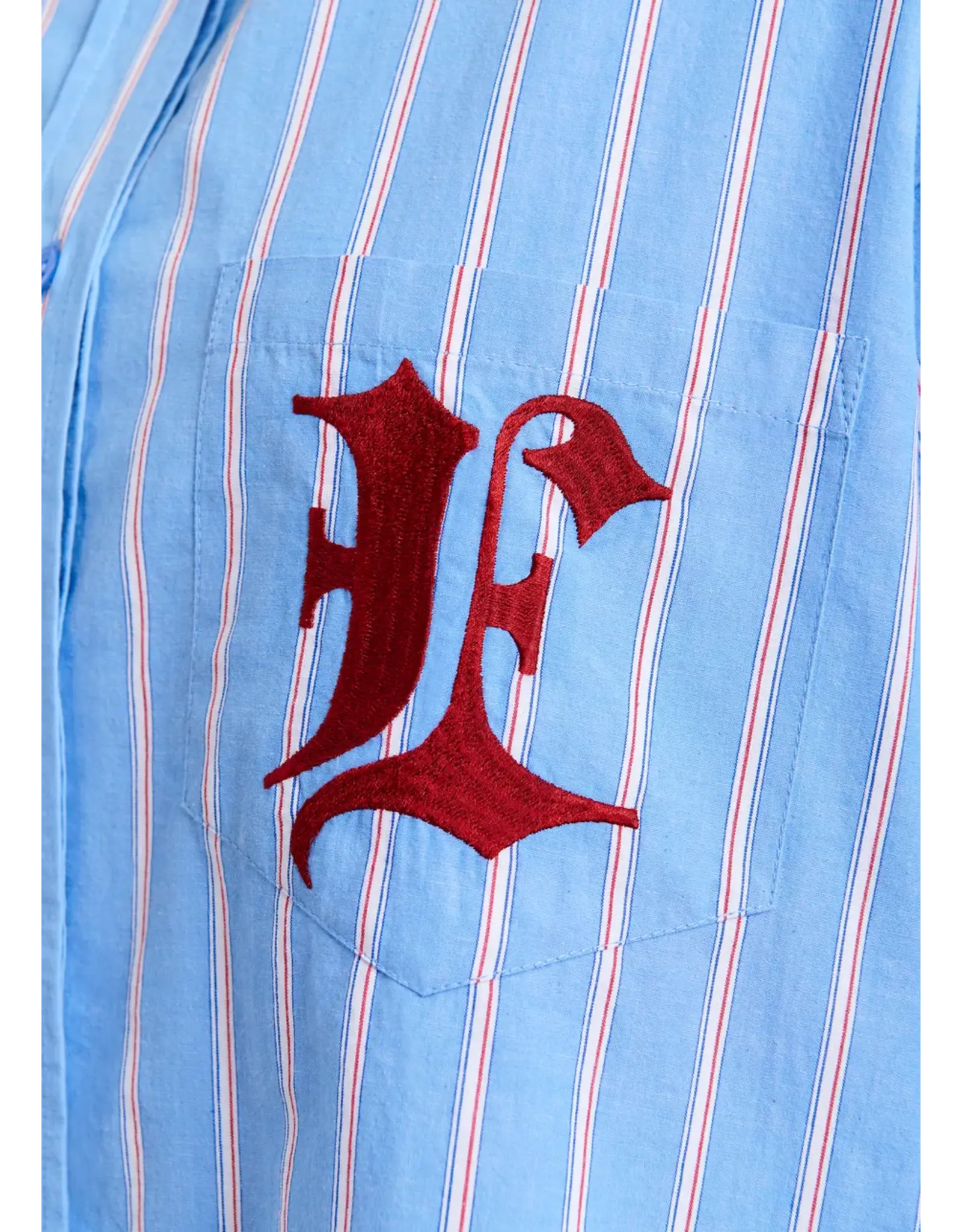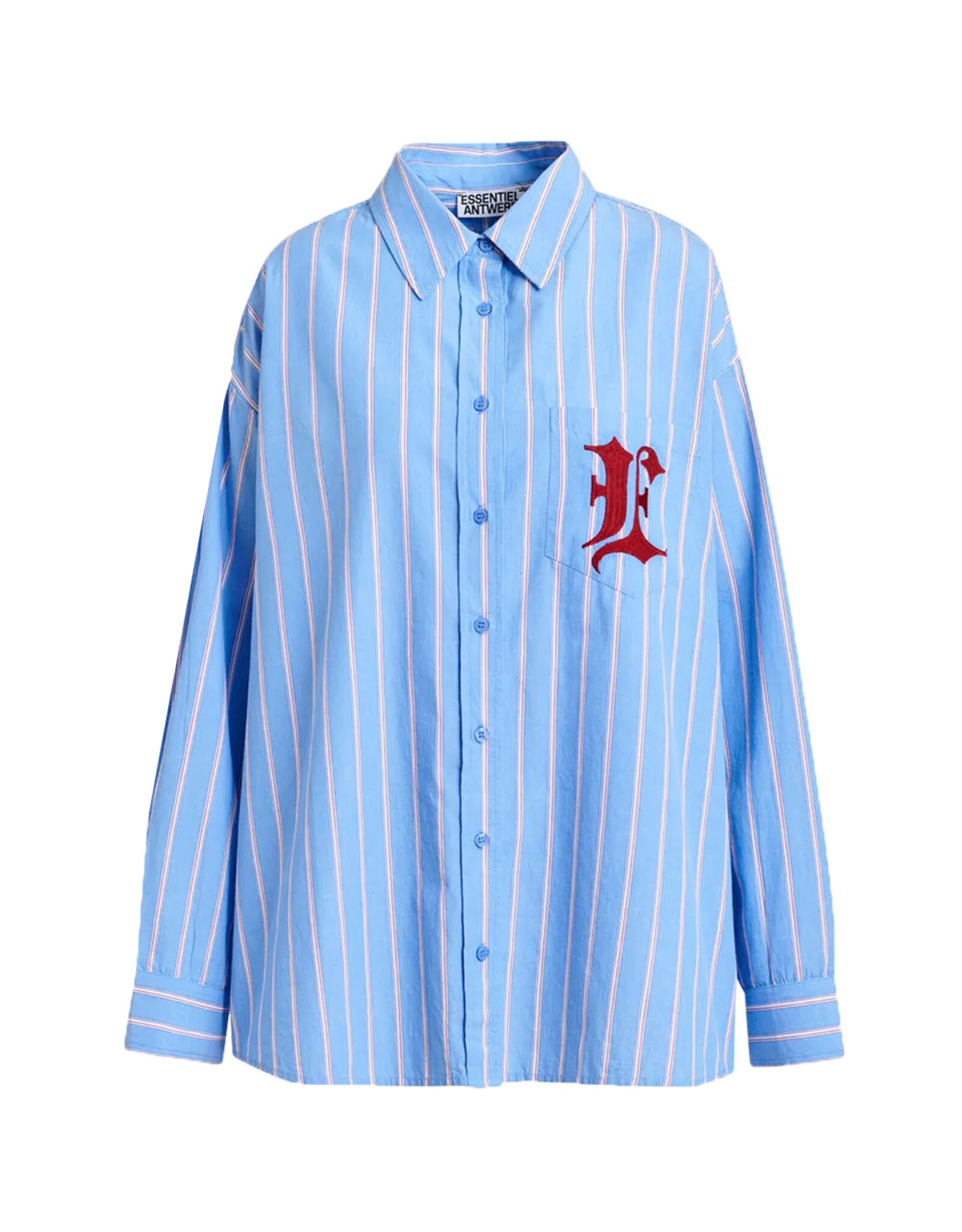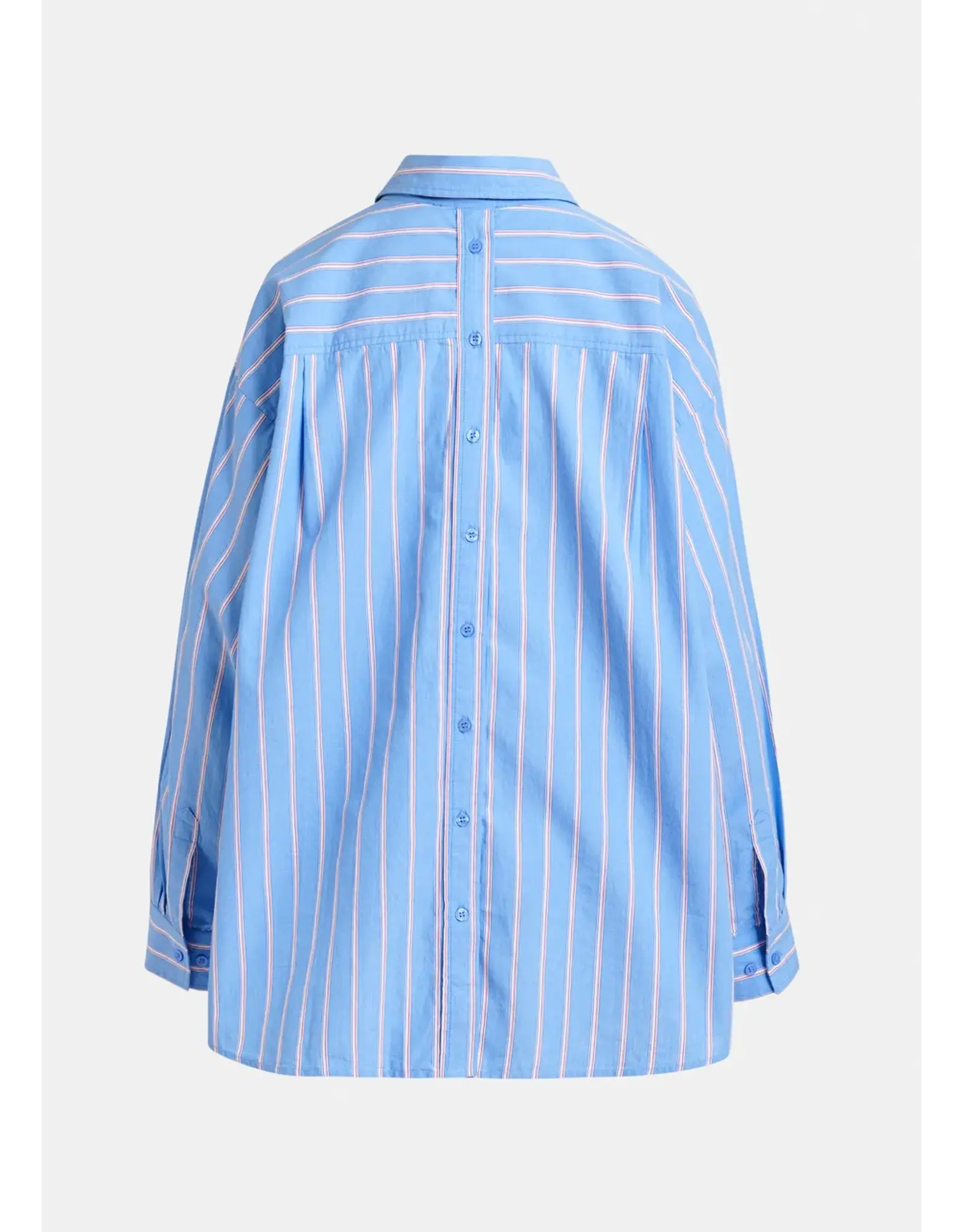 Overhemd van gestreept katoenen popeline, ontworpen met een puntkraag, een borstzakje met geborduurde 'E' en klassieke manchetten die je makkelijk kan omvouwen voor een relaxtere uitstraling. Het silhouet is voorzien van een afgeronde zoom die langer valt achteraan en met een verrassende rij extra knoopjes op de rug.
