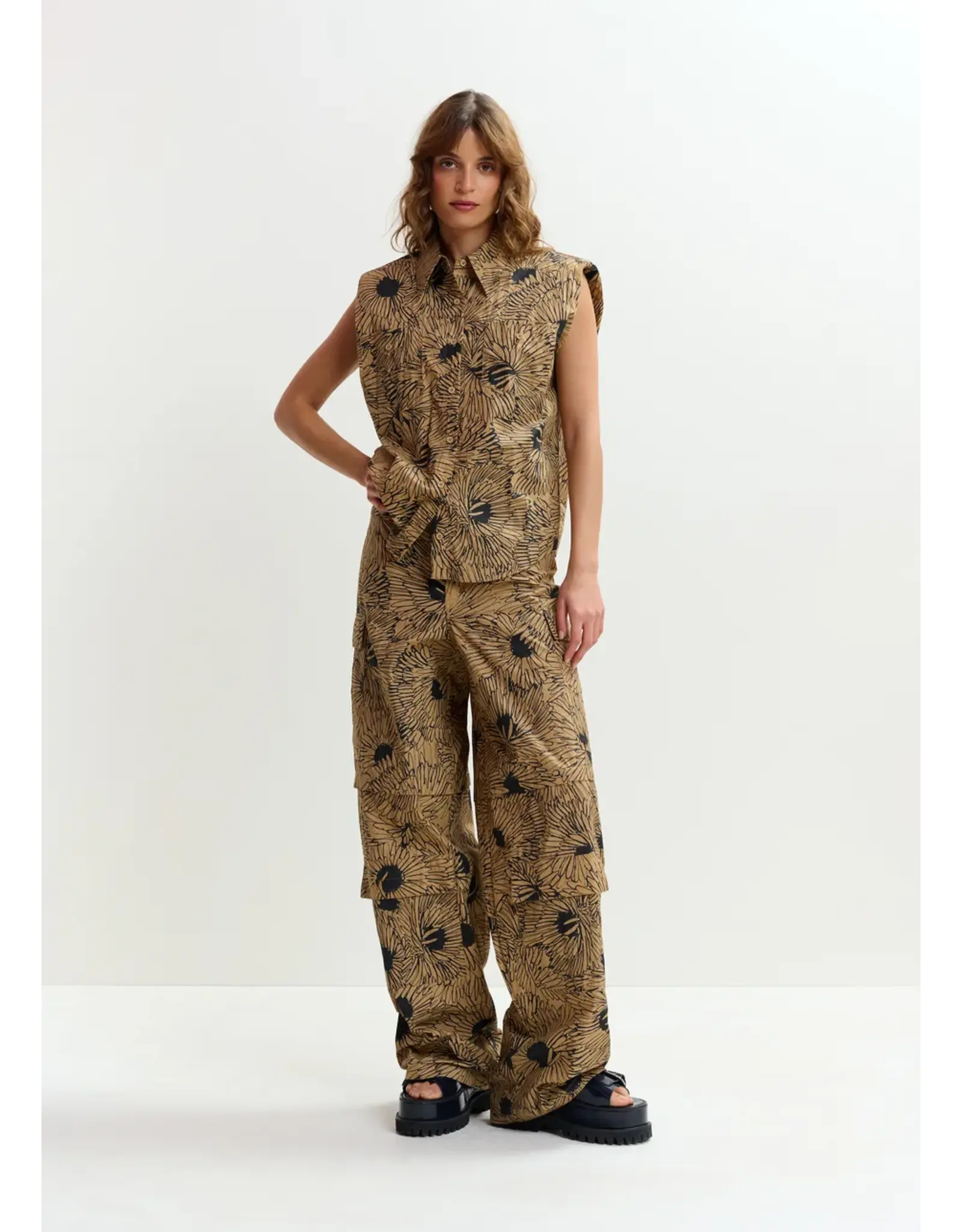 Overhemd vervaardigd van een licht gekreukte katoenmix, ontworpen in een oversized pasvorm zonder mouwen met gestructureerde schouders. De knoopsluiting op de voorzijde wordt vergezeld door twee borstzakken met knopen.
