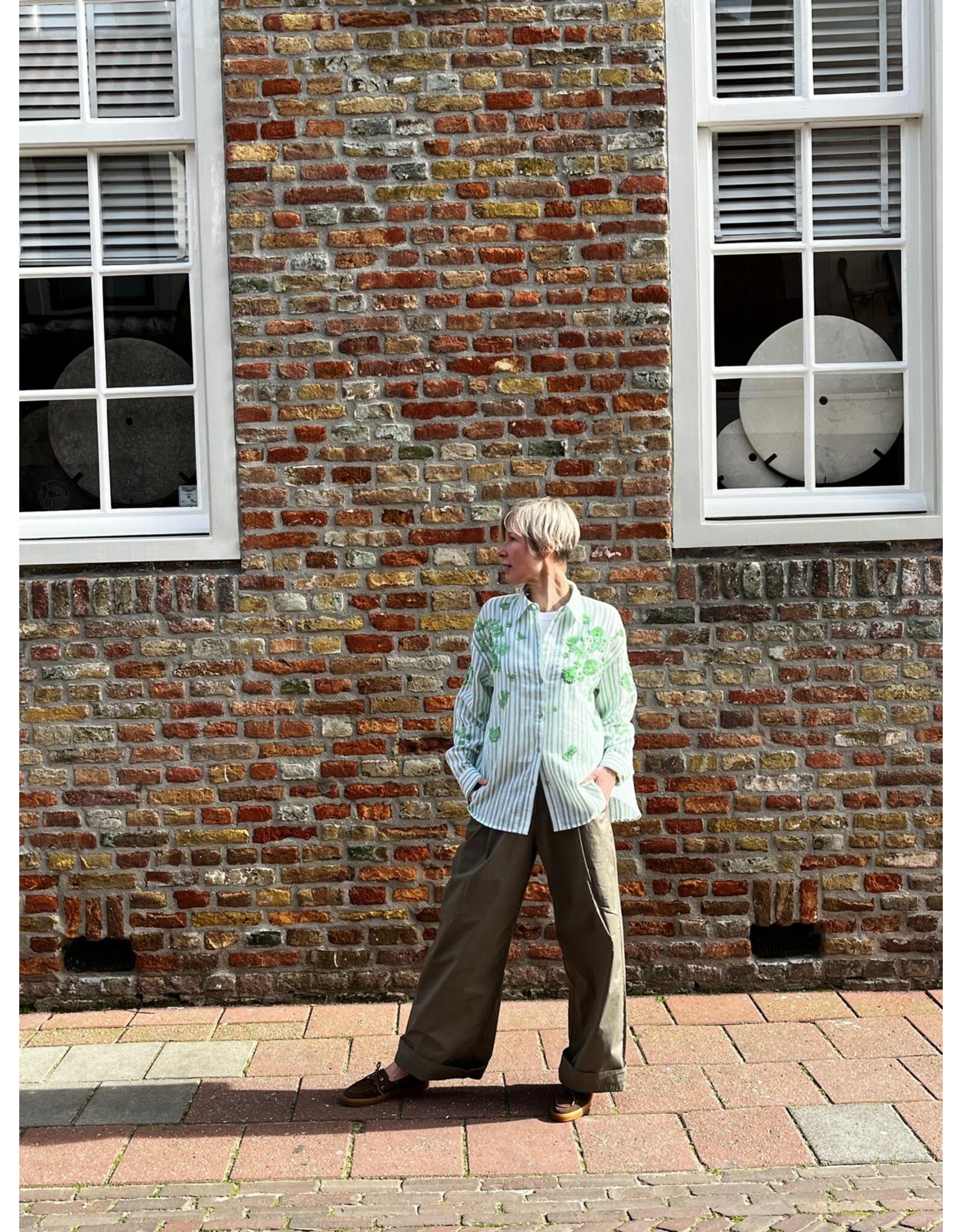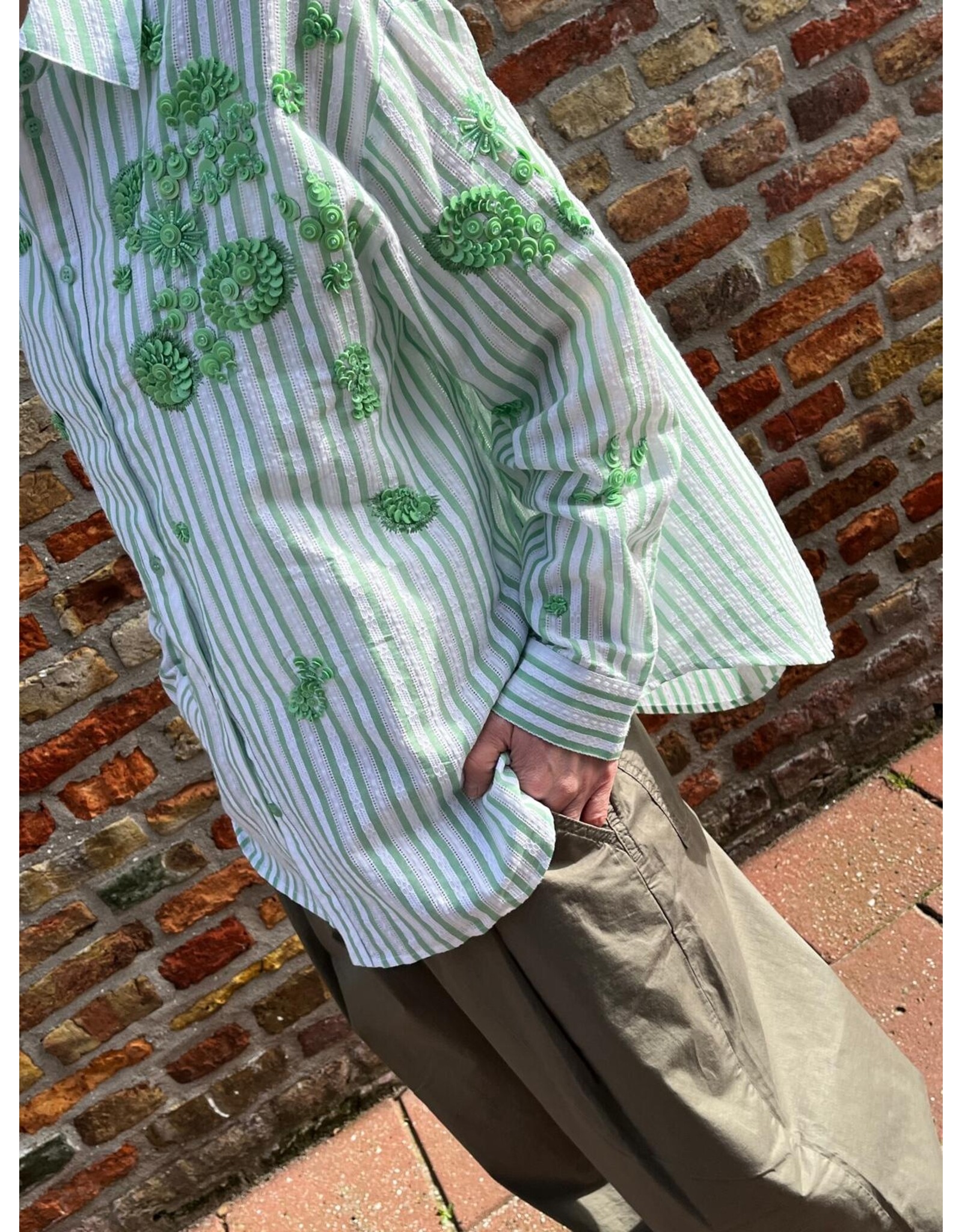 Gestreept overhemd vervaardigd van katoenen popeline in een relaxte pasvorm voor een verzorgde, gestructureerde uitstraling. Het is voorzien van een lage mouwinzet met lange mouwen, een klassieke kraag en een knoopsluiting aan de voorkant. Opgestikte bloemmotieven in borduurwerk zijn afgewerkt met pailletten en kralen voor extra dimensie en textuur. Een afgeronde zoom maakt het silhouet compleet.