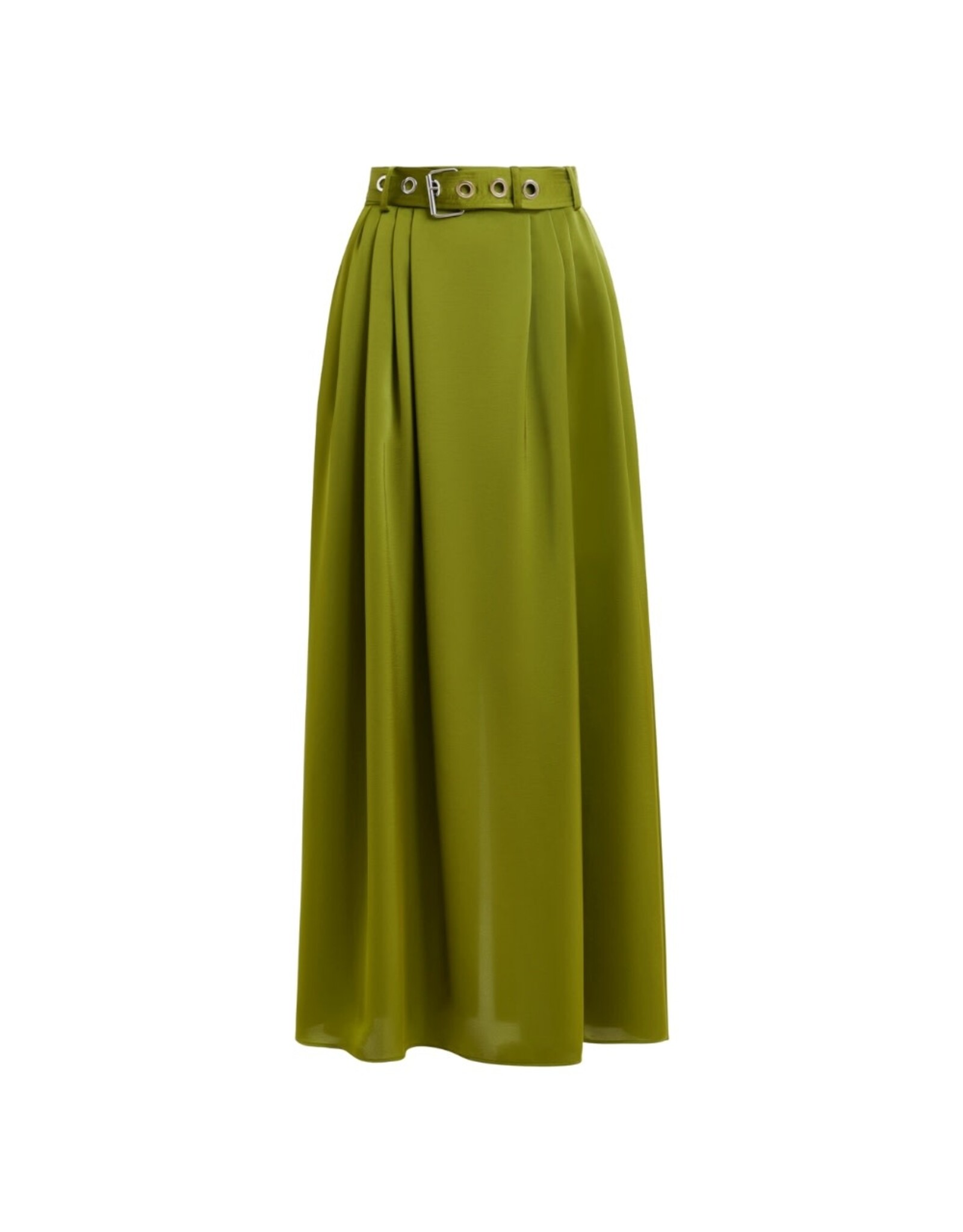 Bevat gerecyclede polyester, Middelzware stof zonder stretch, Hoge taille, A-lijn, Blinde ritssluiting, Dubbele plooien in de tailleband, Stoffen riem met zilveren oogjes en gesp