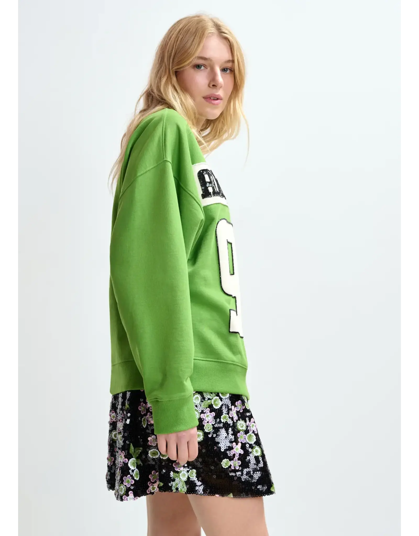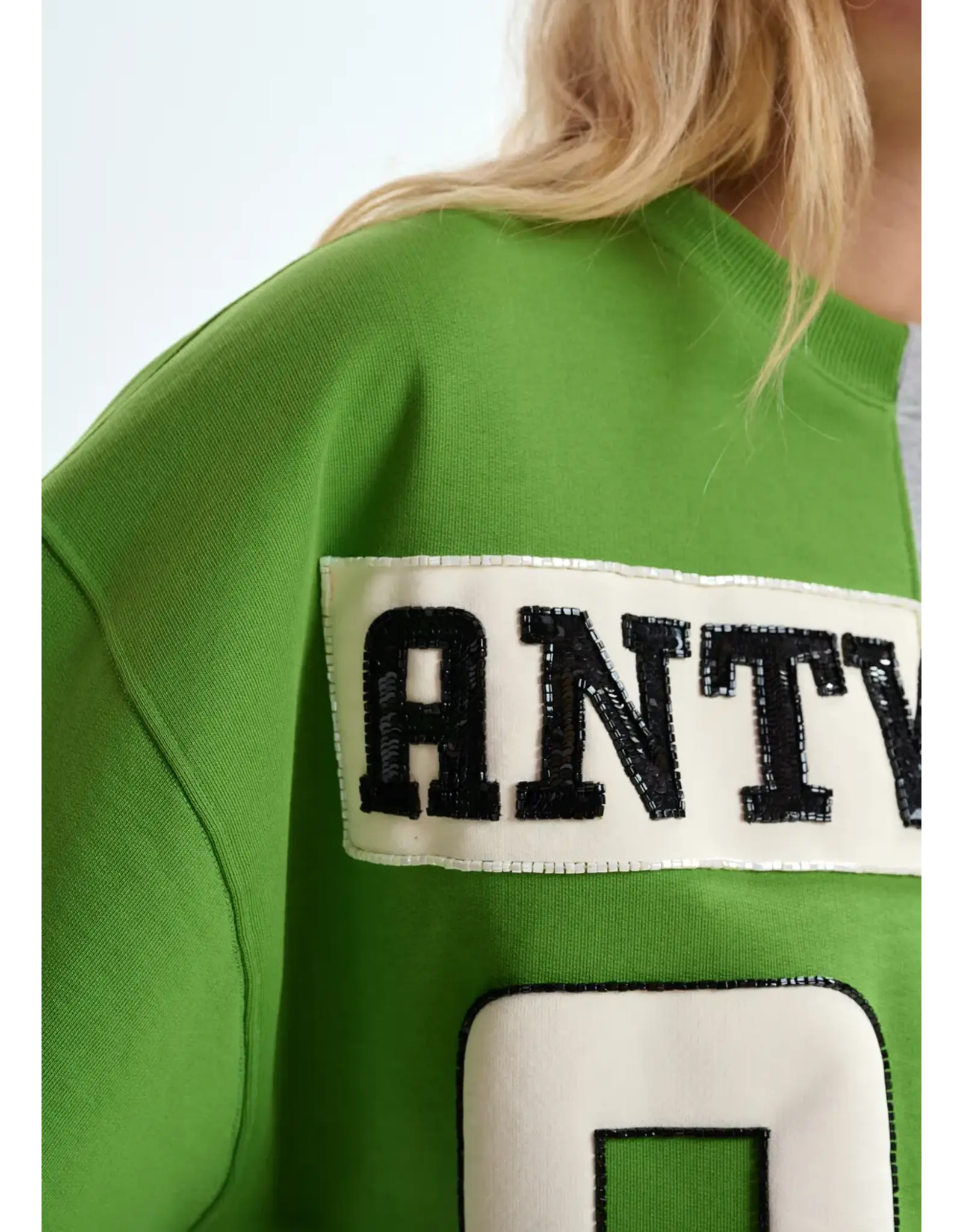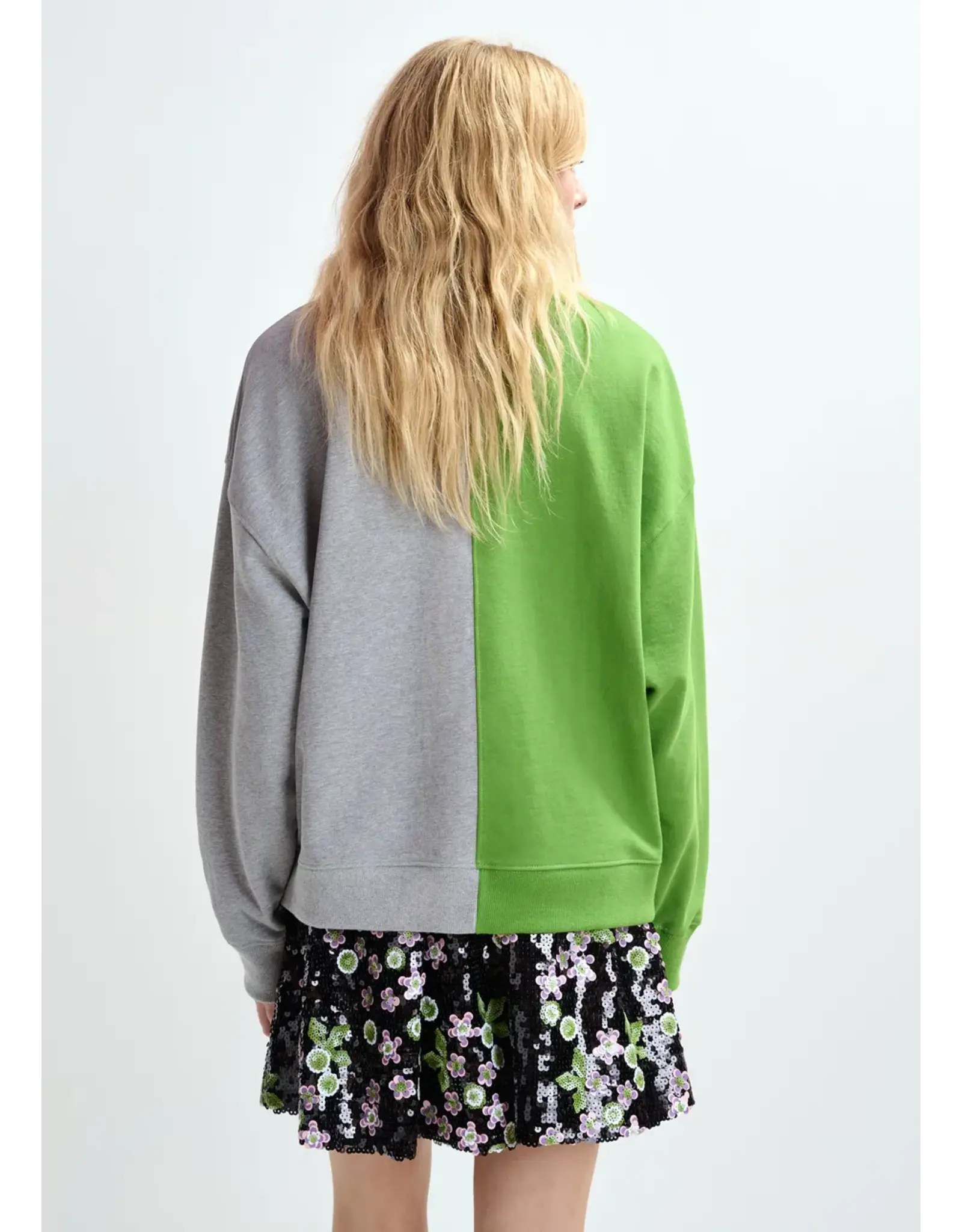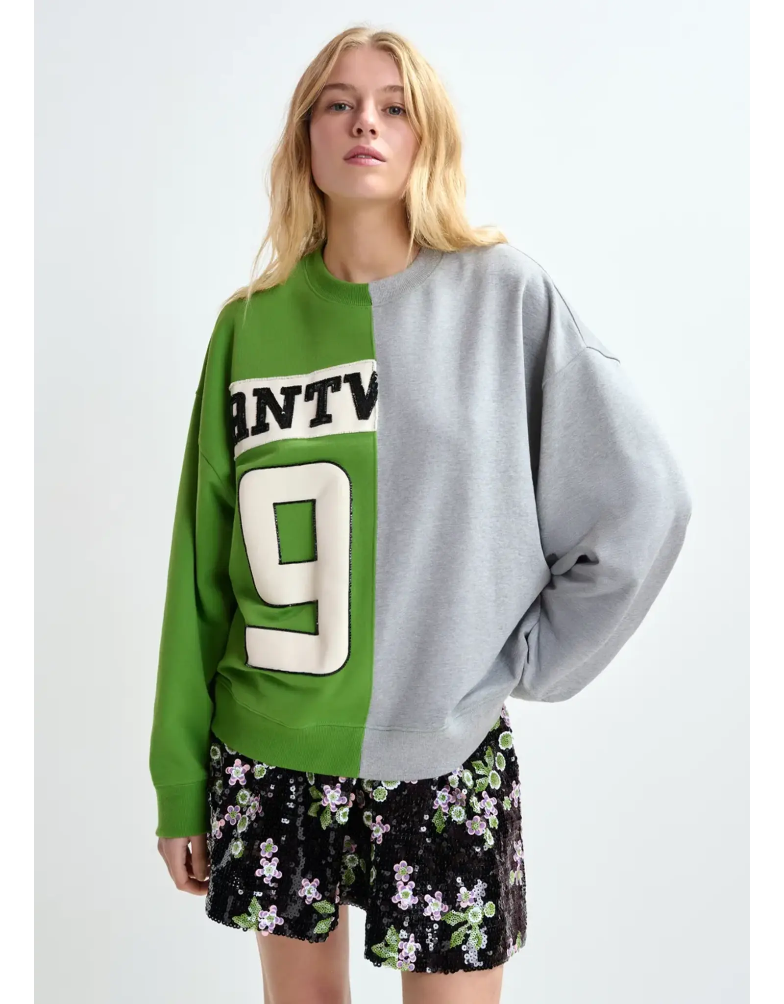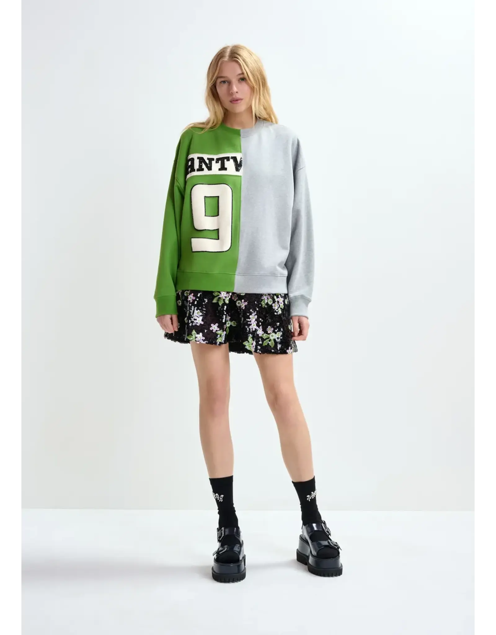 Sweater vervaardigd van 100% katoenen jersey. Hij is ontworpen in een relaxte pasvorm, samengesteld uit twee verschillende helften voor een opmerkelijk grafisch contrast. De voorkant is versierd met een groot opgestikt logo en cijfer, delicaat afgewerkt met pailletten en kralen voor een verfijnd tactiel effect.
