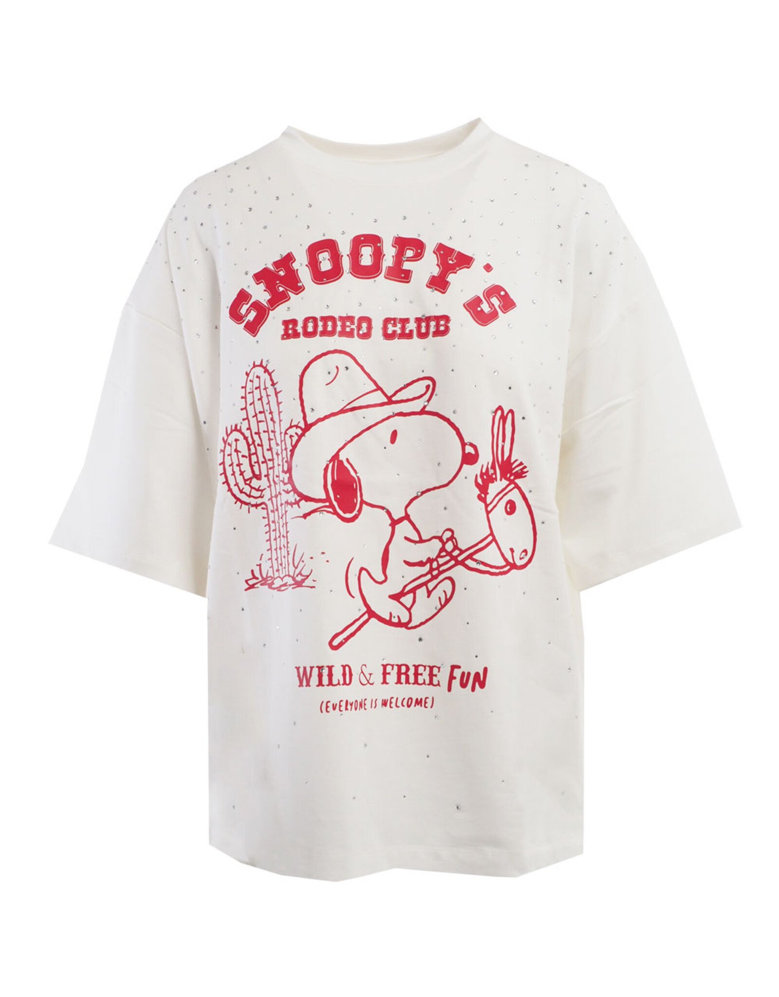 Het model is uitgevoerd in een zachte off-white tint en afgewerkt met een opvallende rode Snoopy “Rodeo Club” print. De graphic toont Snoopy in een western thema, verrijkt met fijne glitterdetails die het T-shirt een extra sprankelend effect geven. De oversized fit en zachte katoenkwaliteit zorgen voor een comfortabele en nonchalante uitstraling.