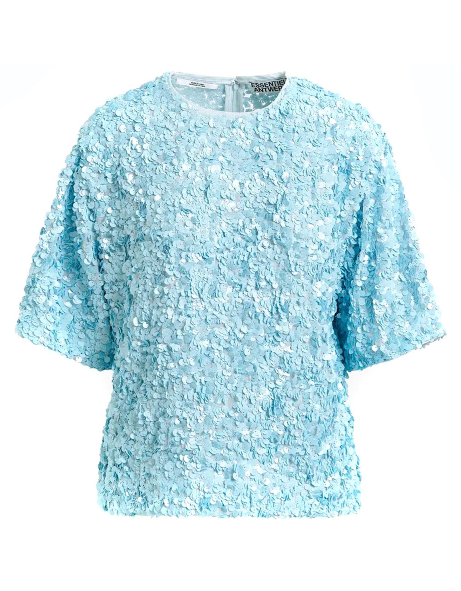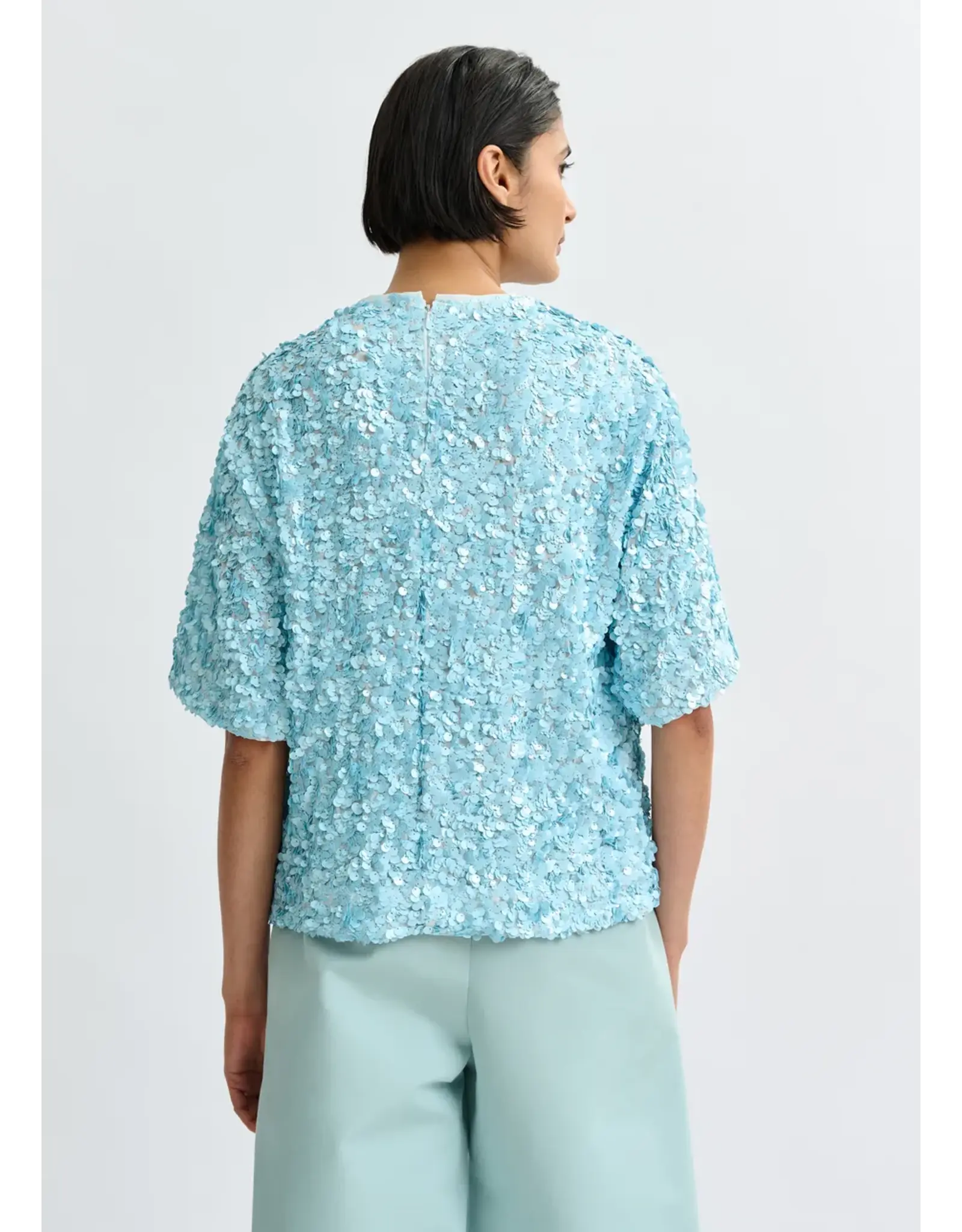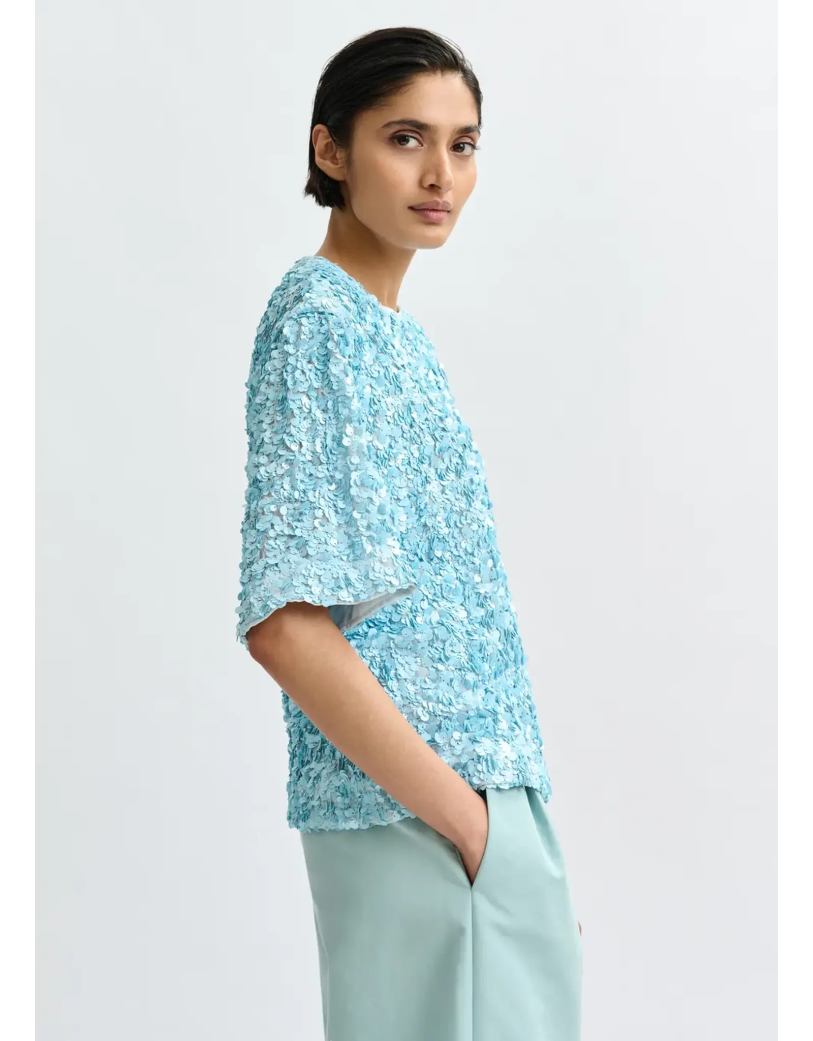 Top in dicht borduurwerk met bijpassende pailletten. De top heeft een boxy silhouet met lage mouwinzet en oversized snit die zijn relaxte uitstraling versterken. Afgewerkt met een sobere ronde halslijn en een discrete ritssluiting op de rug.