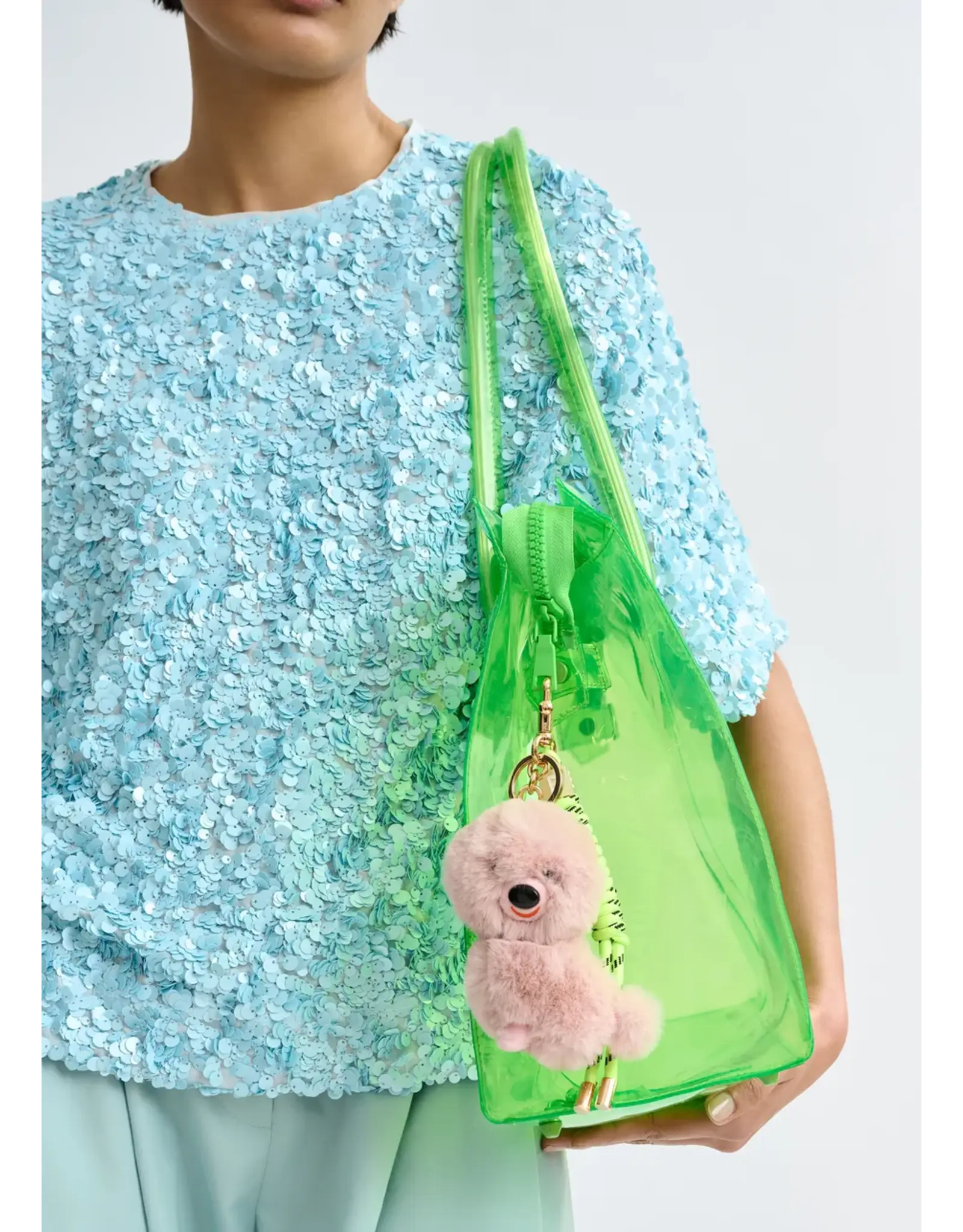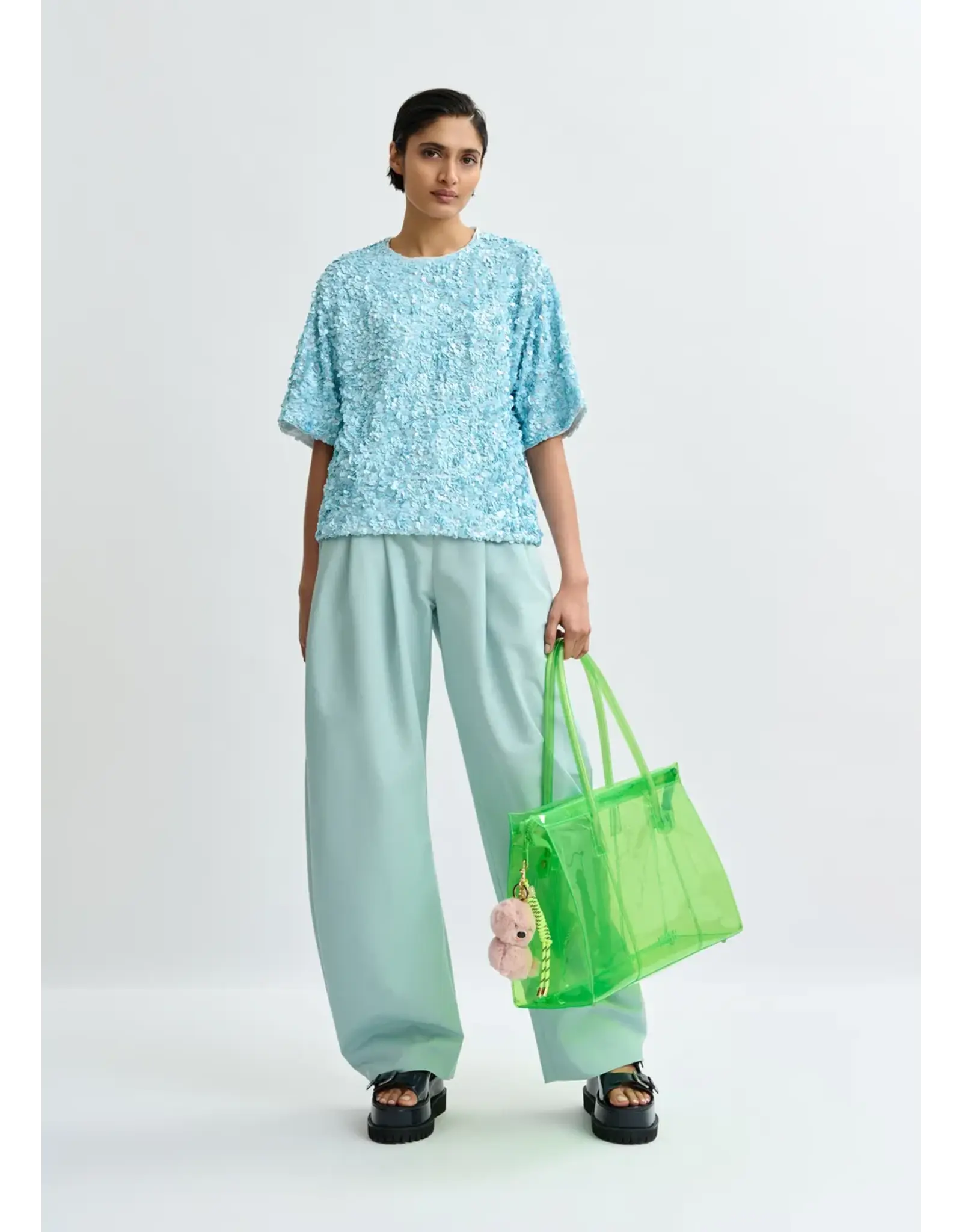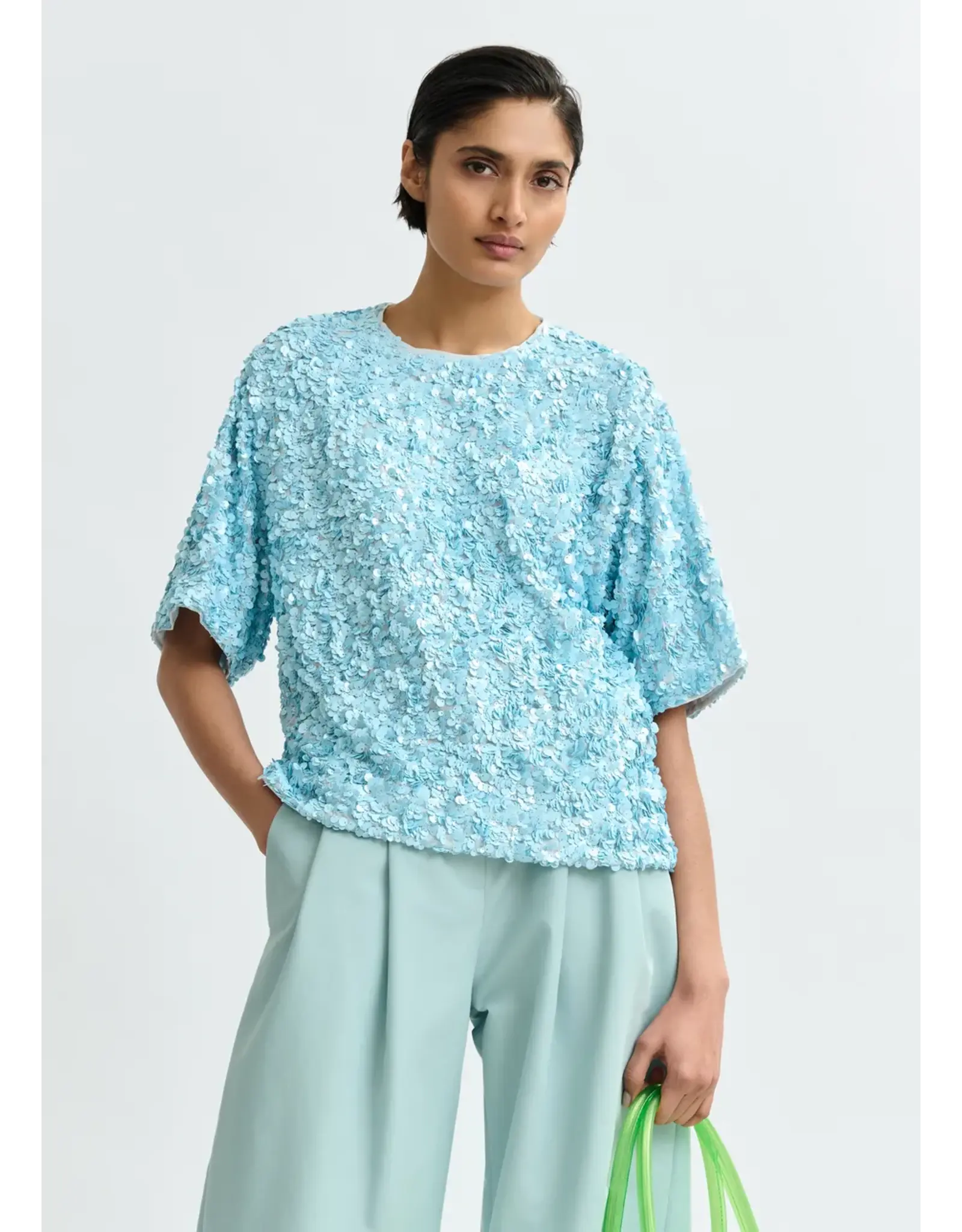 Top in dicht borduurwerk met bijpassende pailletten. De top heeft een boxy silhouet met lage mouwinzet en oversized snit die zijn relaxte uitstraling versterken. Afgewerkt met een sobere ronde halslijn en een discrete ritssluiting op de rug.