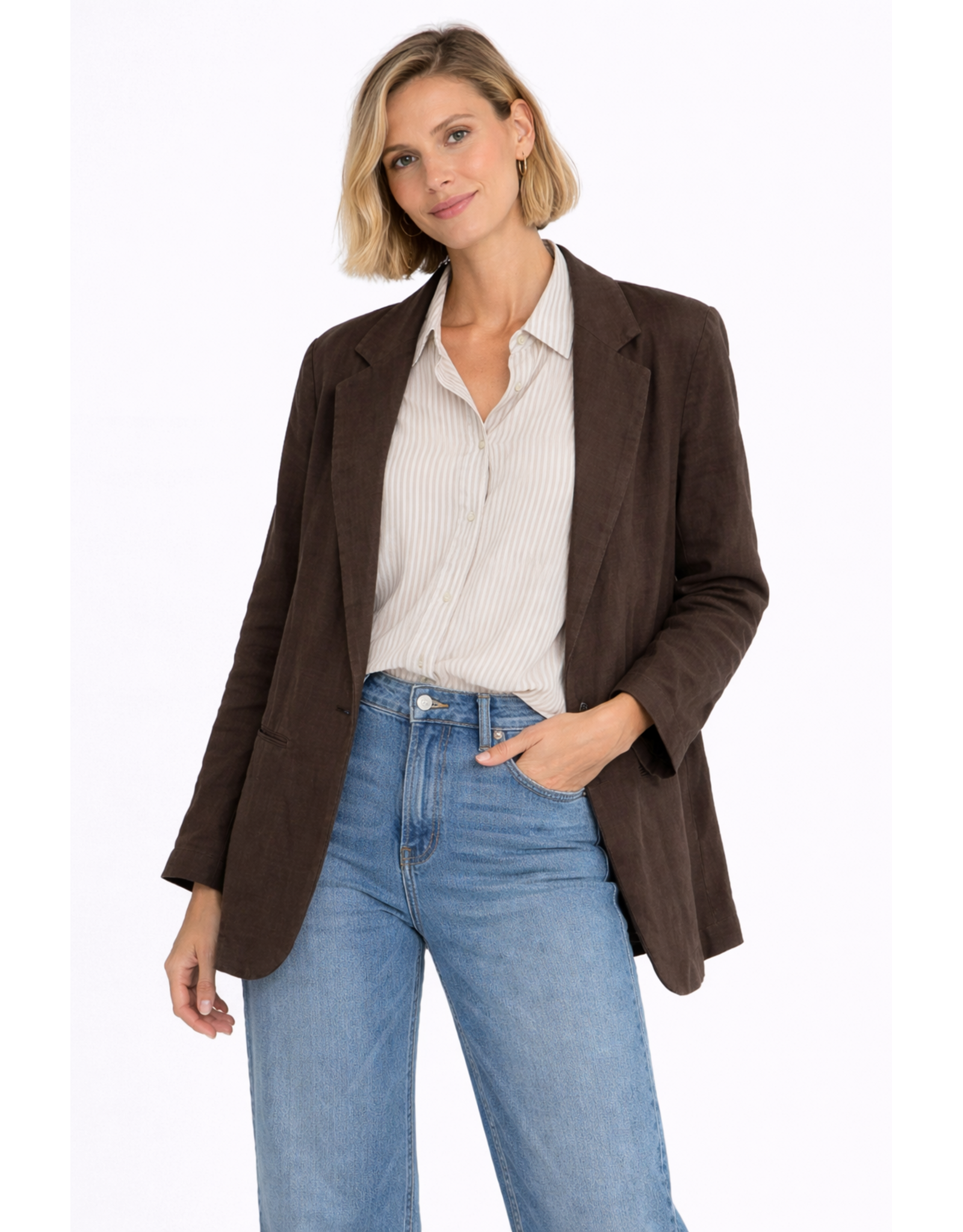 Een iconisch item uit de Hartford-collectie: de VIRNA damesjas is tijdloos en behoudt altijd zijn moderne uitstraling. Met zijn perfect getailleerde blazersnit en gestructureerde reverskraag belichaamt hij de moeiteloos elegante stijl die kenmerkend is voor het merk. Gemaakt van verfijnd linnen, betovert hij met zijn ingetogen look, versterkt door een bedrukte voering, een subtiele verwijzing naar de kenmerkende details van Hartford. Een gedurfd en tijdloos item, perfect voor zowel overdag als 's avonds.