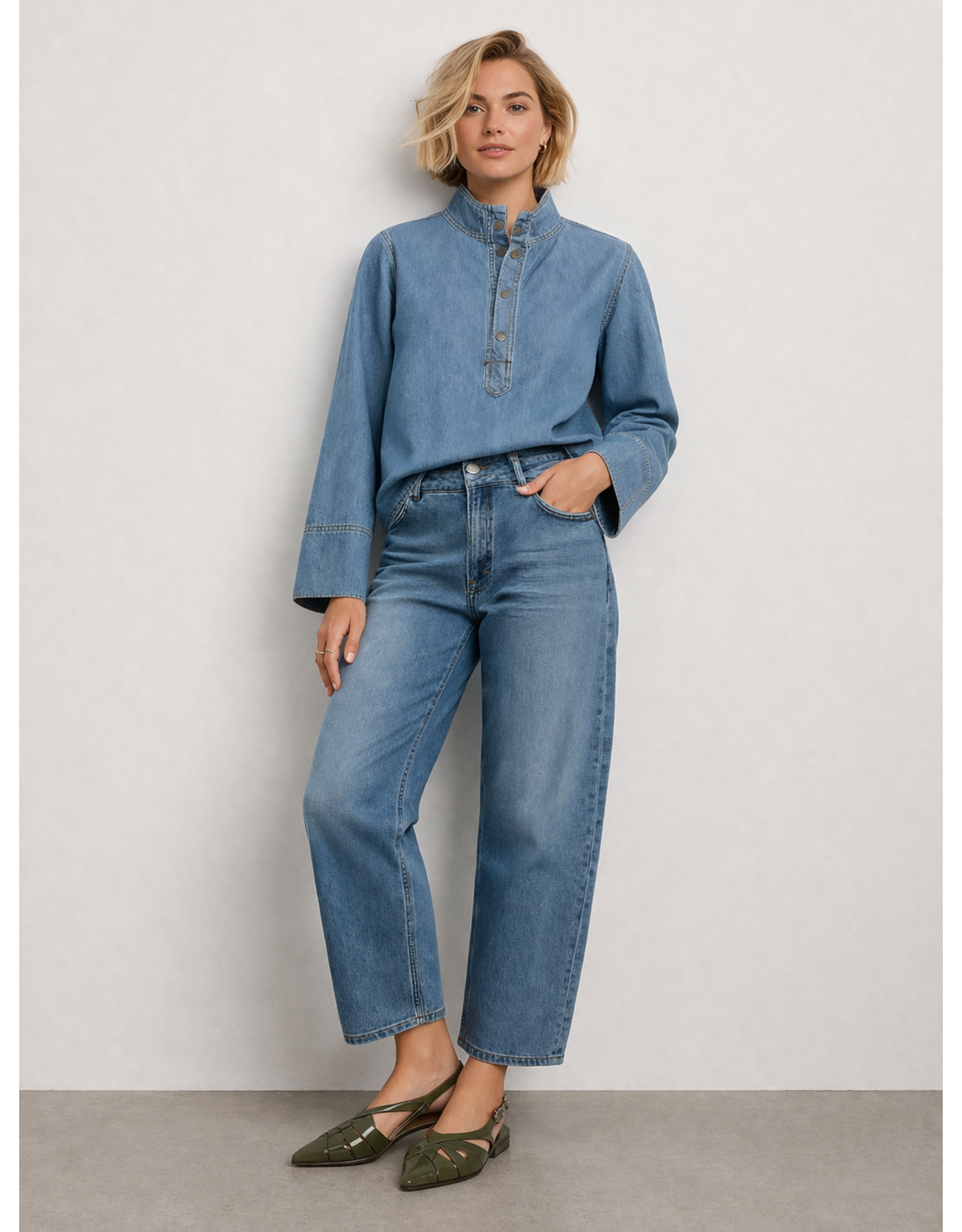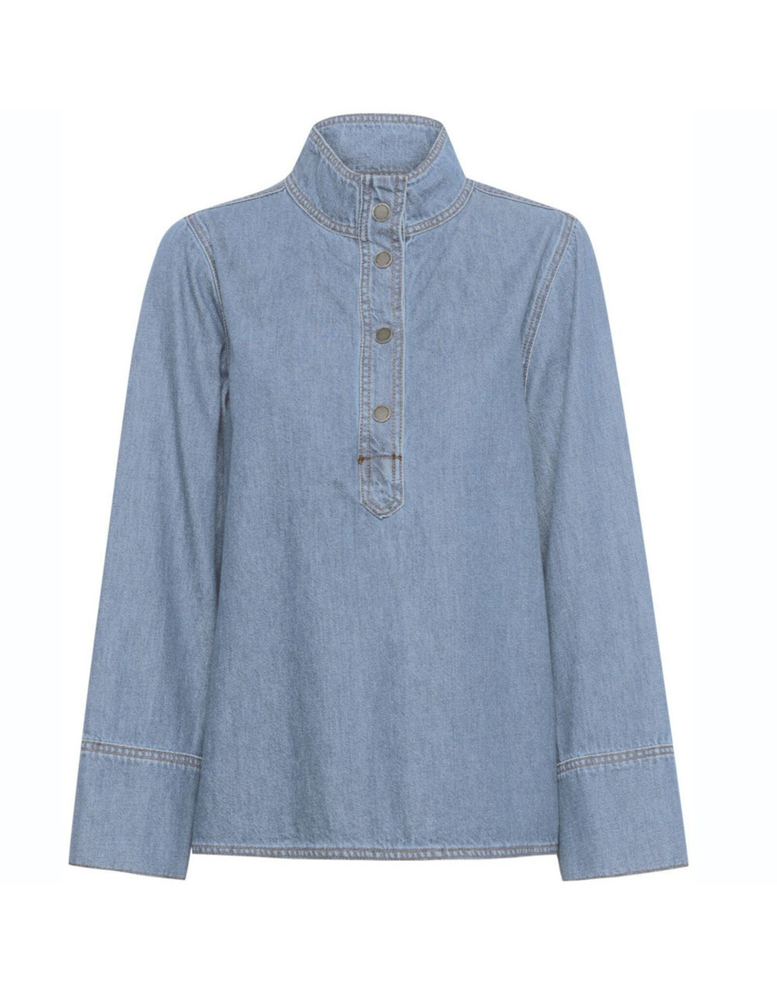 De blouse is voorzien van een opstaande kraag en een korte knoopsluiting aan de voorkant met subtiele metalen knopen. De lange mouwen met brede manchetten geven het geheel een eigentijdse en verfijnde uitstraling.