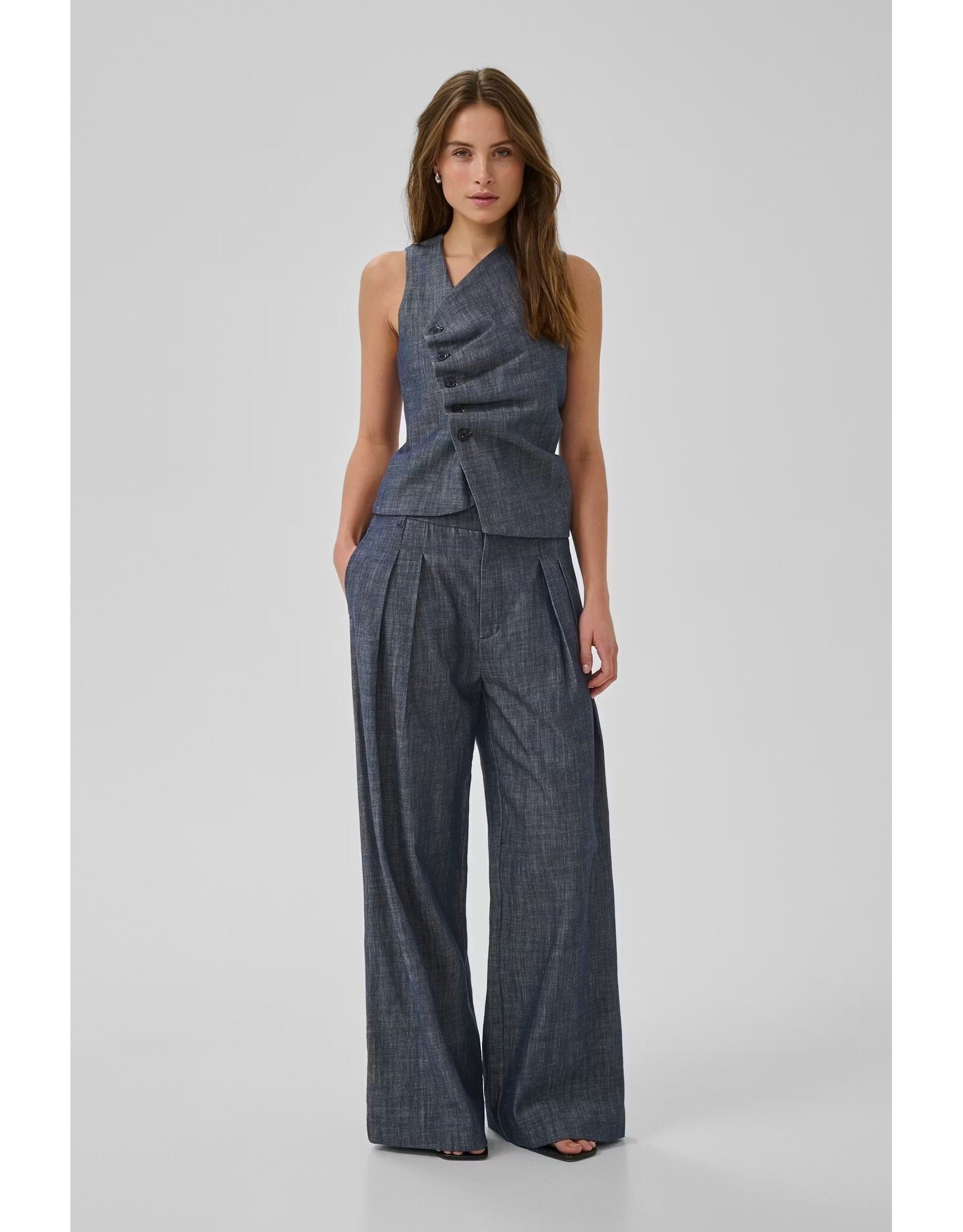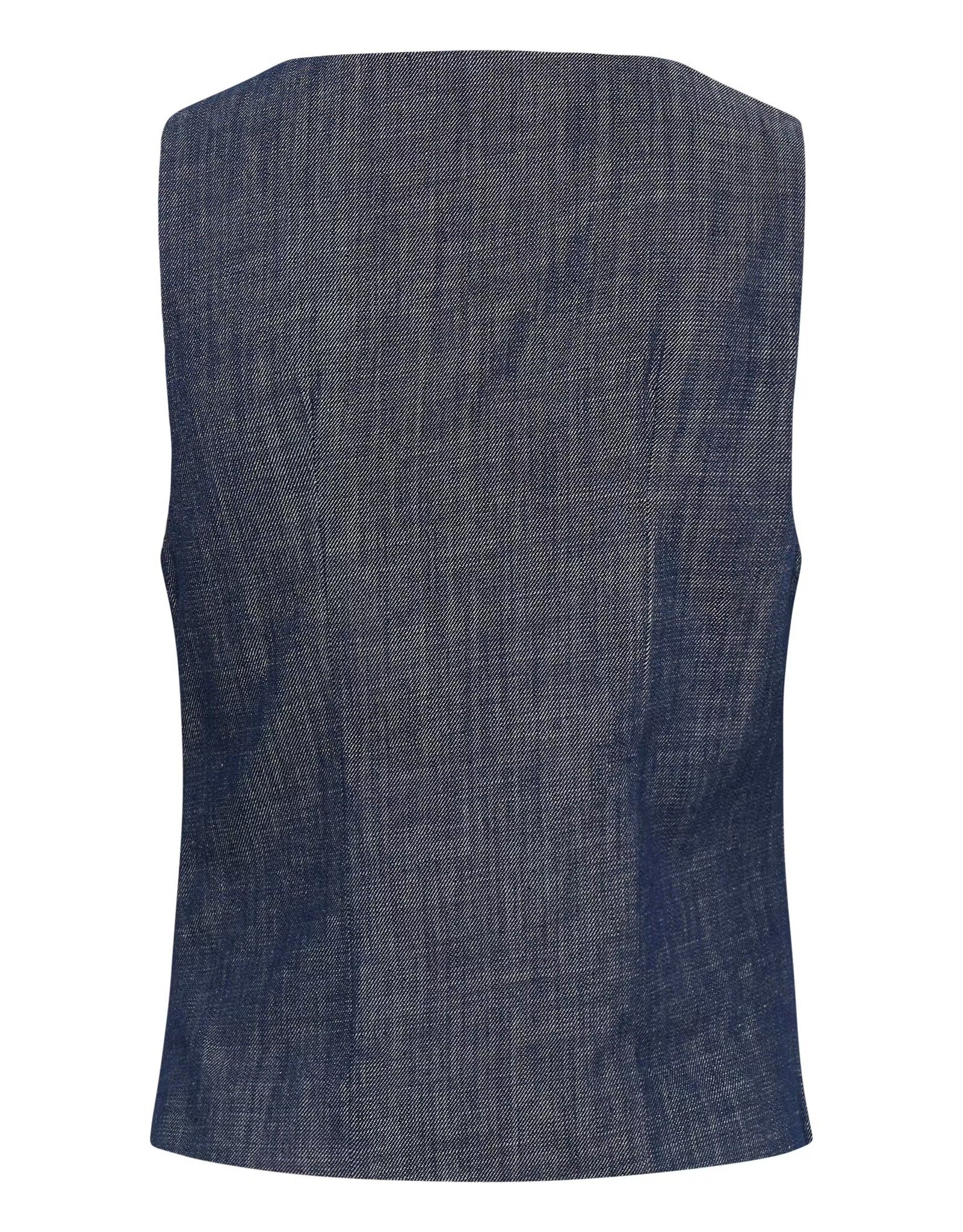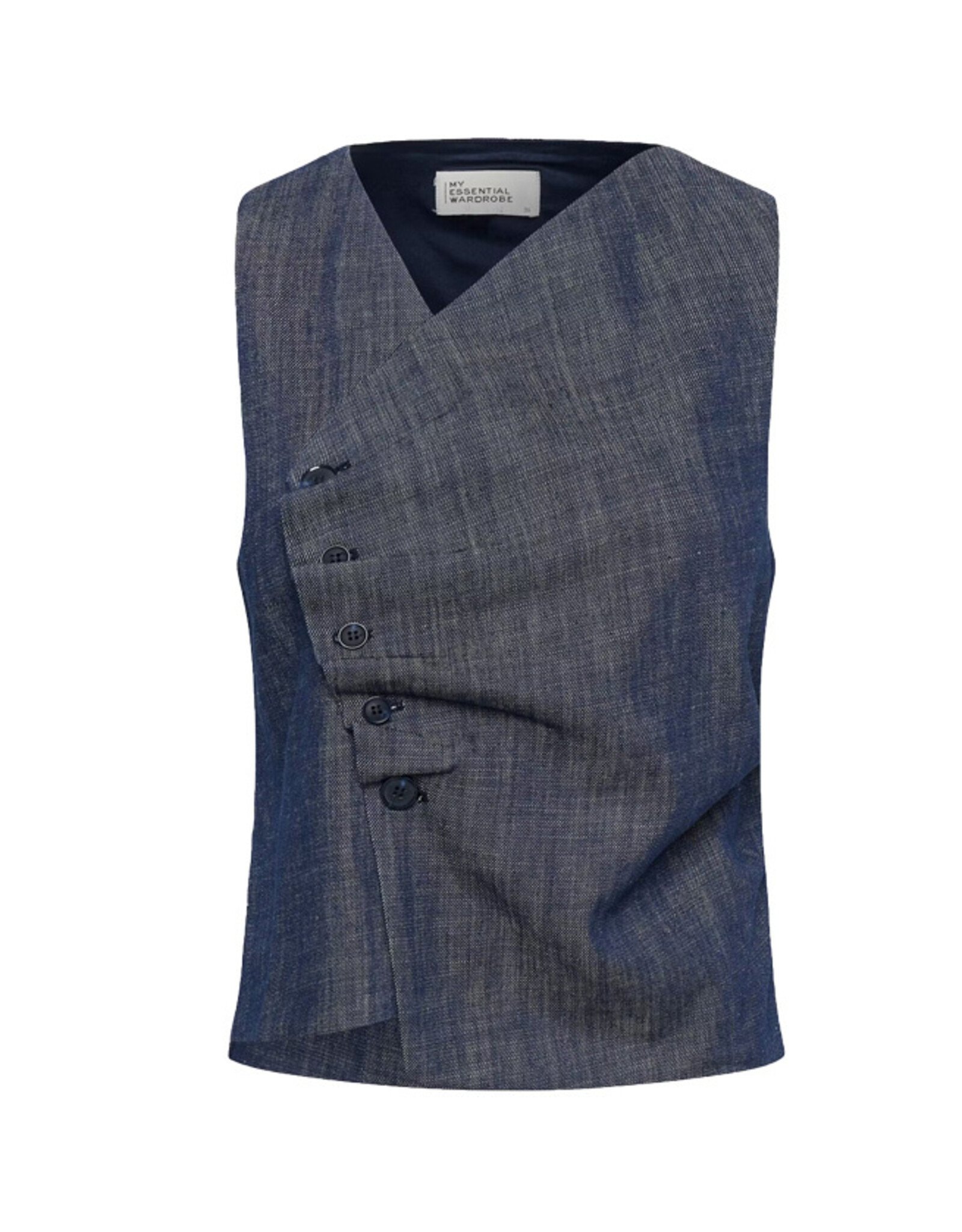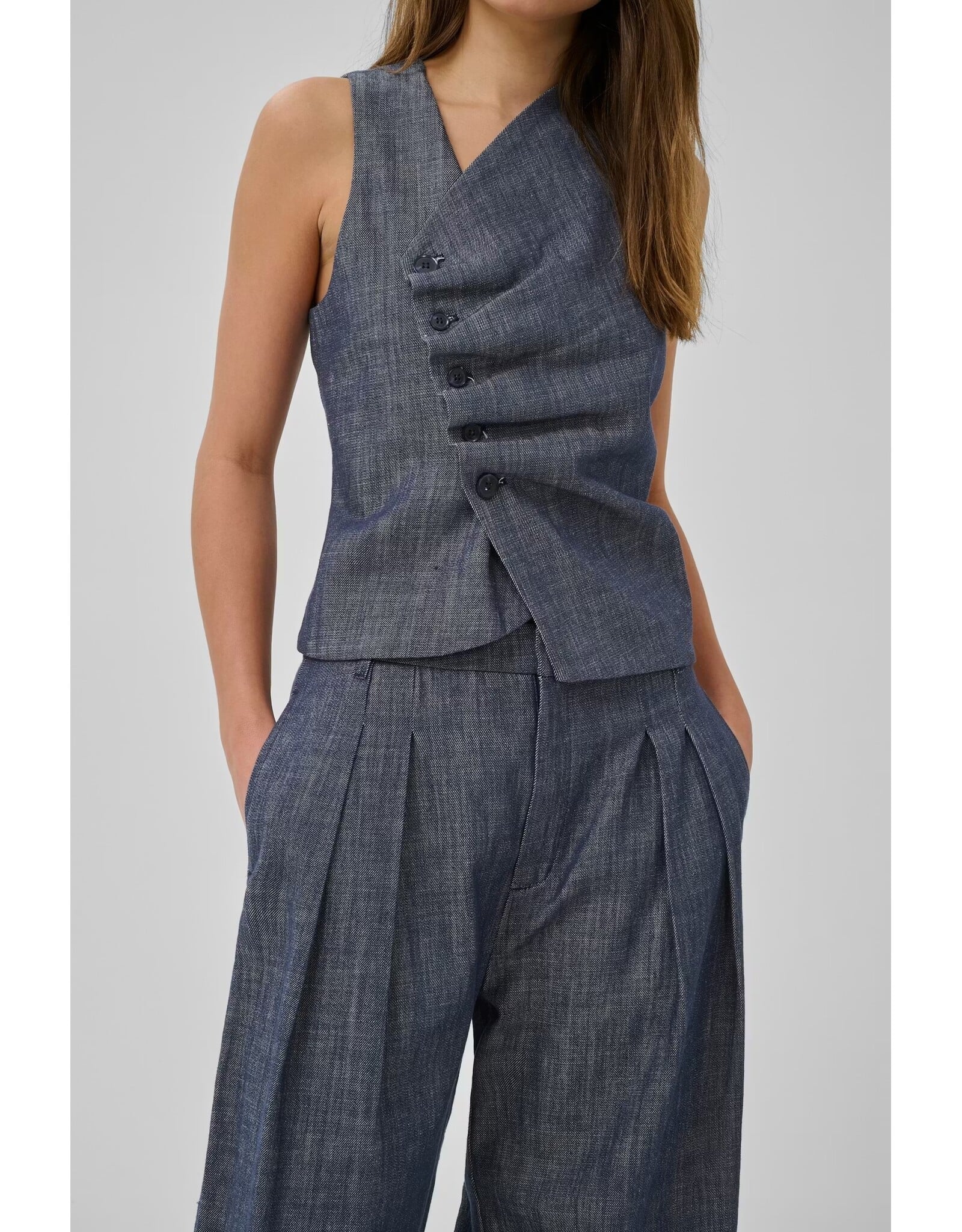 Asymmetrisch gilet met rechte pasvorm, diagonaal knoopsluiting en fijne textuur. Mouwloos, met scherpe V-hals voor een eigentijdse uitstraling