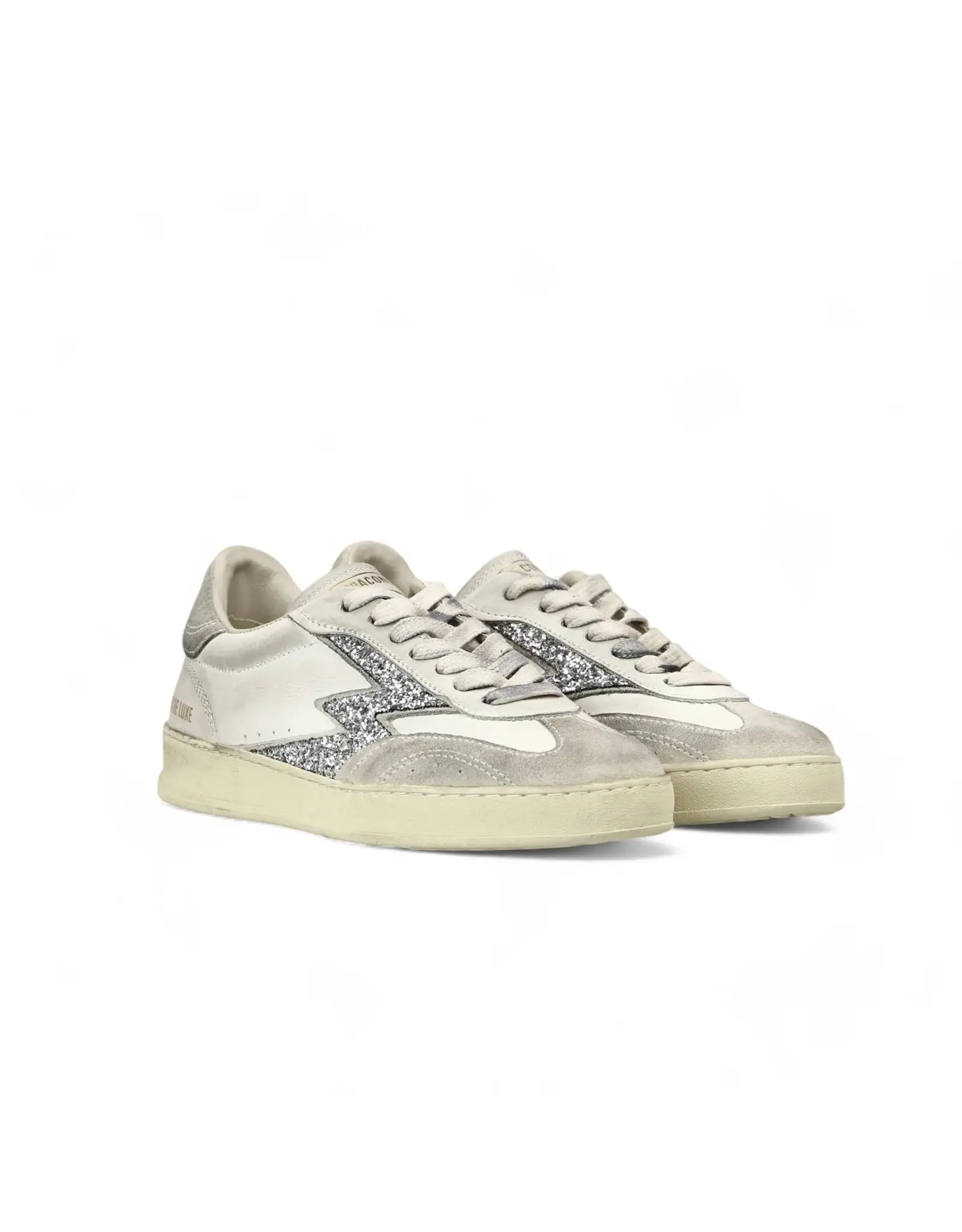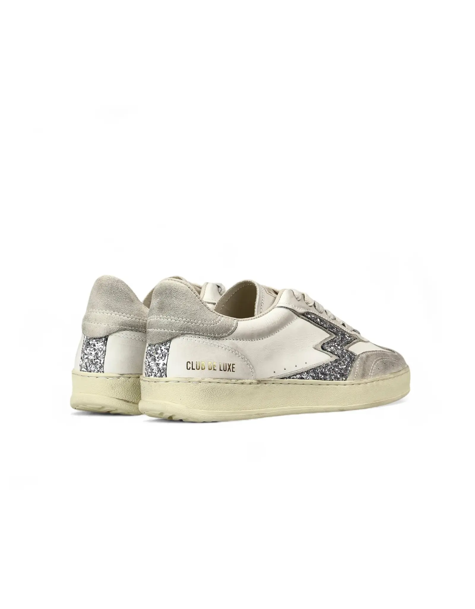 Low-top white women's sneakers made in Italy in dirtied leather, with off-white suede details and silver glitter logo. Club Deluxe version