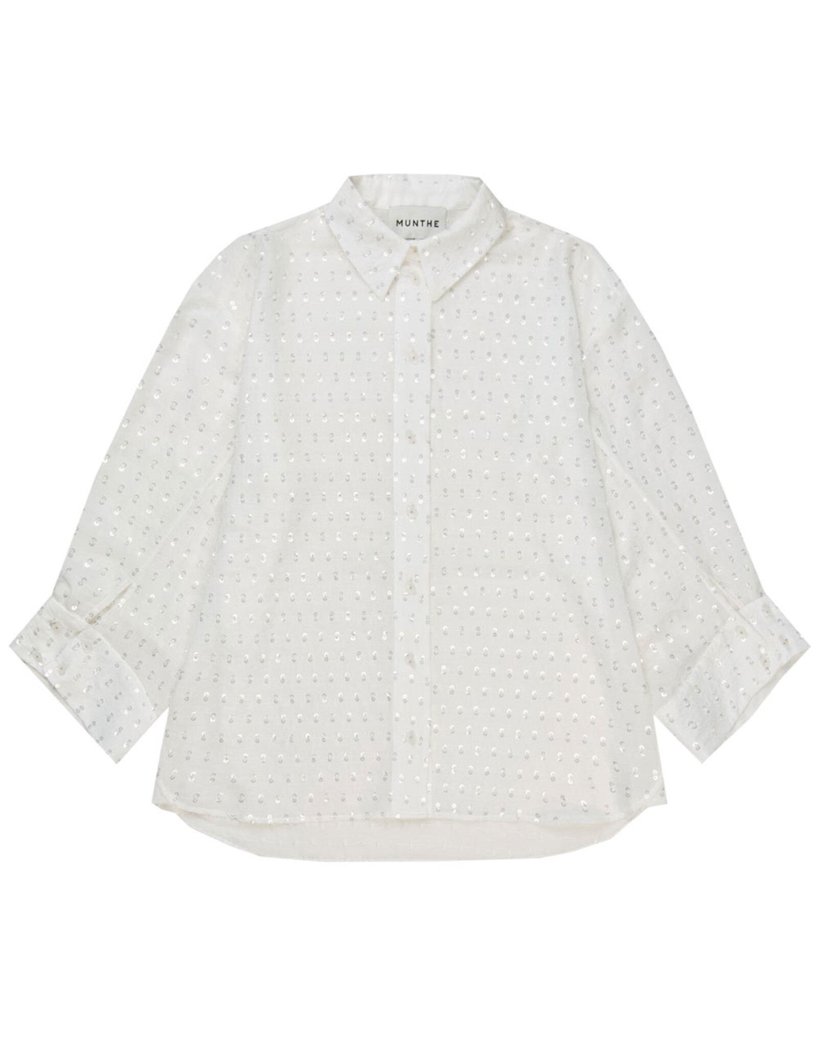 Overhemd met een oversized pasvorm en subtiele pailletten. Het is ontworpen met een klassieke kraag, knoopsluiting aan de voorkant en lange mouwen met brede manchetten.