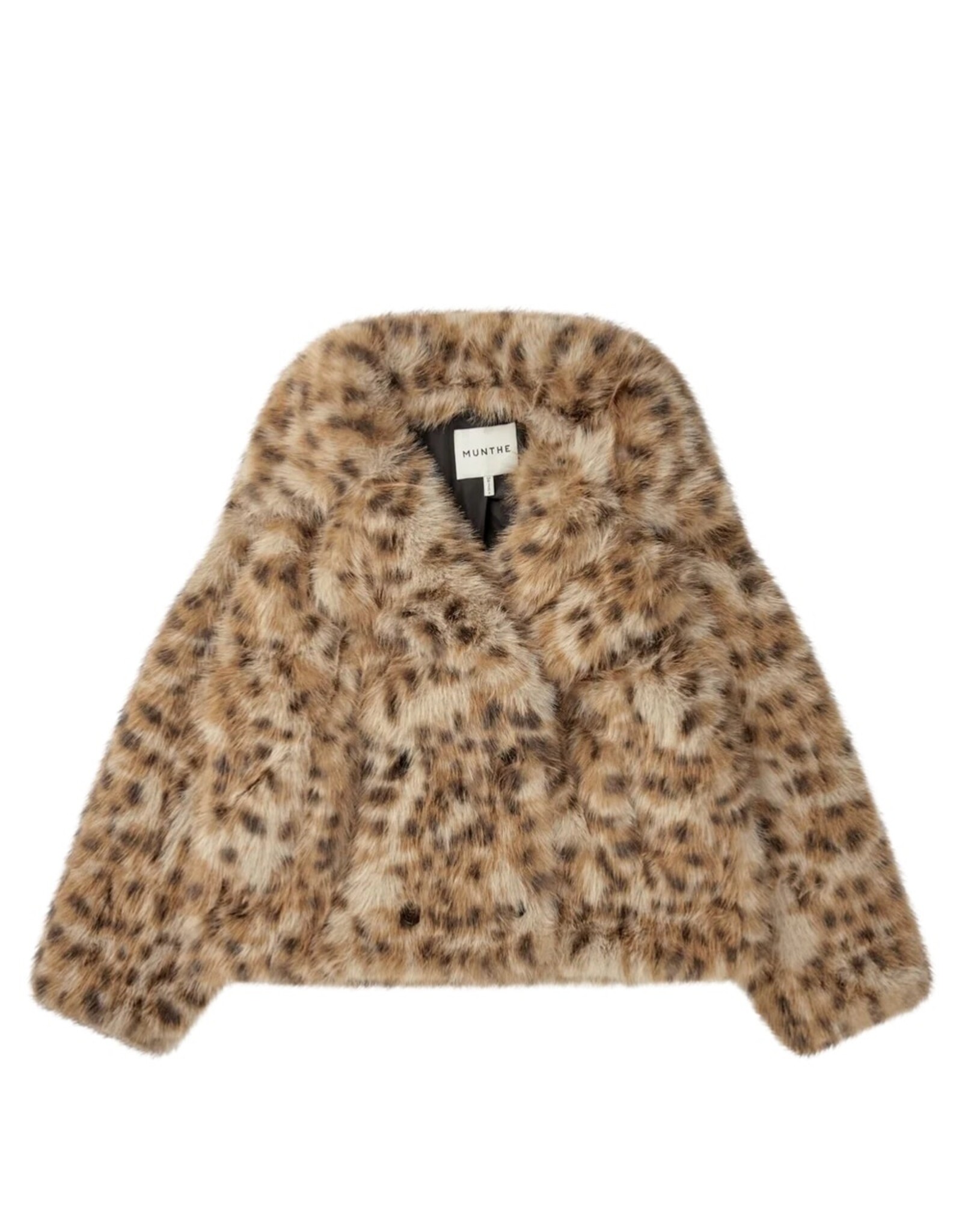 Een mooie, korte jas van imitatiebont met een dubbelrijige knoopsluiting en een elegante, brede kraag. De jas is ontworpen met zijzakken
