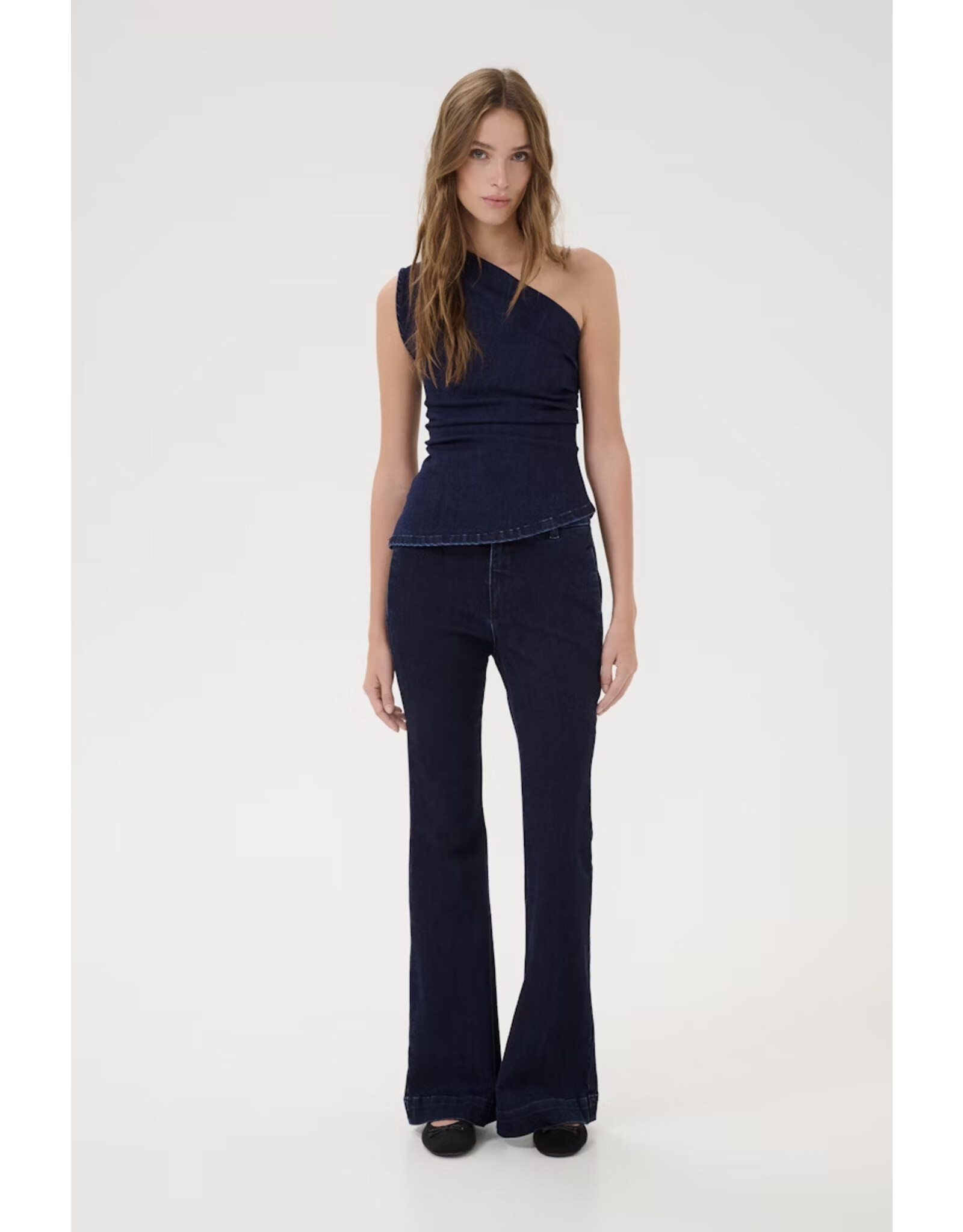 De My Essential Jeans AYOMW 158 HB DBlue is een veelzijdige en stijlvolle flared jeans in een diepe donkerblauwe kleur. Het klassieke ontwerp en de flatterende pasvorm maken deze jeans een onmisbaar item in je garderobe. Combineer hem met een casual T-shirt voor een relaxte look of met de bijpassende top en hakken voor een meer geklede uitstraling. Het model is 178 cm en draagt maat 27. Style nr.: 10704661.