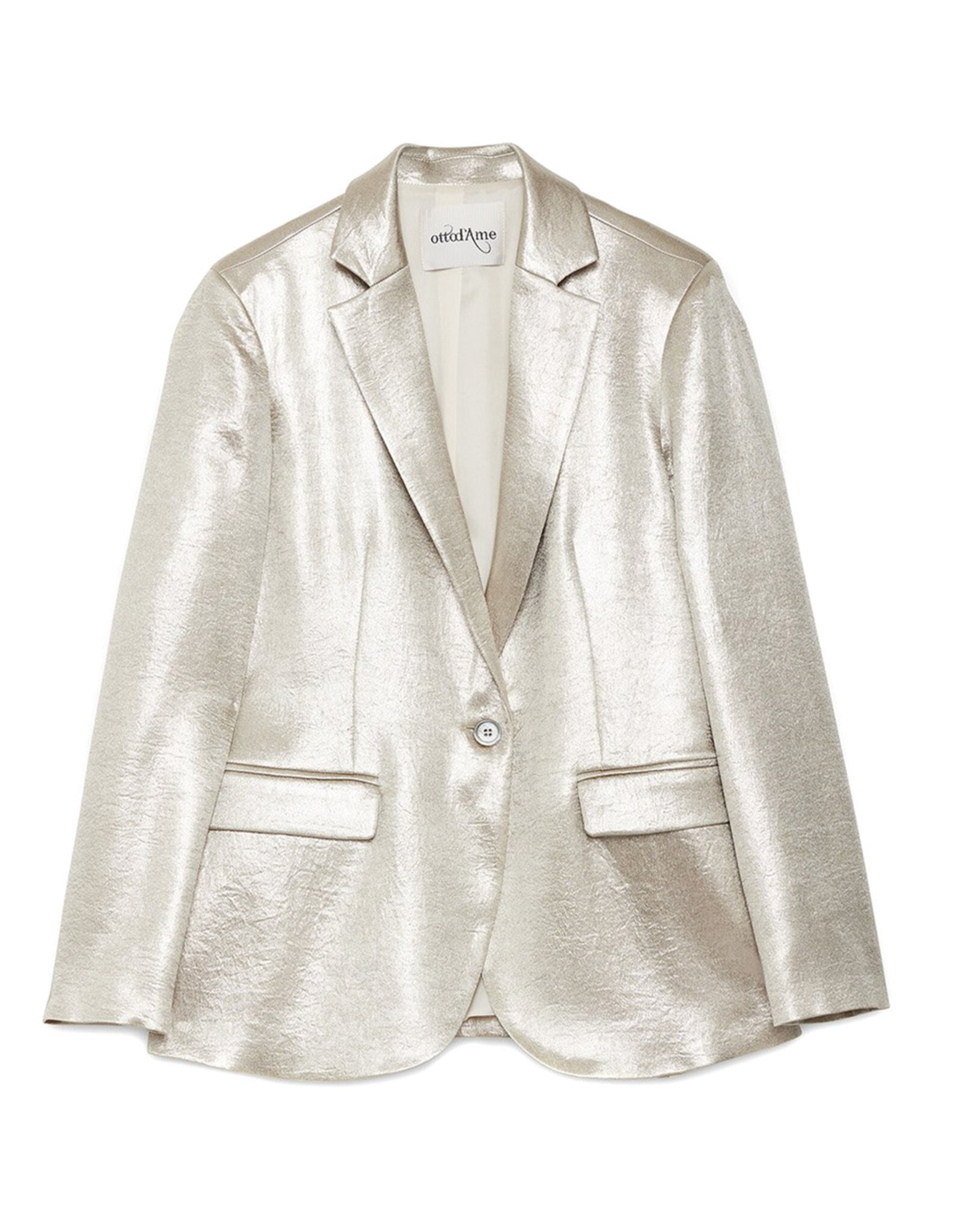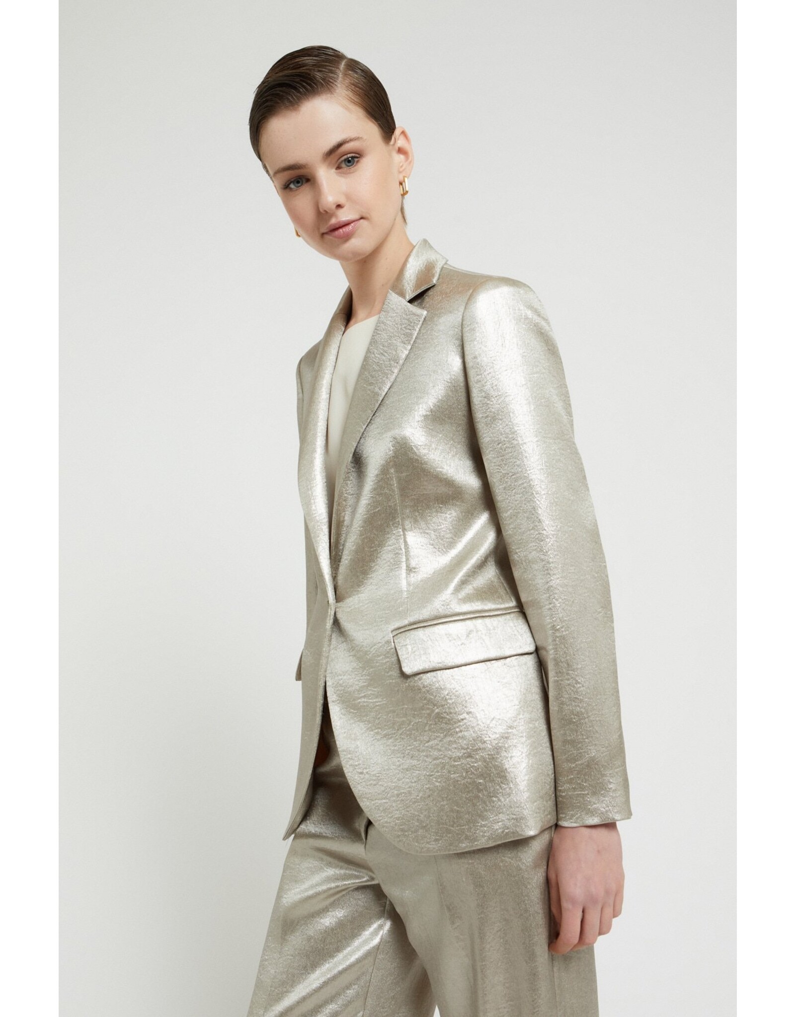 Deze getailleerde blazer is uitgevoerd in een metallic stretchstof met subtiele structuur. Het ontwerp heeft een klassieke reverskraag, een enkele knoopsluiting en een flatterende pasvorm die elegantie en moderniteit combineert.