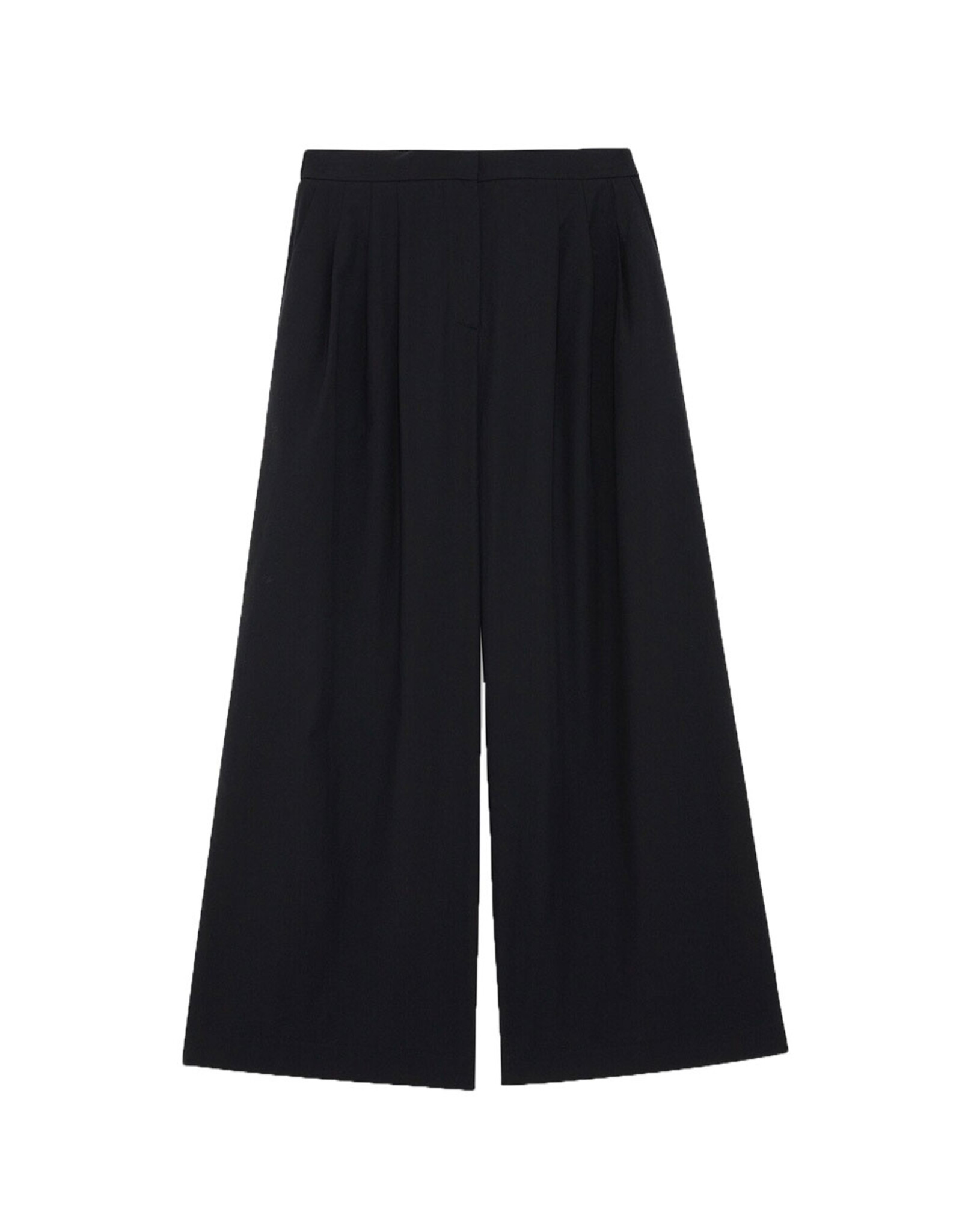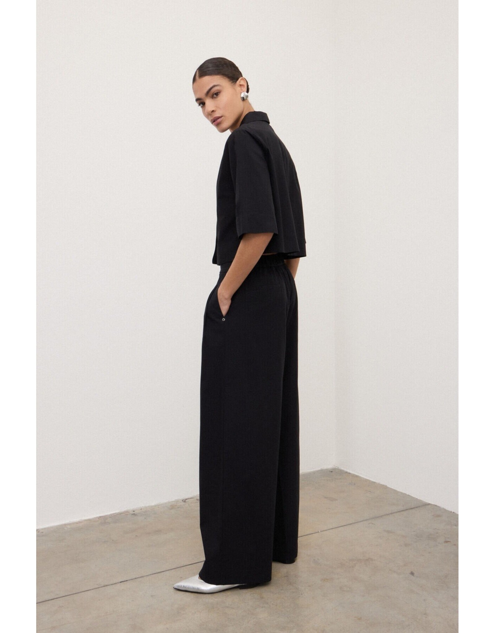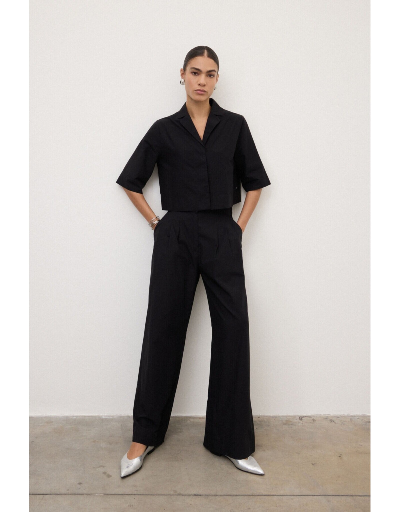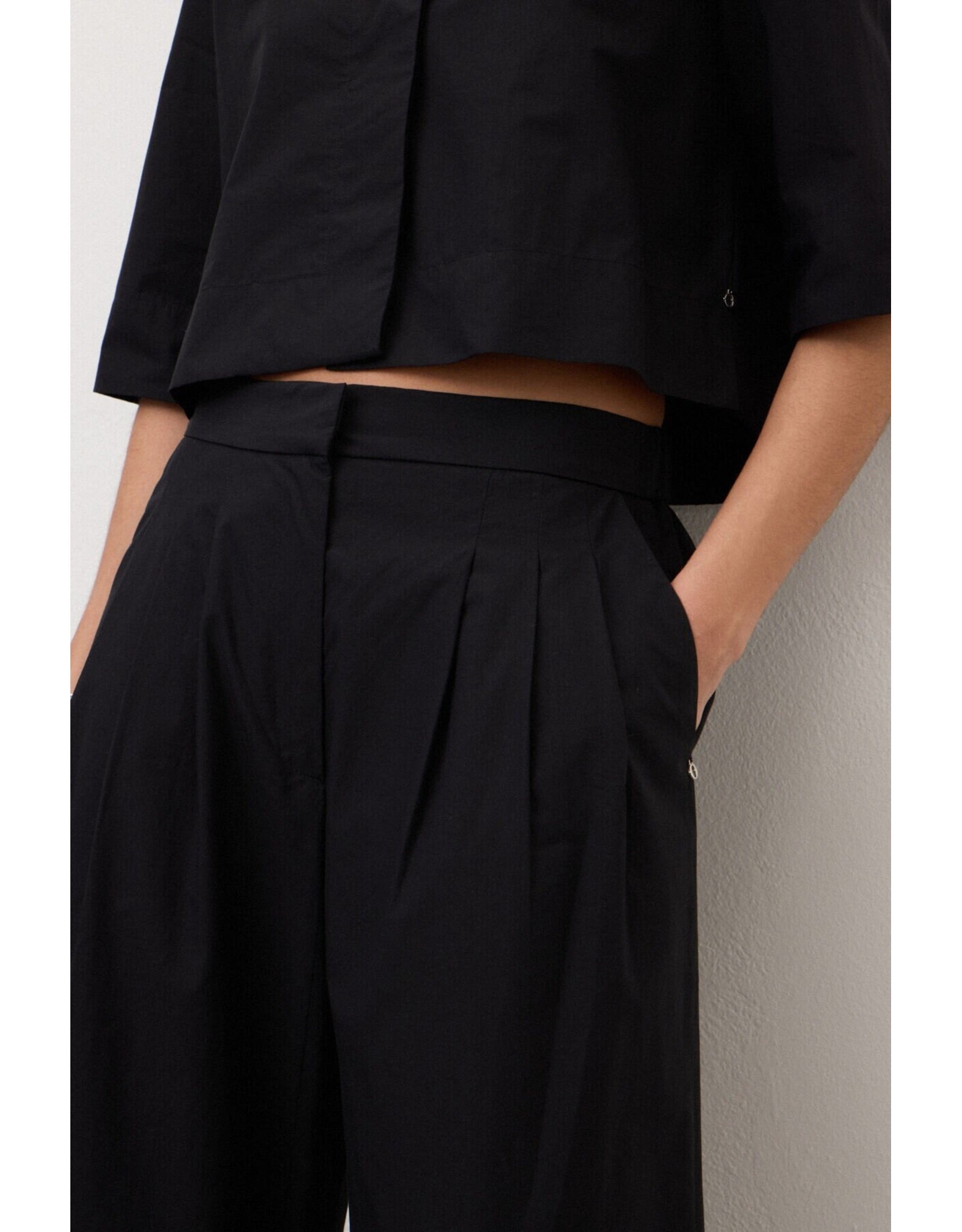Wide-leg poplin trousers with front darts and elasticated back, designed for a balanced and comfortable fit. The wide cut falls straight down the leg, maintaining a clean and tidy aesthetic. A simple style, perfect for everyday looks with a contemporary cut.