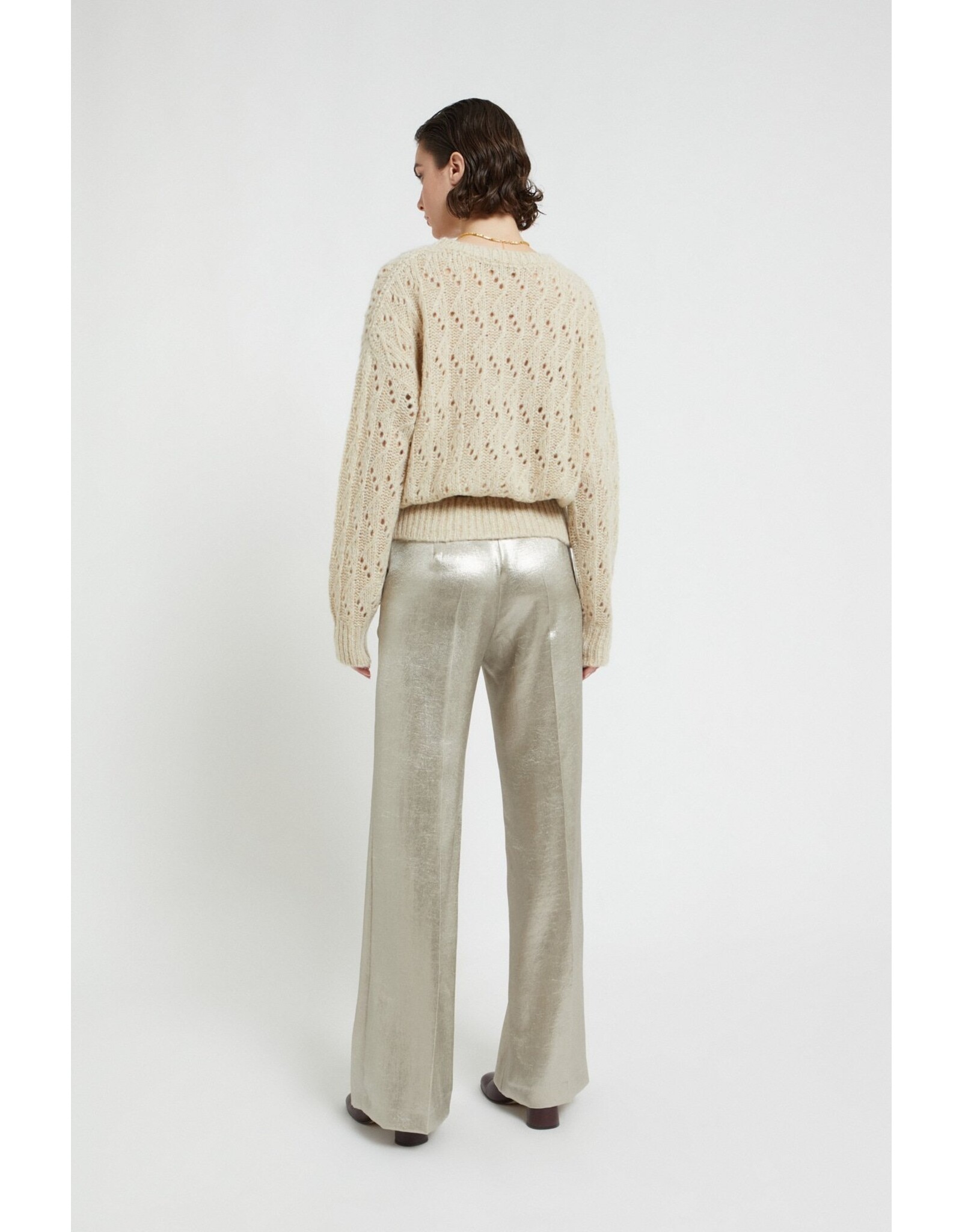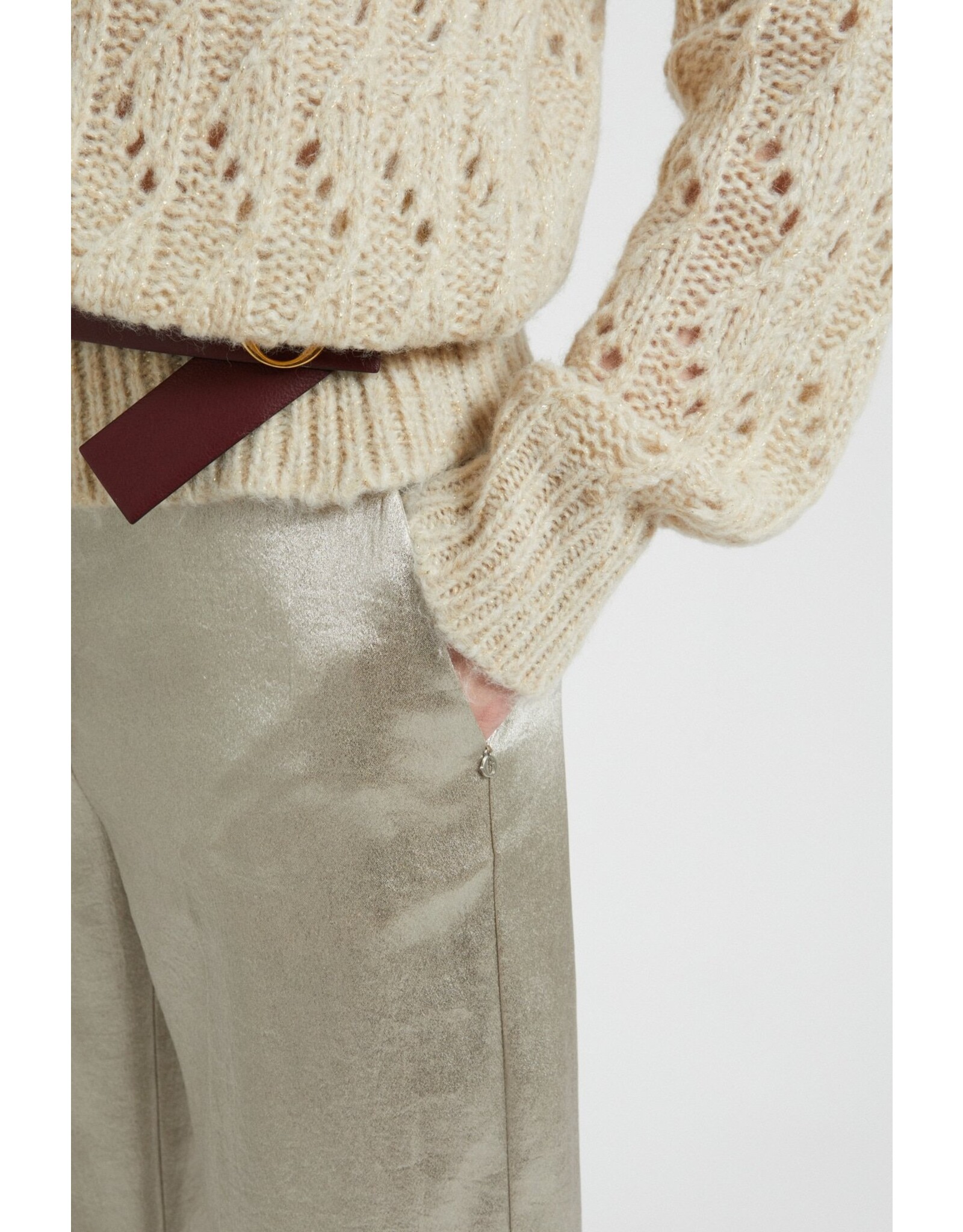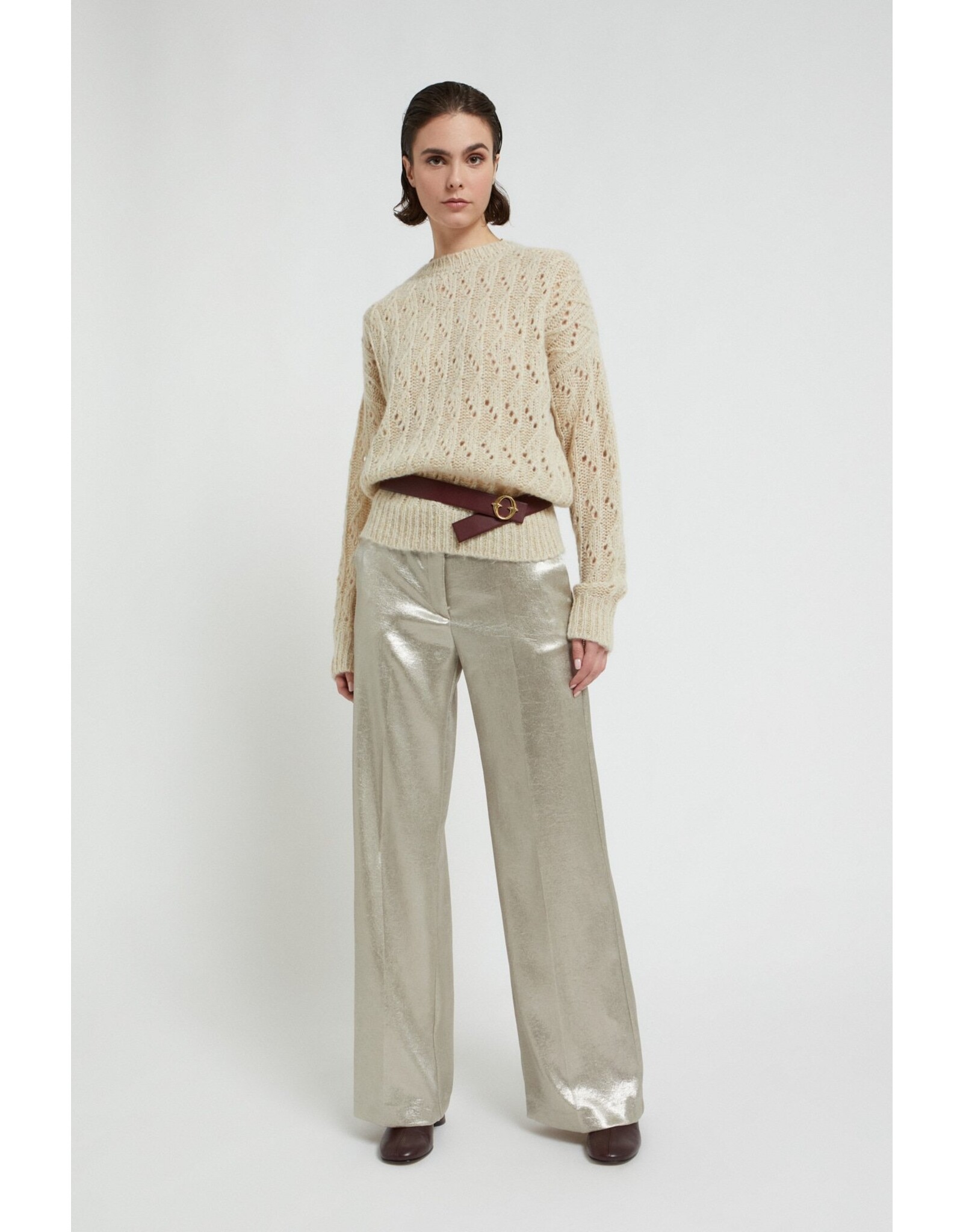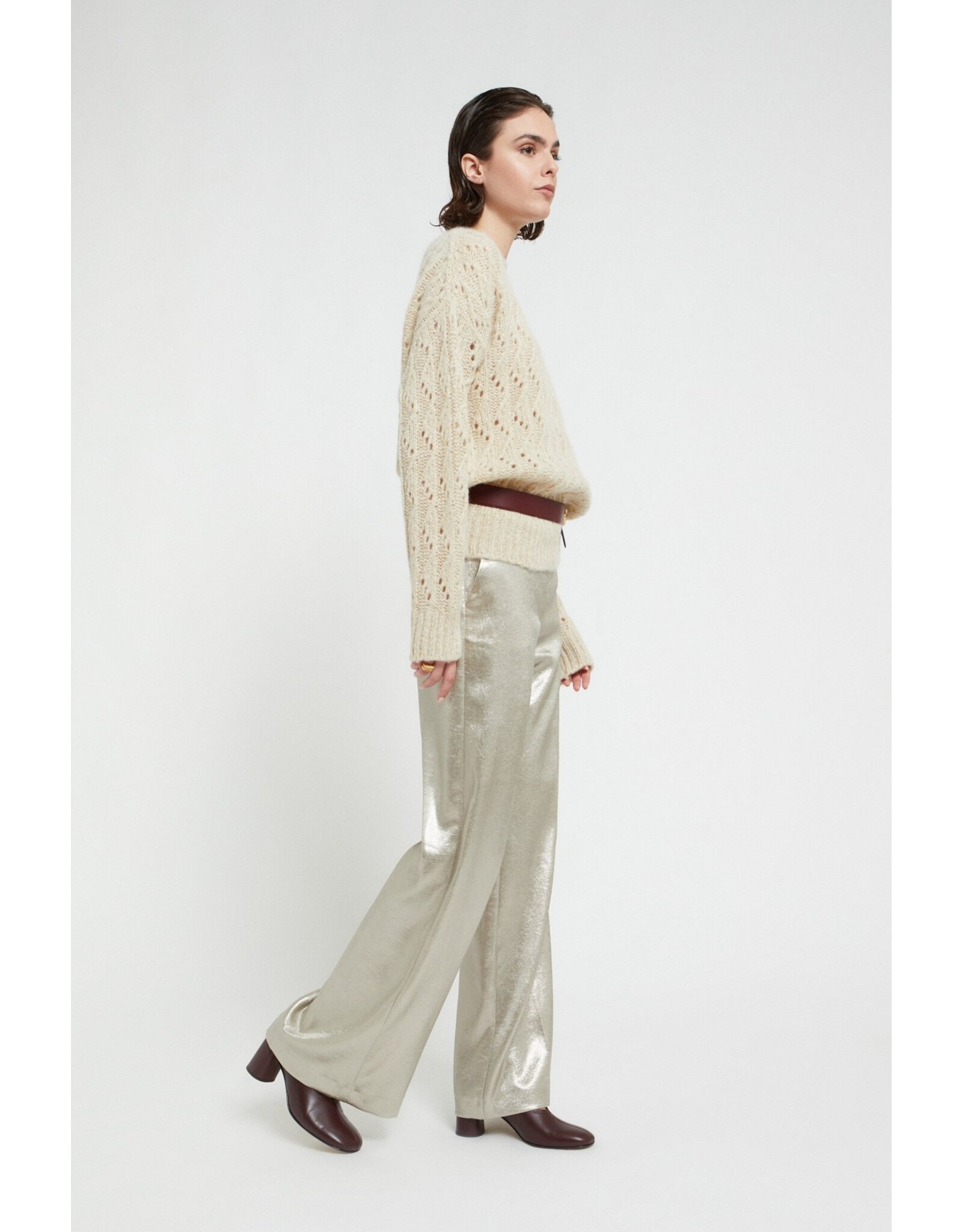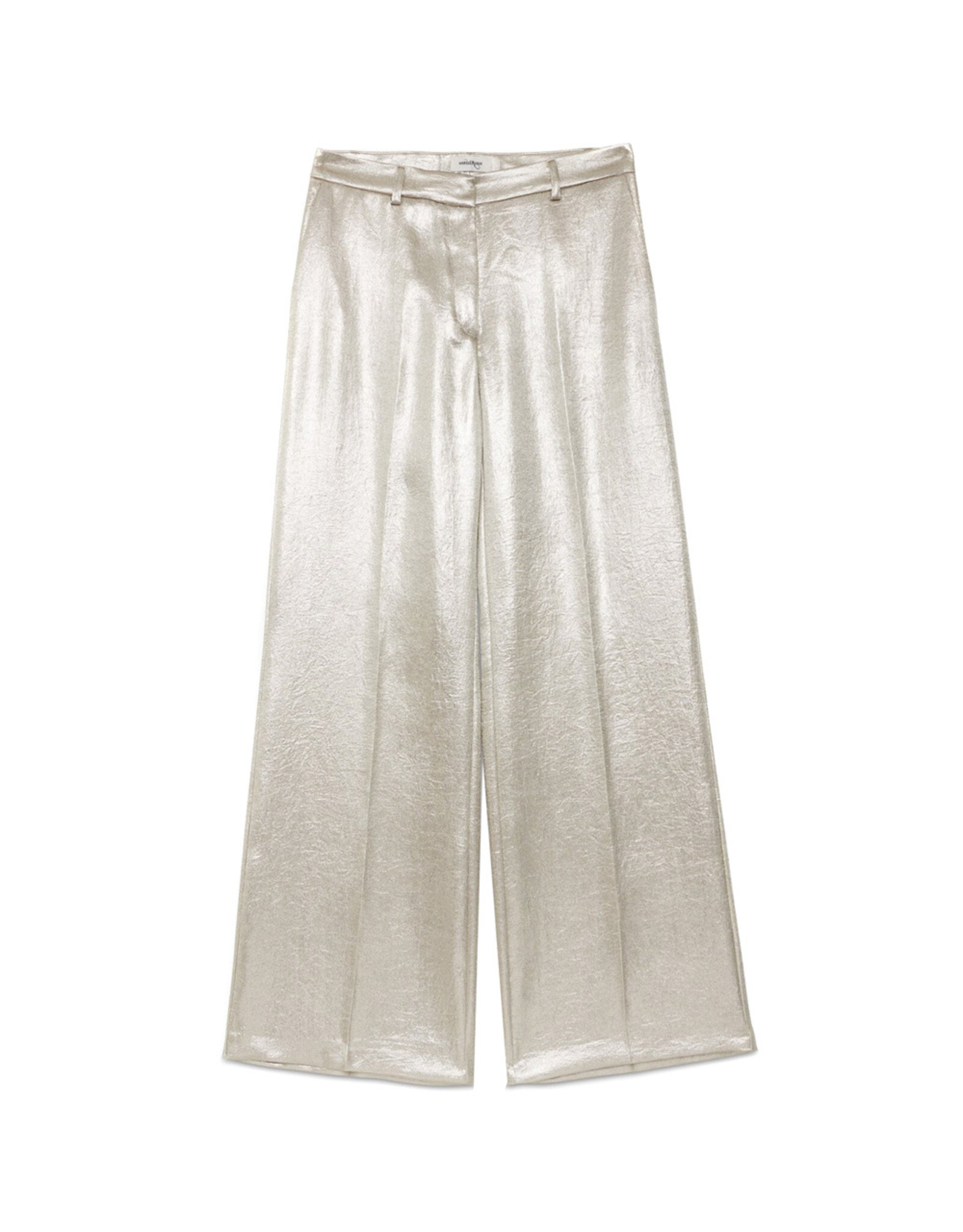 Deze broek met wijde pijpen heeft een opvallende glans en een vloeiende pasvorm. Het ontwerp combineert een zachte stretchstof met een hoge taille voor een moderne en comfortabele look met impact.