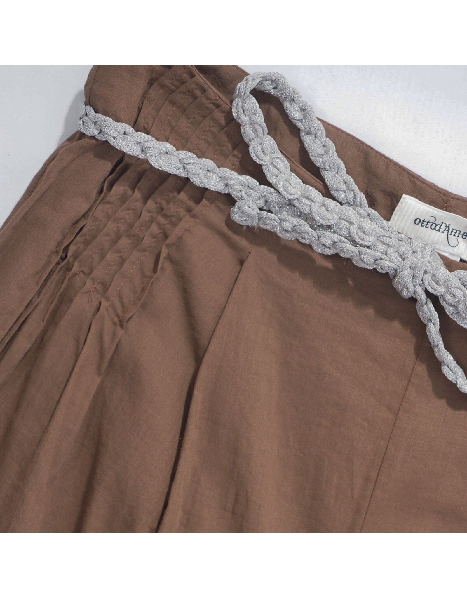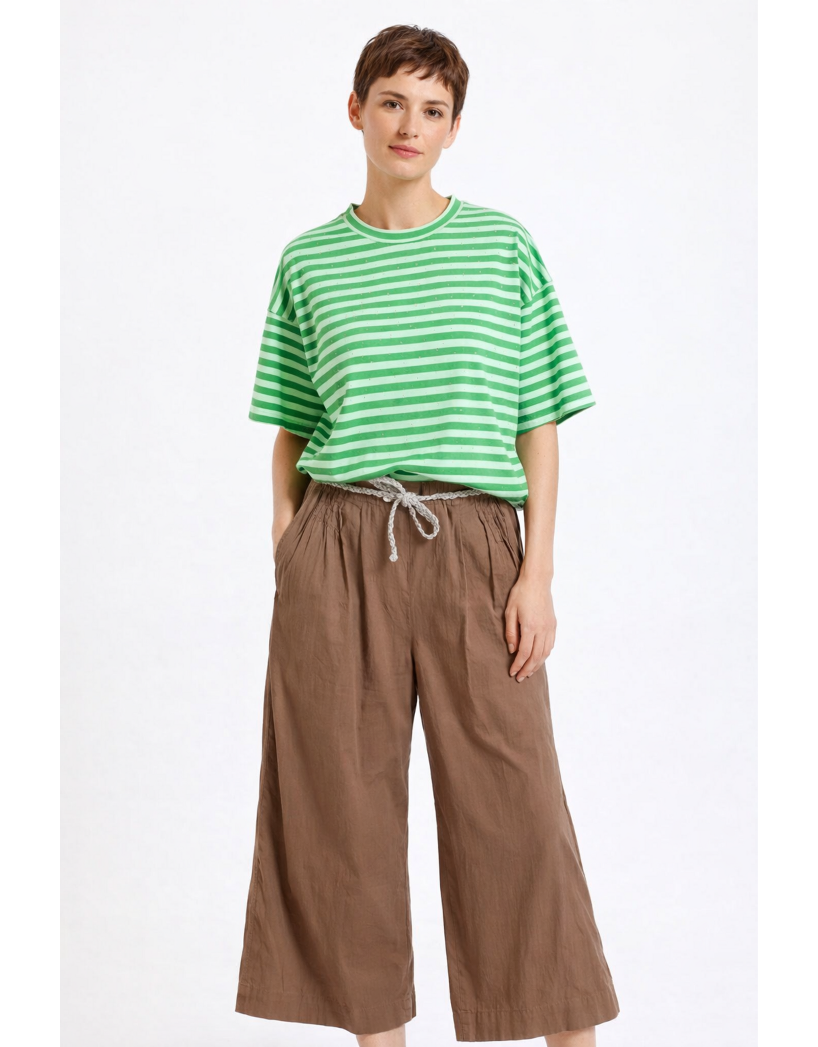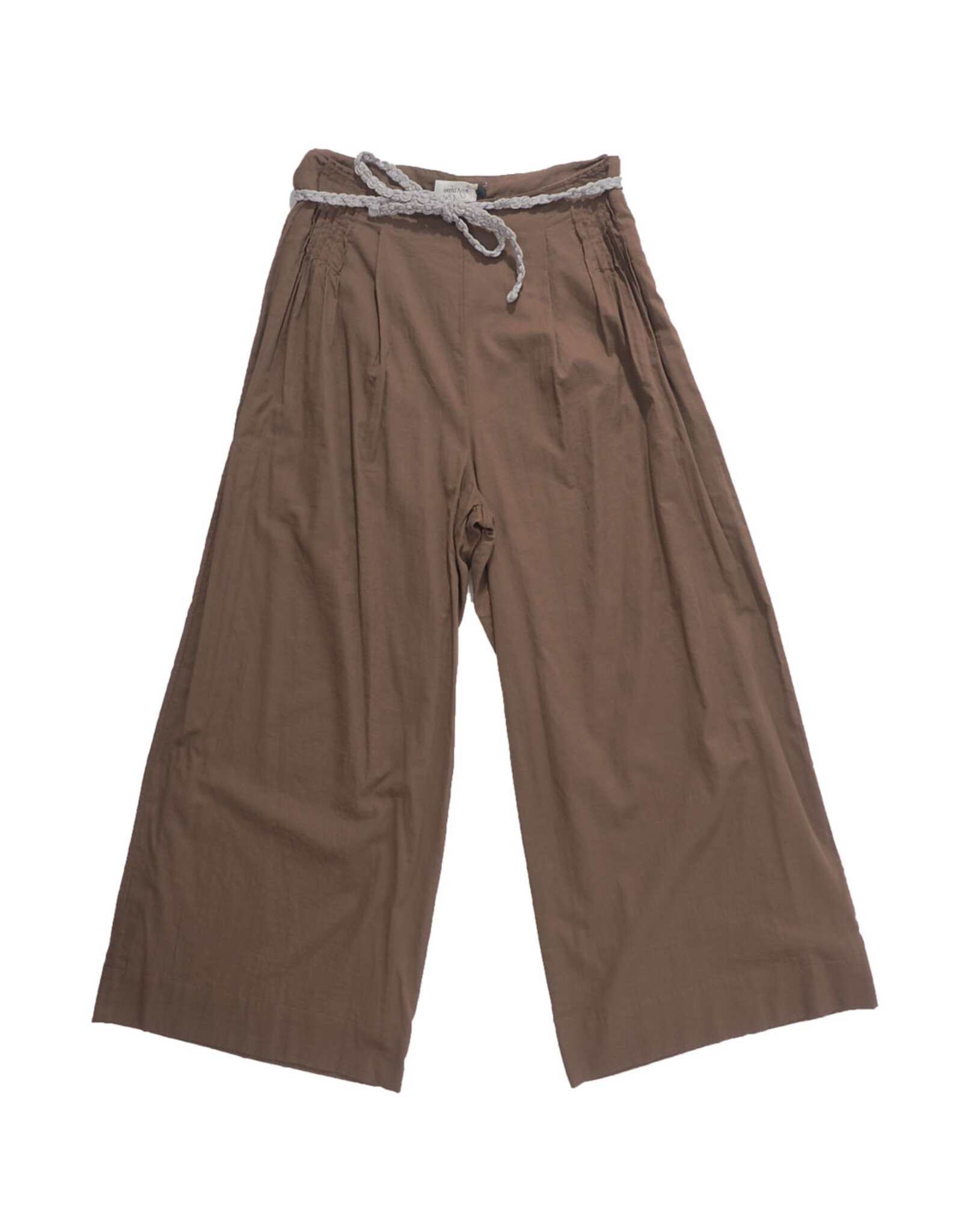 De broek heeft een elastische tailleband met trekkoord, wat zorgt voor een comfortabele en verstelbare fit. De subtiele plooien aan de voorzijde geven extra volume en een speelse, vrouwelijke uitstraling. De warme bruine tint maakt dit een veelzijdig item dat makkelijk te combineren is met zowel lichte als neutrale kleuren.