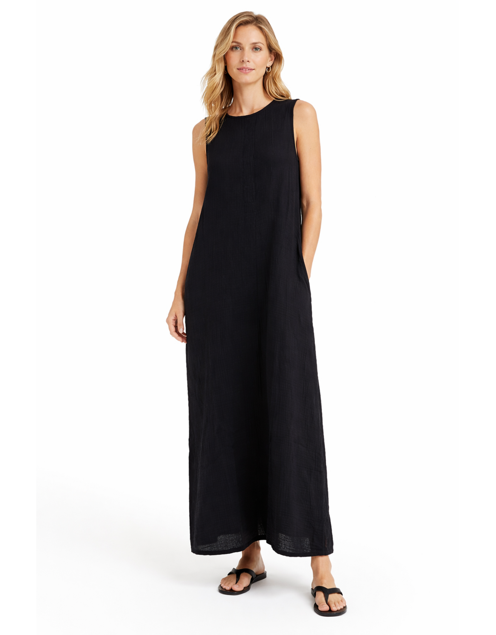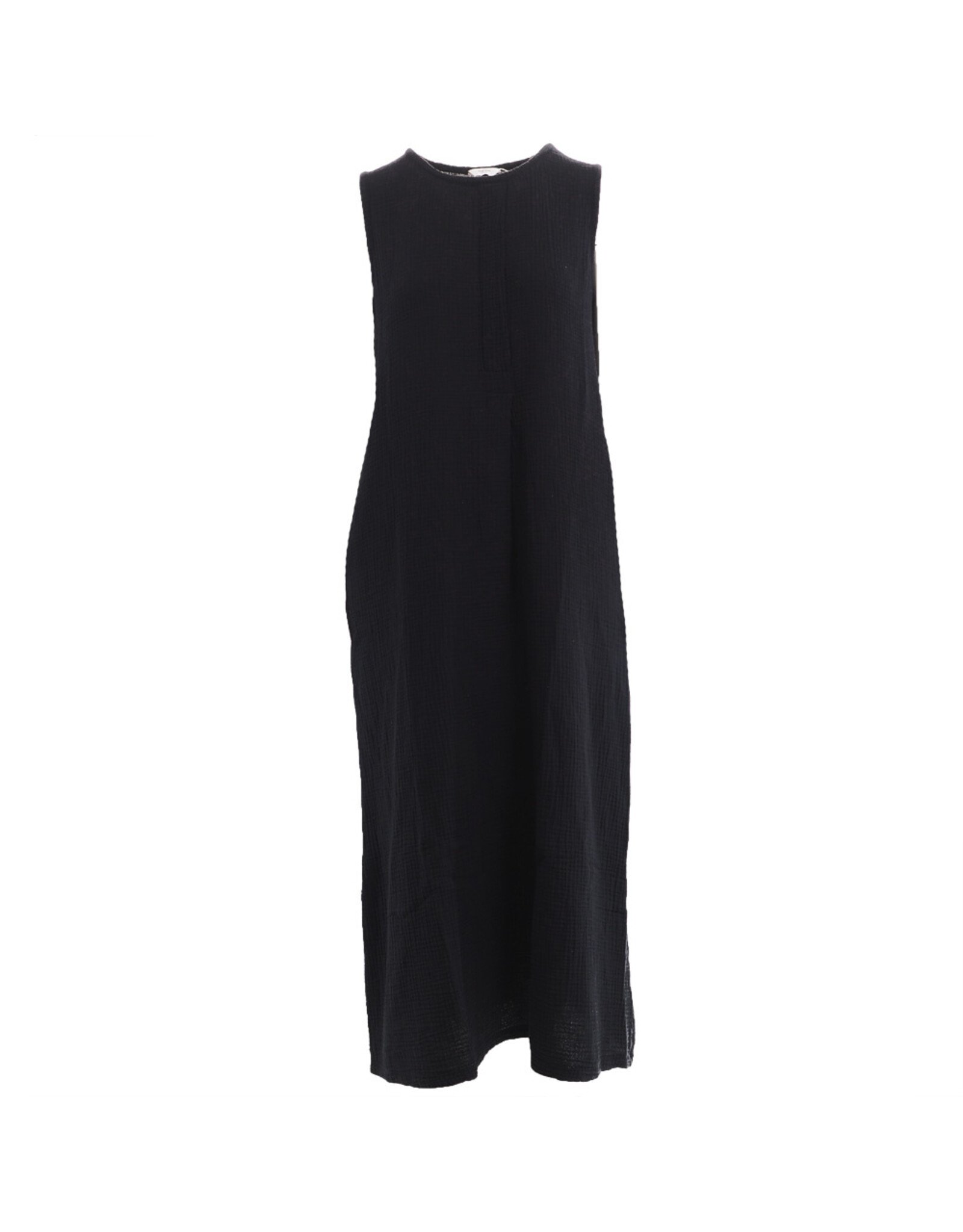 Stijlvolle, lange jurk van PENN&INK N.Y. in een tijdloze zwarte kleur. Deze mouwloze maxi jurk heeft een minimalistisch design met een rechte, losvallende pasvorm en een ronde hals. De lichte structuur in de stof geeft de jurk een casual, maar verfijnde uitstraling.