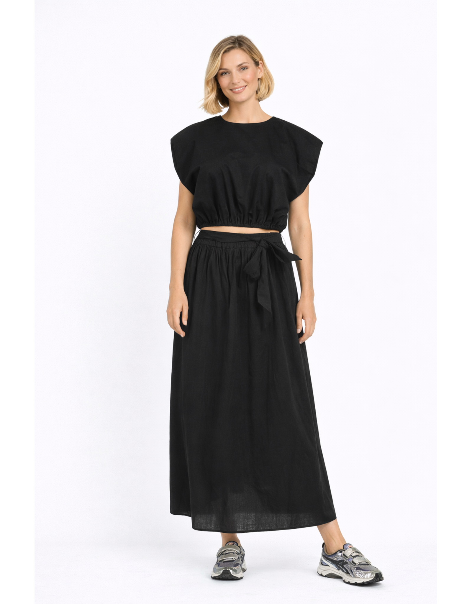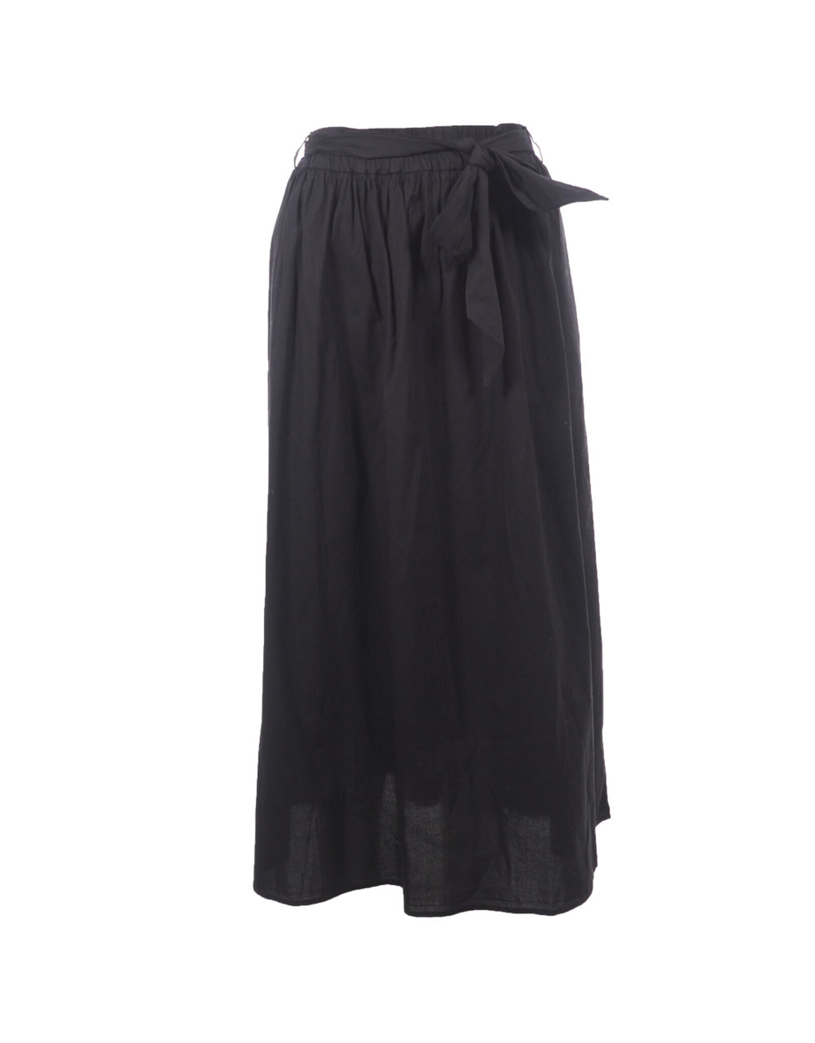Zwarte midi-rok met een elegante, tijdloze uitstraling. De rok heeft een comfortabele elastische tailleband en wordt geaccentueerd met een strikceintuur voor een vrouwelijke touch. De soepel vallende stof zorgt voor een luchtig en flatterend silhouet, terwijl de lengte tot halverwege de kuit een veelzijdige styling mogelijk maakt – zowel casual als gekleed.