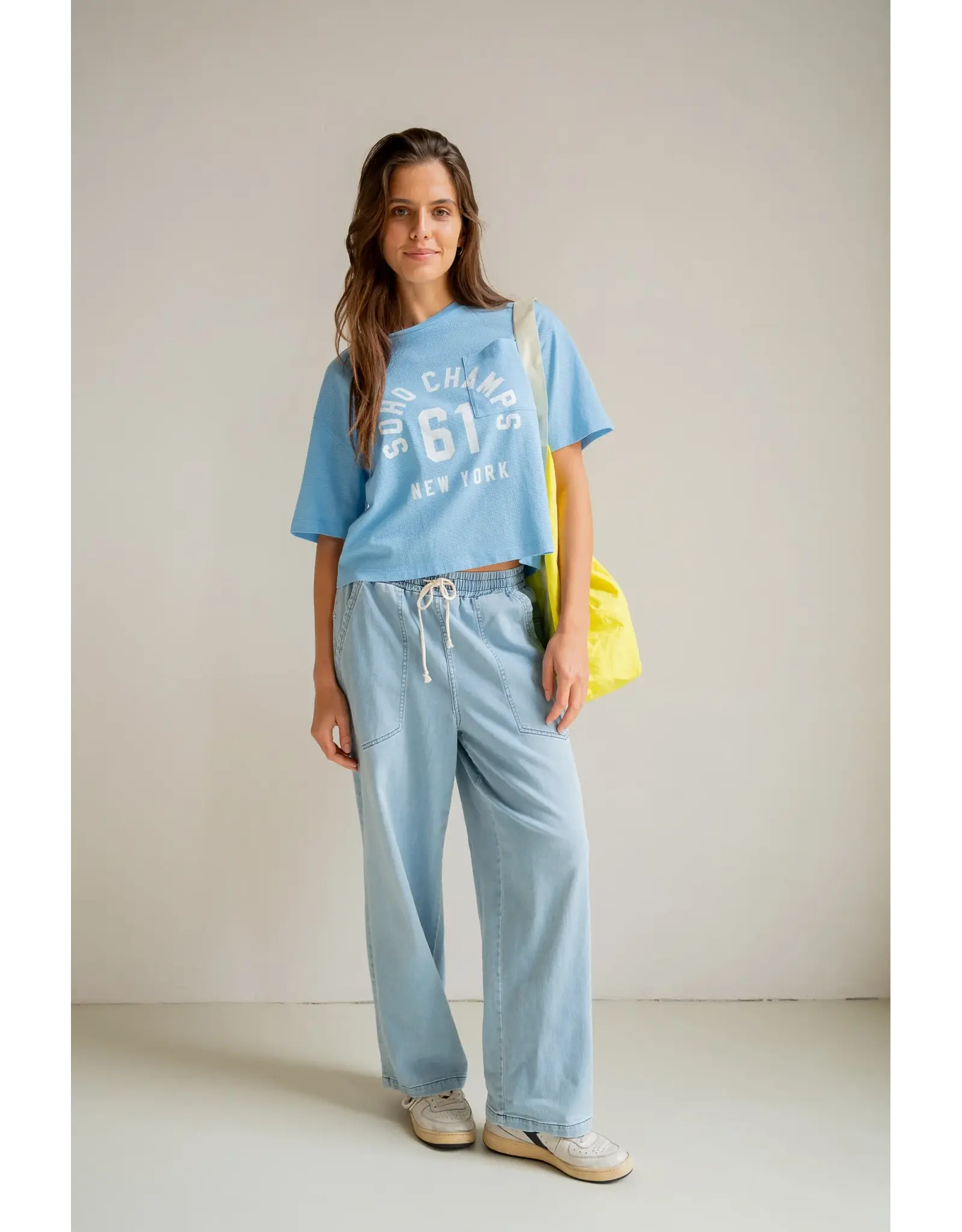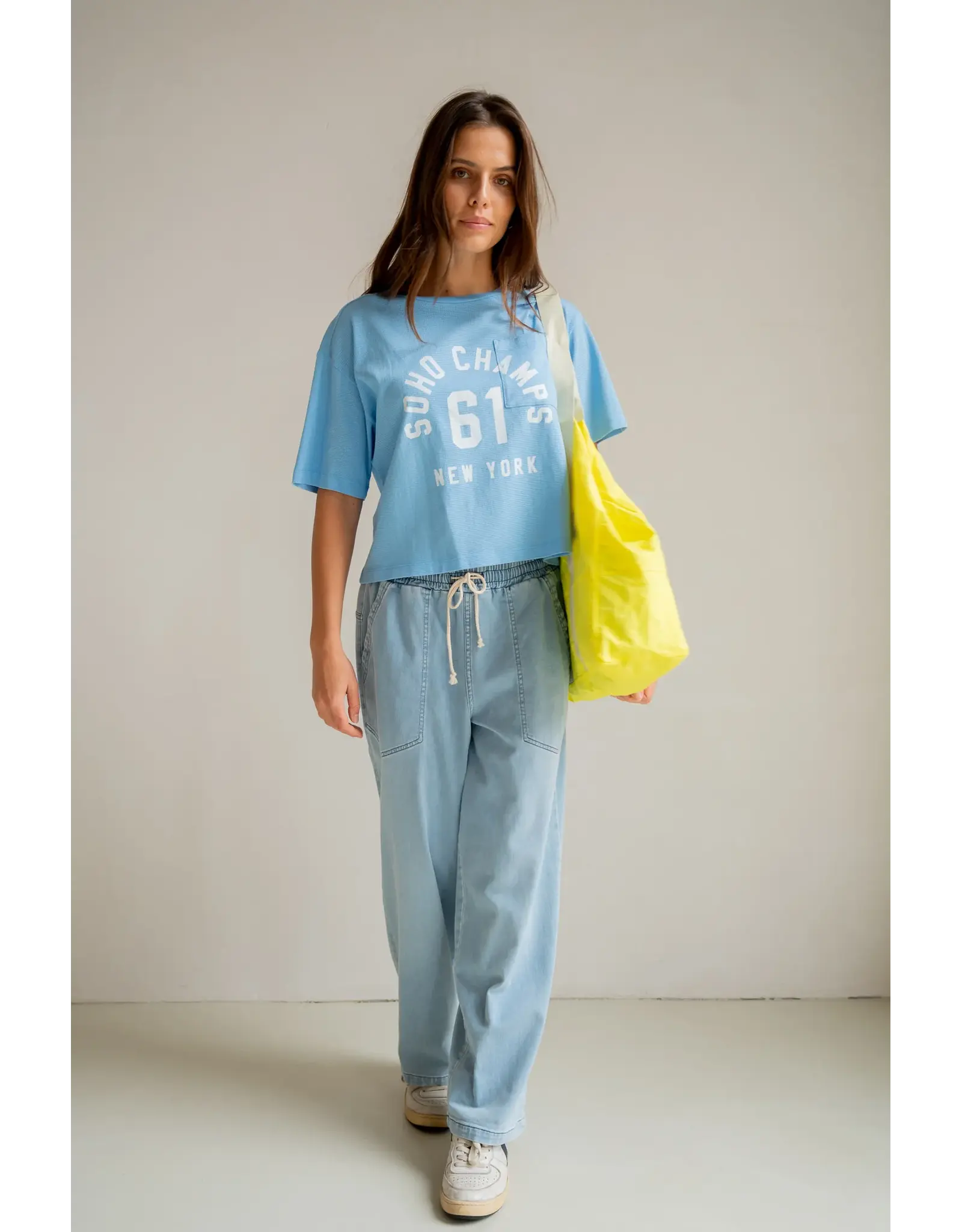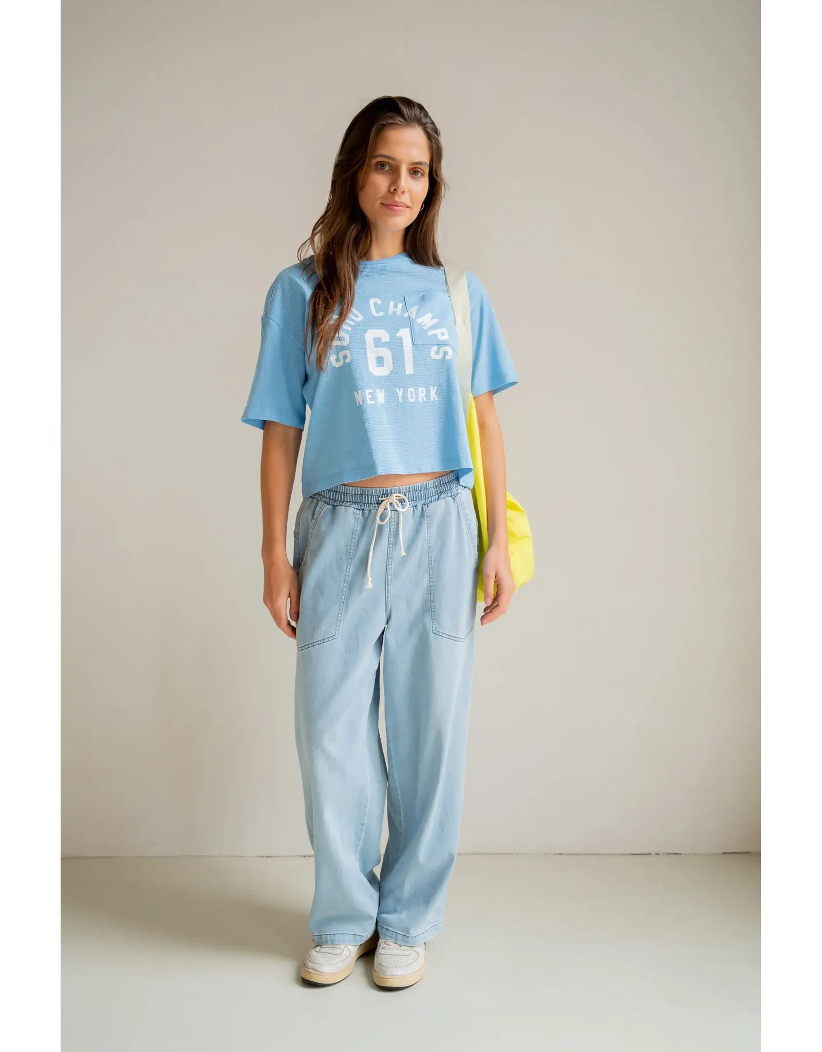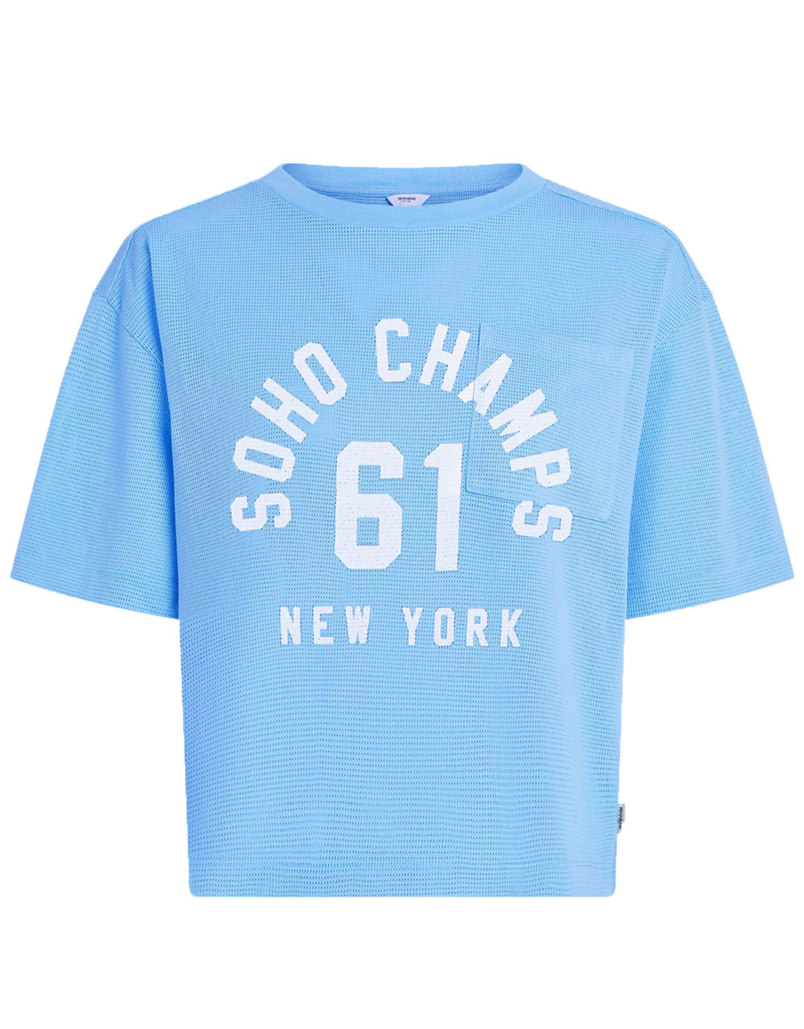 A sporty essential with a relaxed, modern feel. This lightweight T-shirt features a breathable textured fabric and a bold varsity-inspired print, combining casual comfort with an effortless statement look. Perfect for everyday wear with a contemporary edge.
